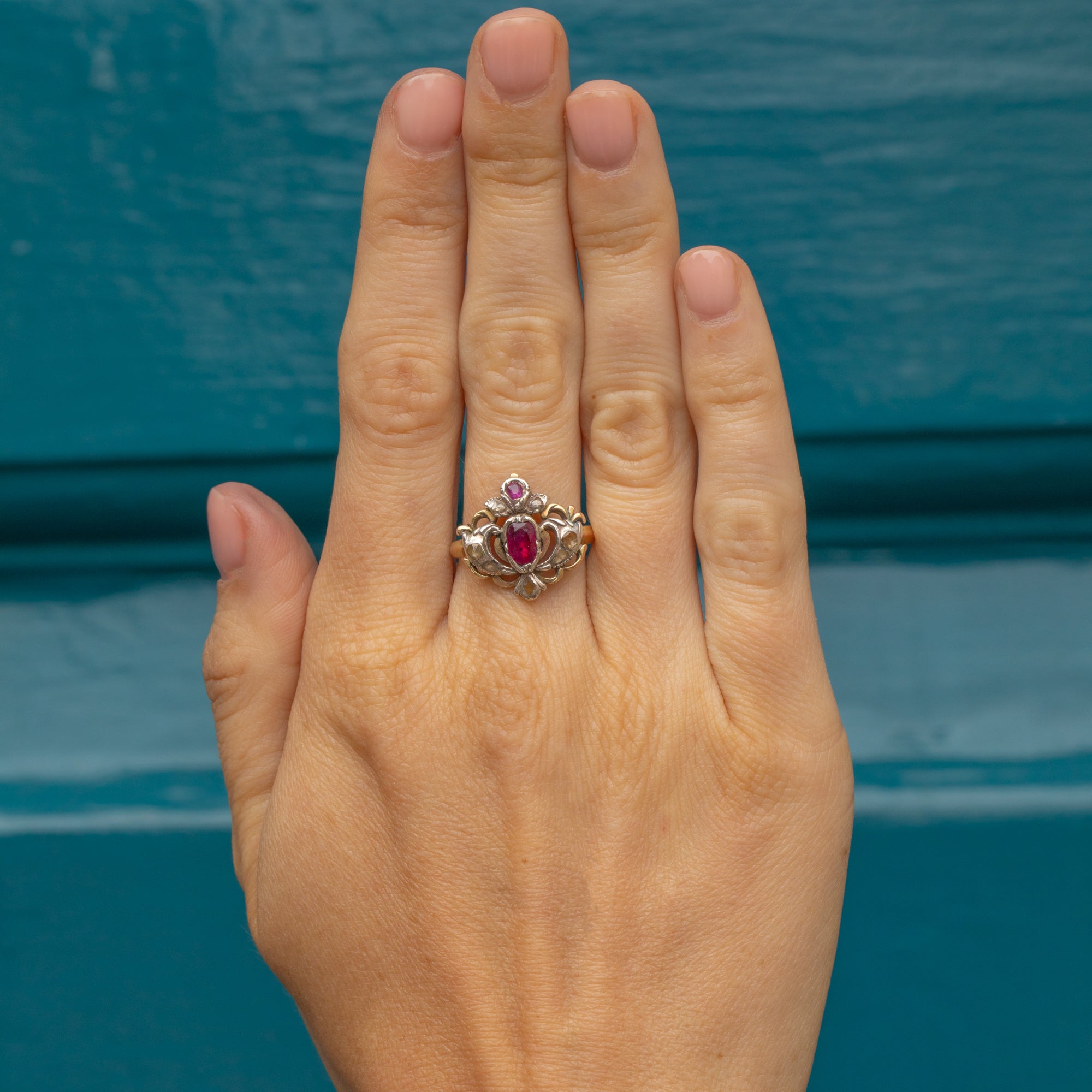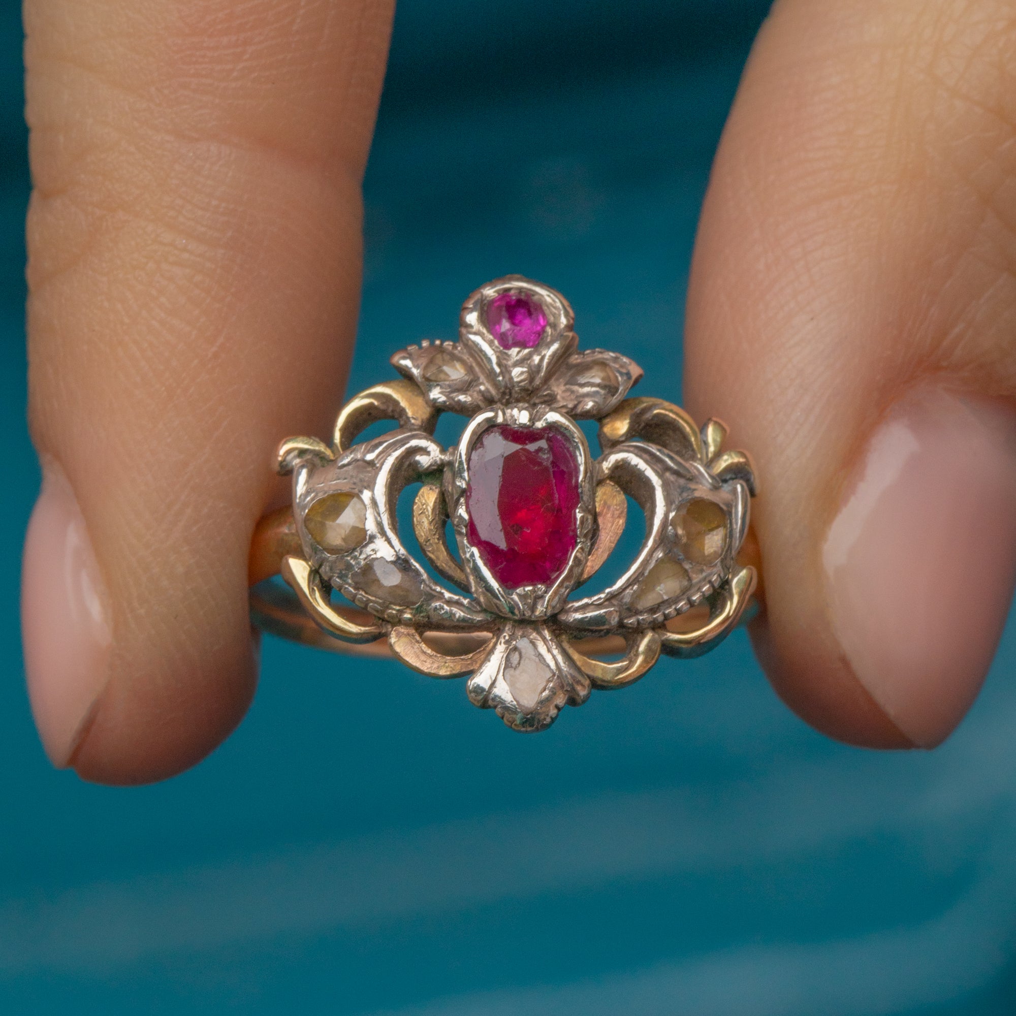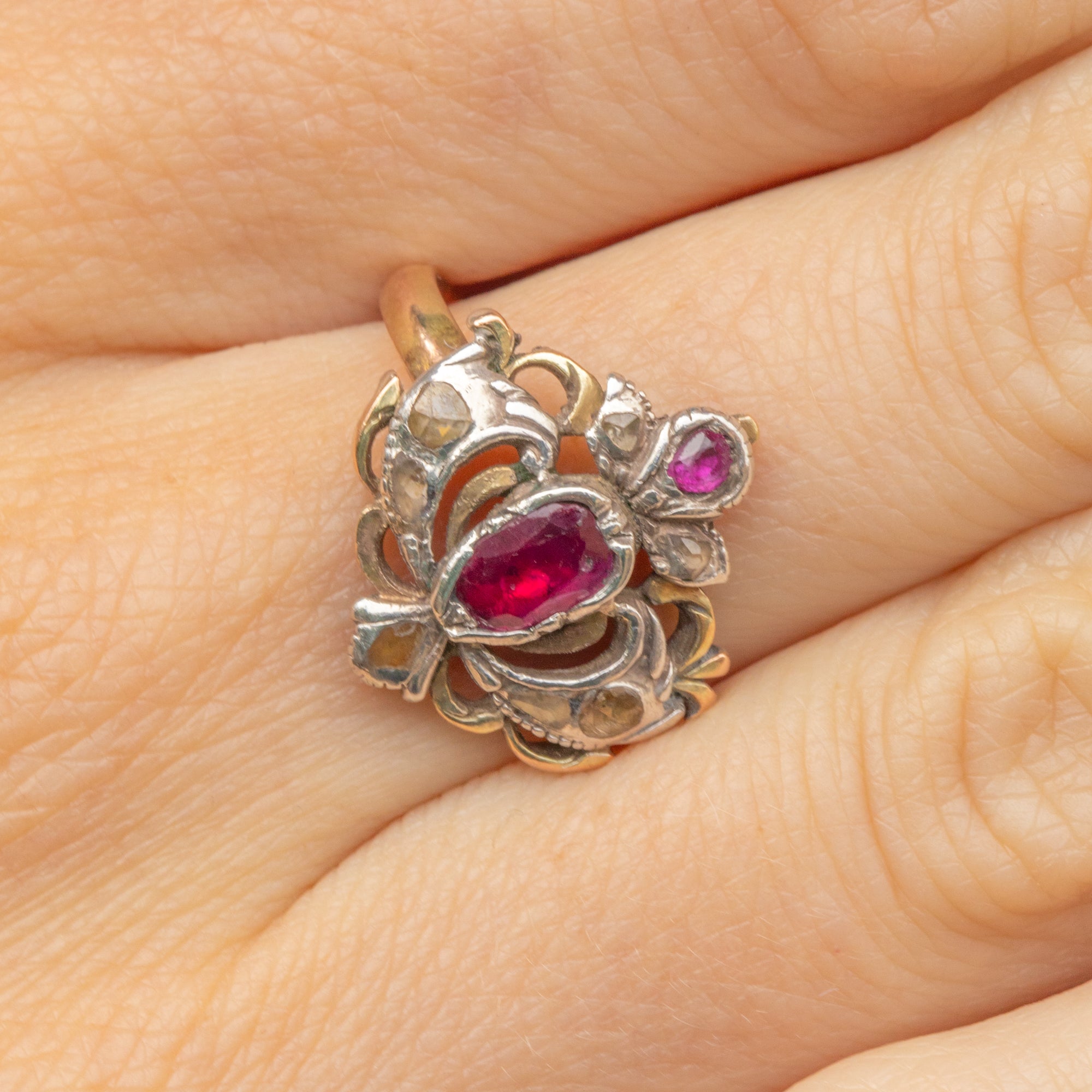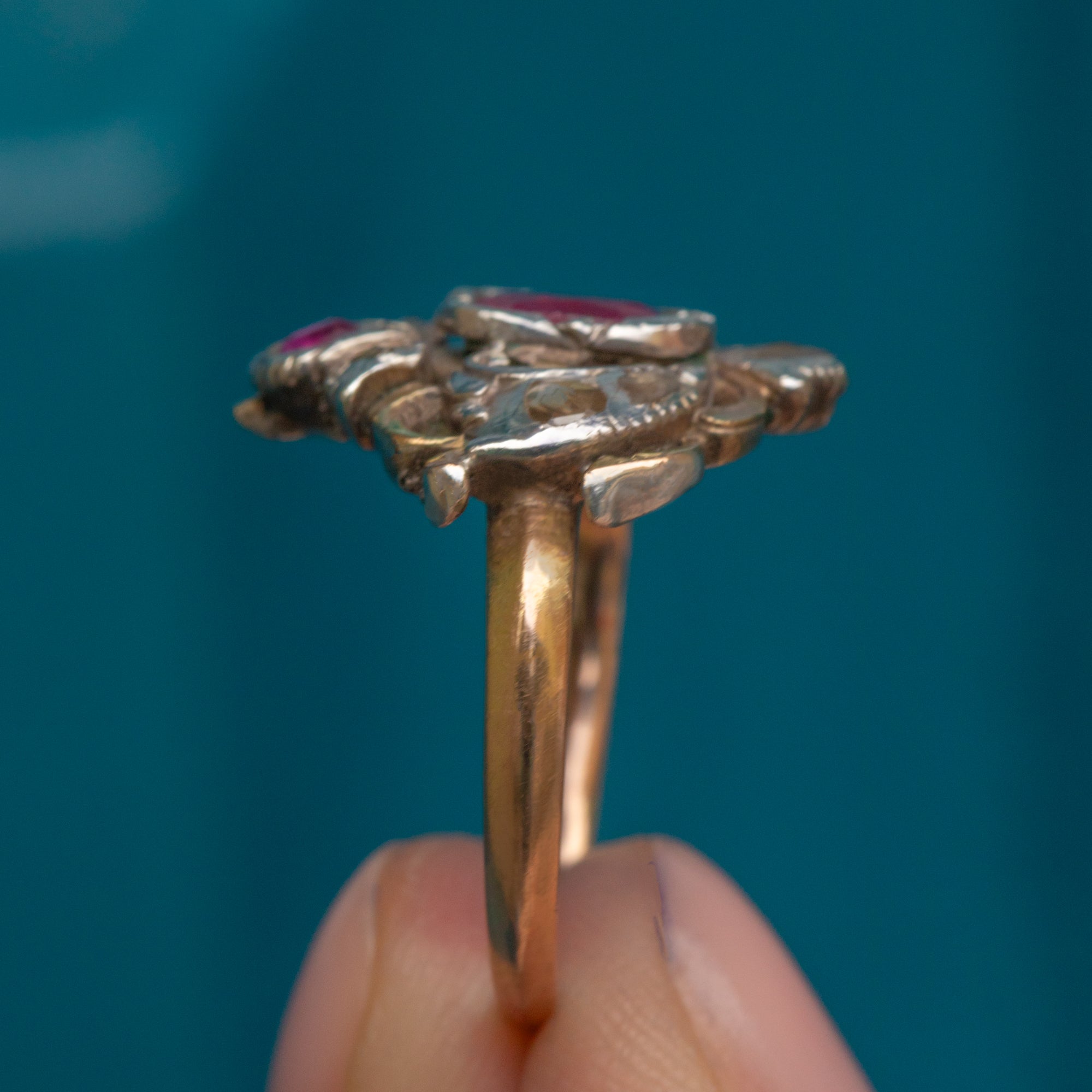 An exquisite Georgian Ruby Diamond Giardinetti ring! Super rare, this Gold ring is over 260 years old, but has retained all of her charm and splendour.