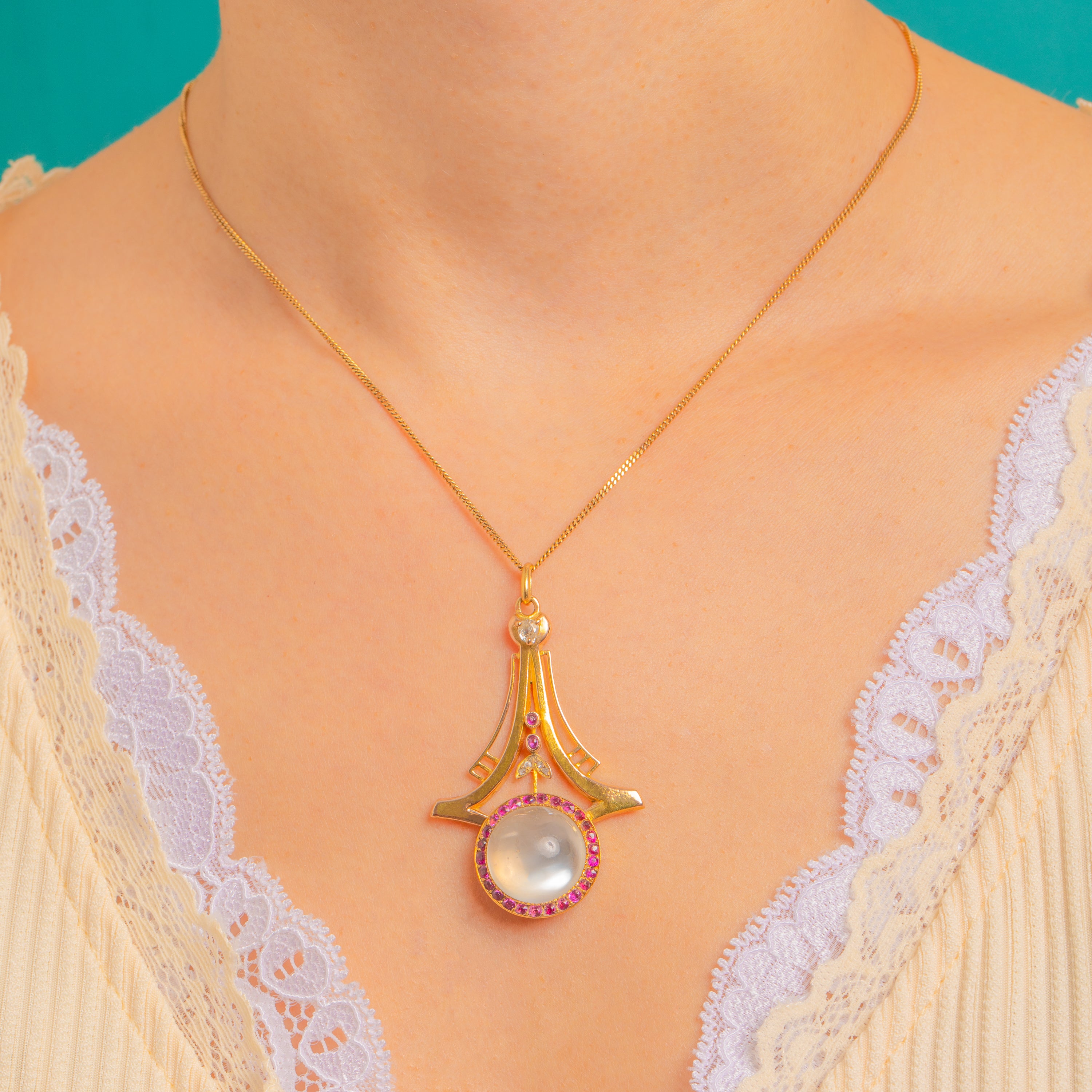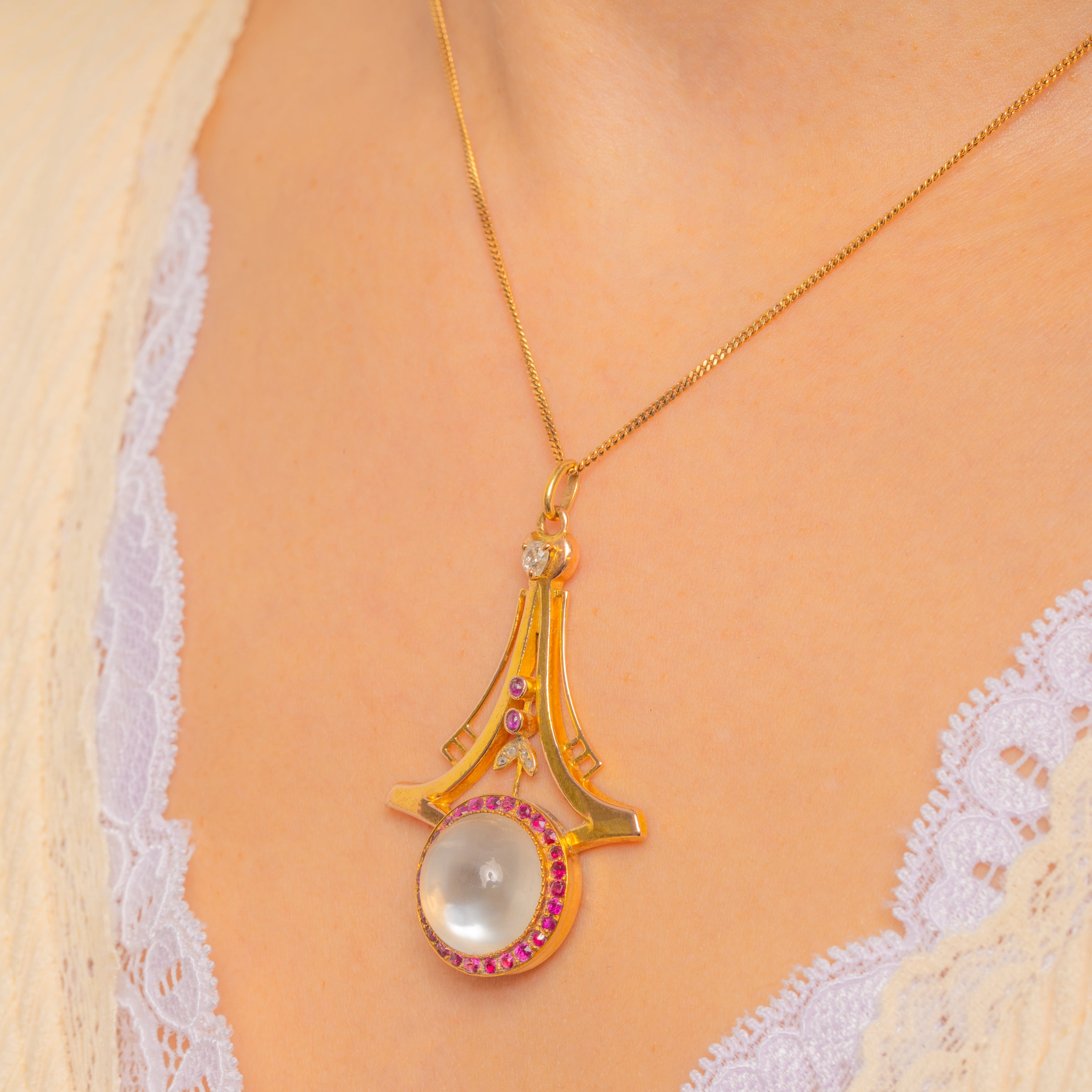 A luminous Moonstone takes centre stage in this elegant Art Deco pendant, its dreamy 10.00ct cabochon glowing within an architectural openwork frame of richly hued 14ct Gold. A vivid Ruby halo (0.80ct total) traces the round bezel, while sparkling Diamond accents dance above — including a sweet heart-shaped Diamond — lending a decadent, jewel-encrusted finish.