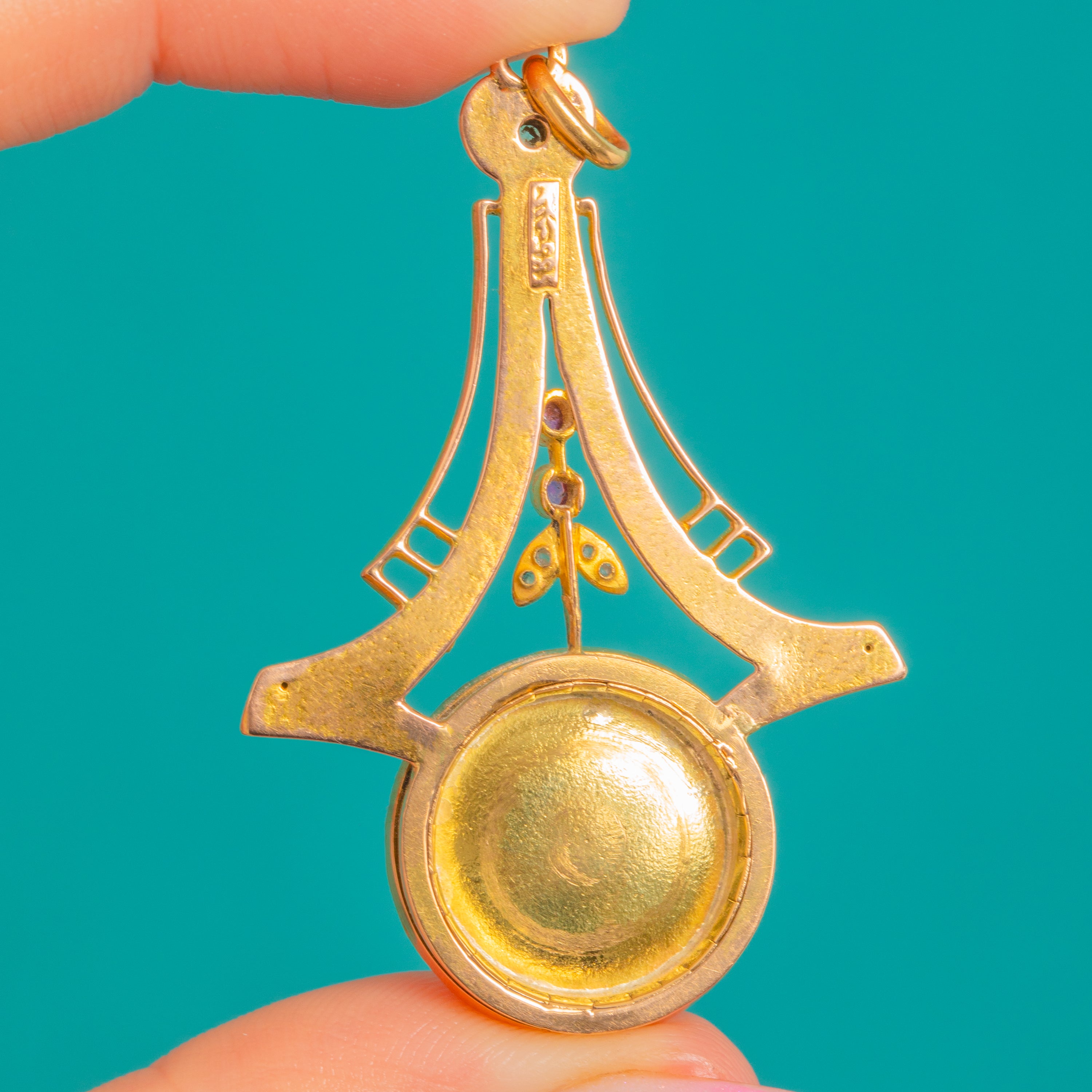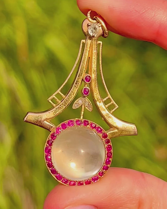 Rare Jugendstil 14ct Gold Moonstone Ruby Diamond Target Pendant
