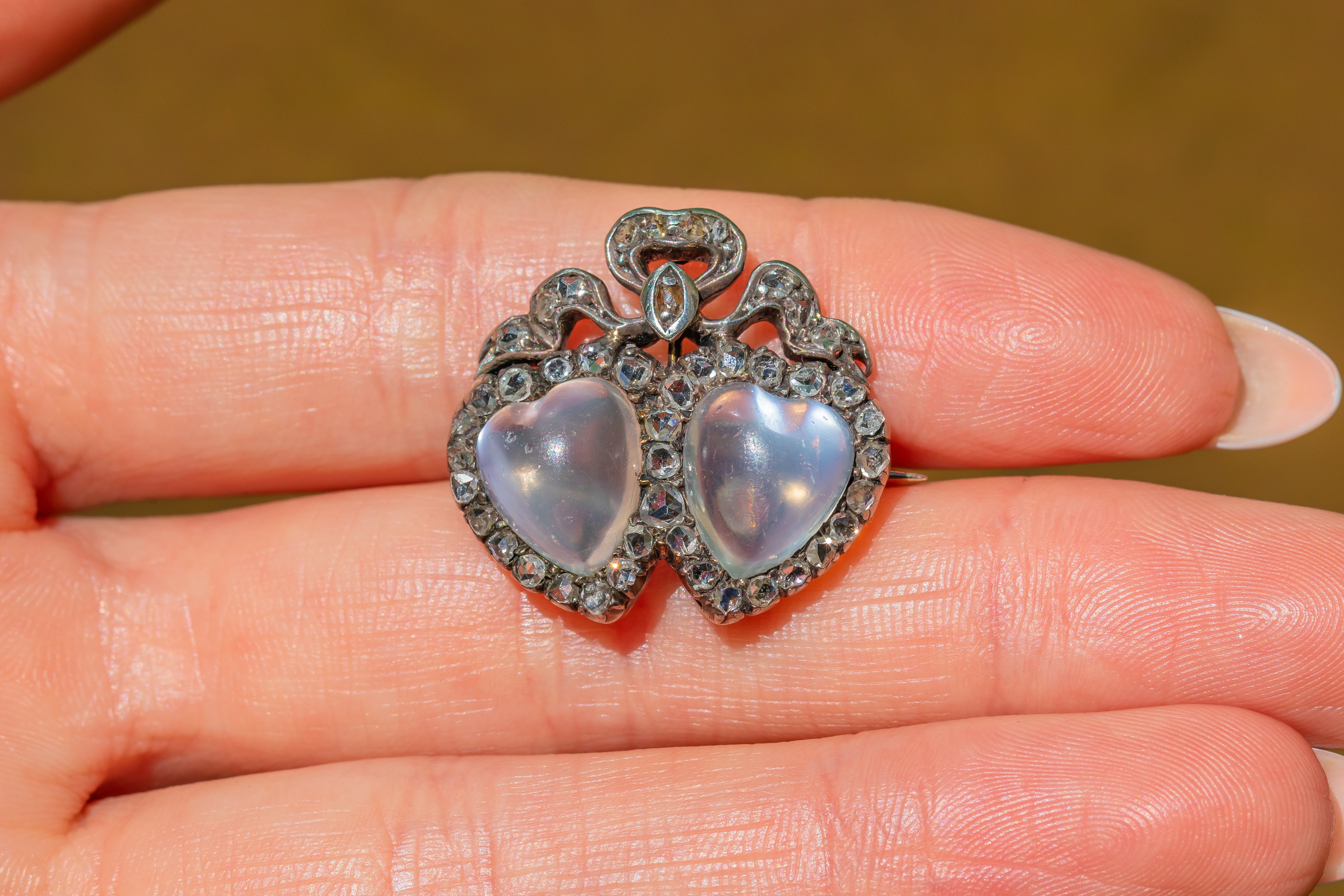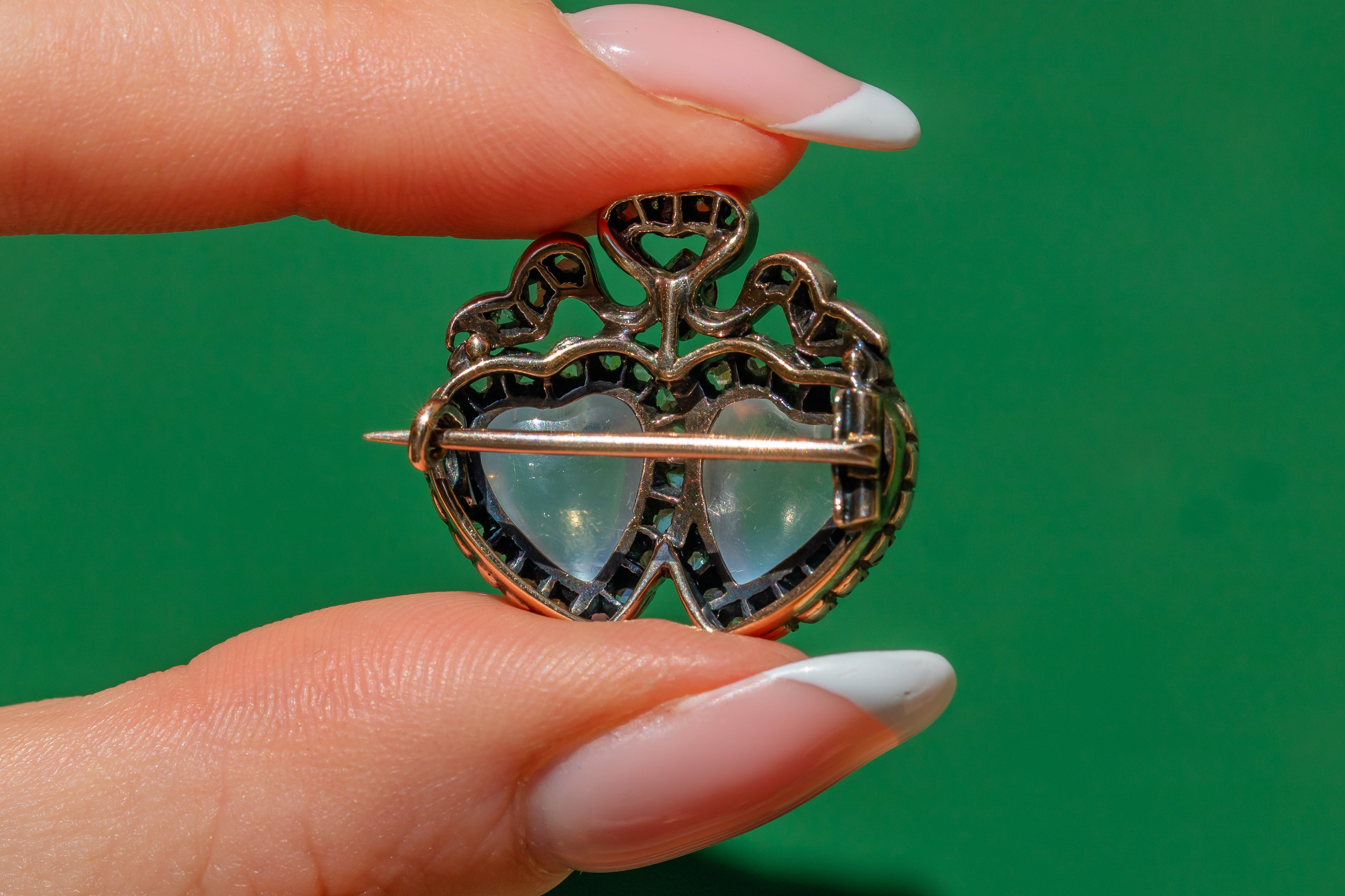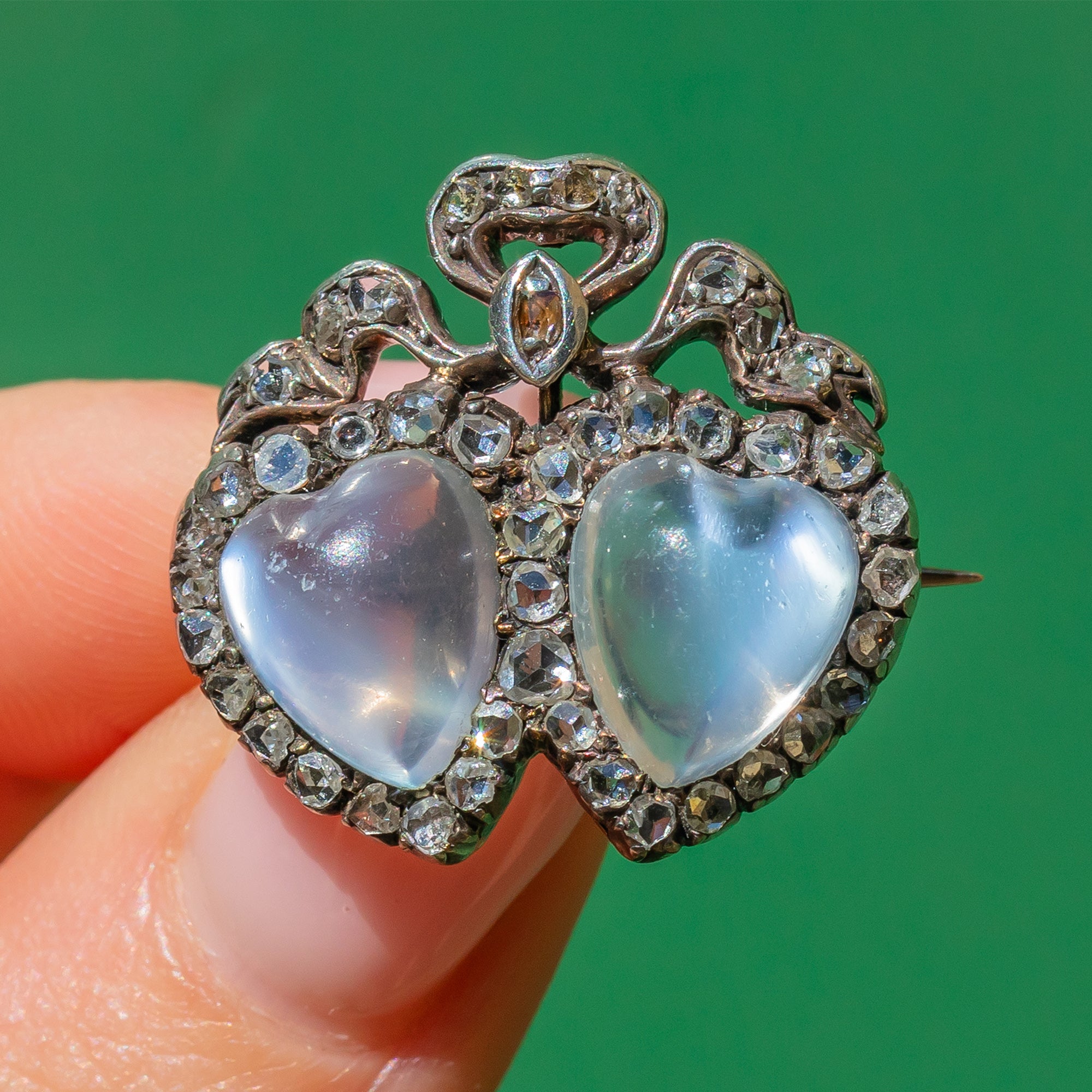 Inlaid with a 45 ravishing rose cut Diamonds, this exquisite Victorian beauty features two hand carved heart Moonstones nestled snugly together, which makes us think of a budding romance between two lovers! Hearts were a much loved symbol of the Victorian's, so this brooch is a fantastic way to connect yourself with that era, whilst boasting a splendid piece on the lapel of your blazer.