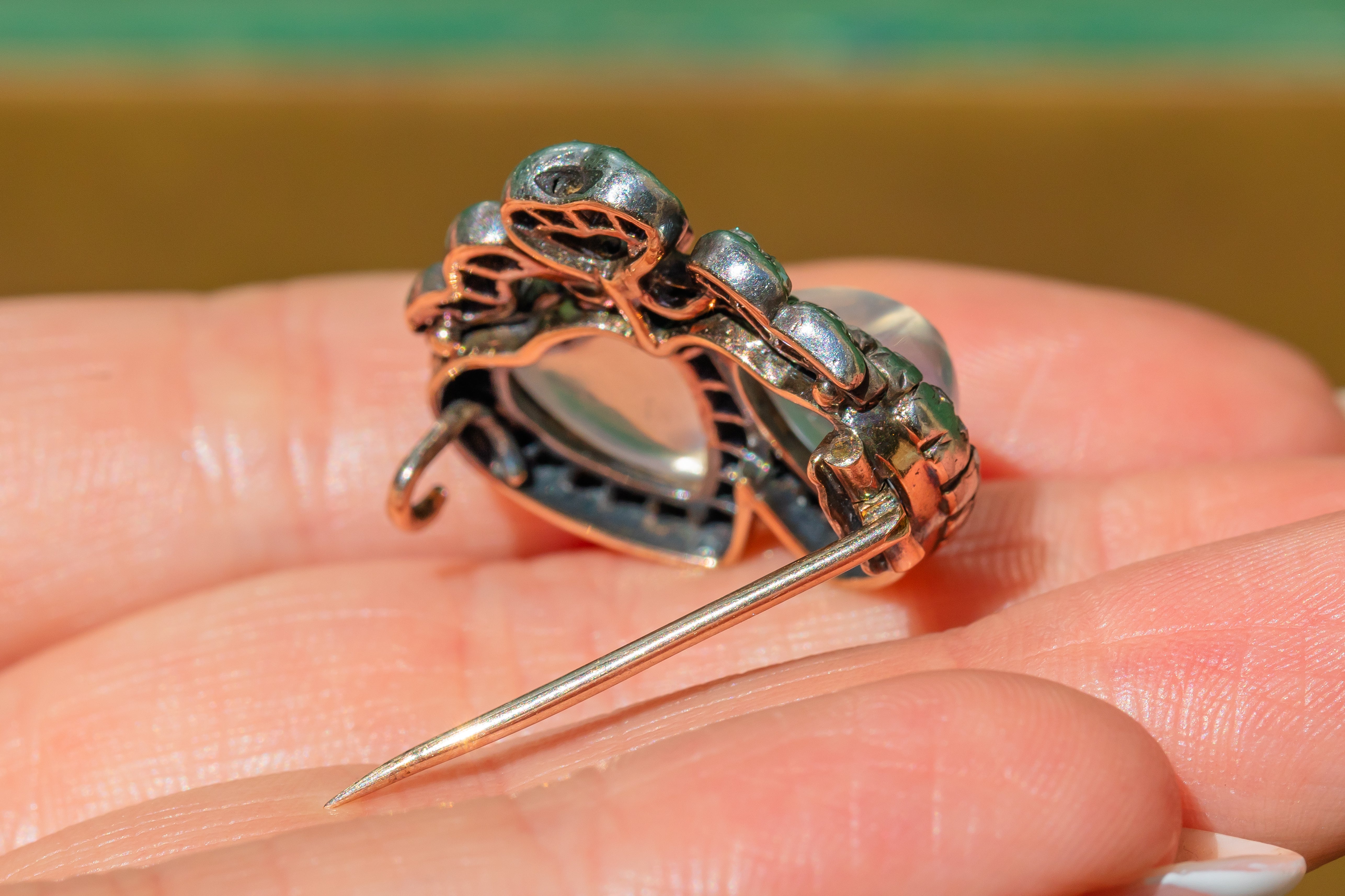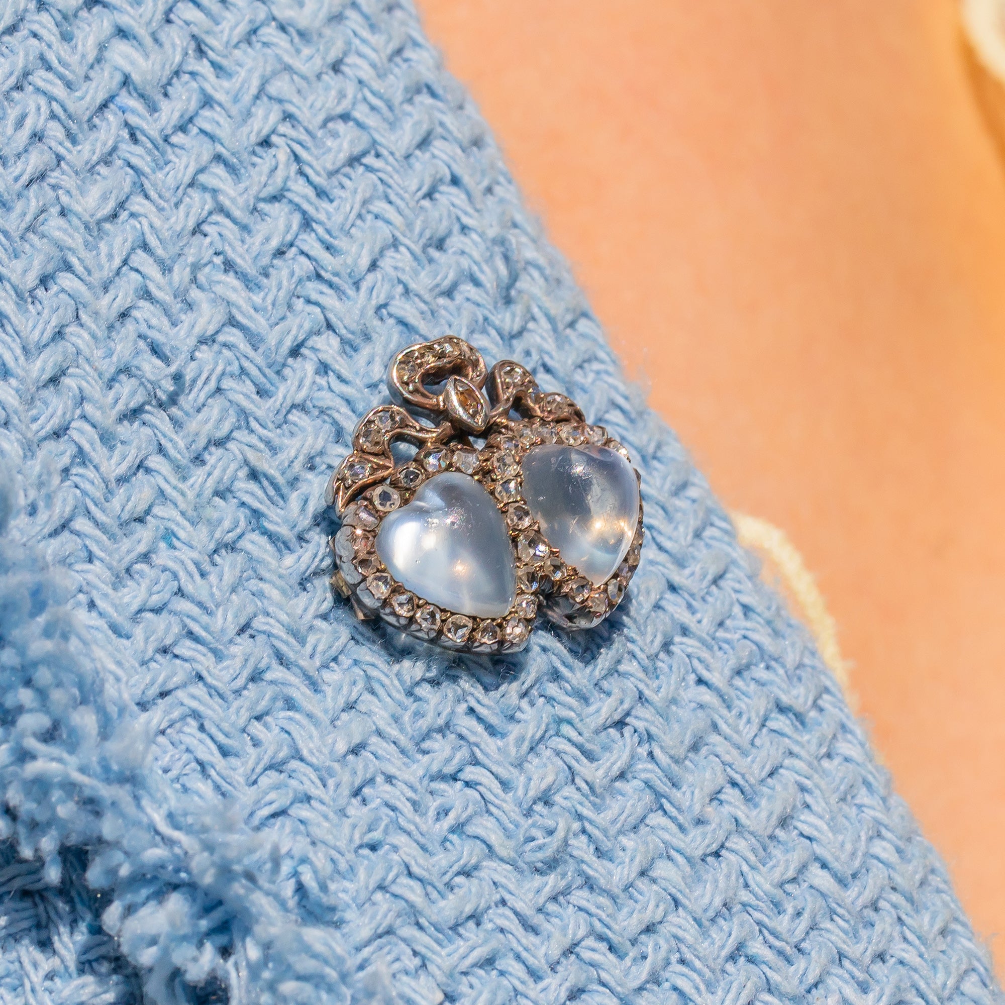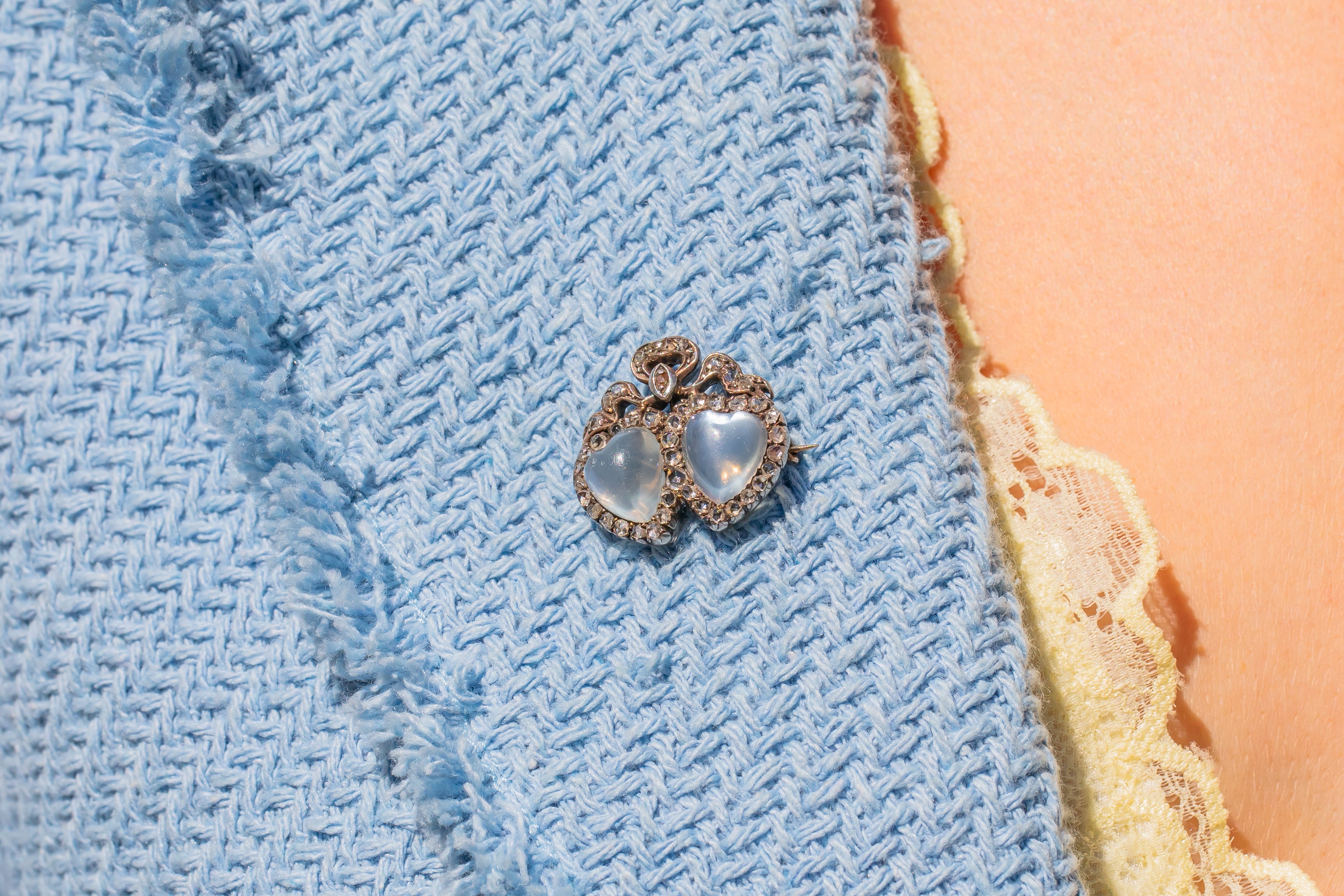 Inlaid with a 45 ravishing rose cut Diamonds, this exquisite Victorian beauty features two hand carved heart Moonstones nestled snugly together, which makes us think of a budding romance between two lovers! Hearts were a much loved symbol of the Victorian's, so this brooch is a fantastic way to connect yourself with that era, whilst boasting a splendid piece on the lapel of your blazer.