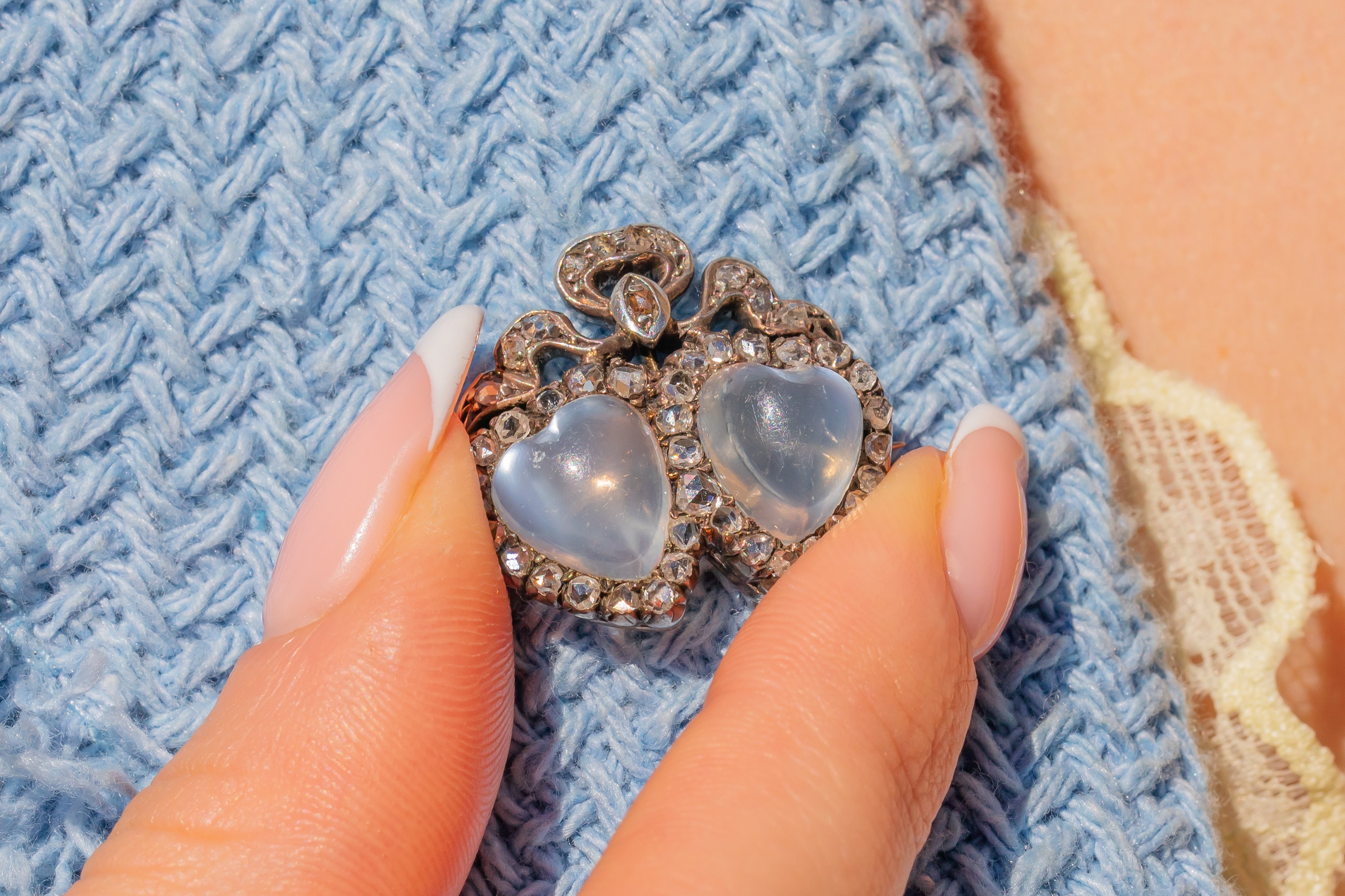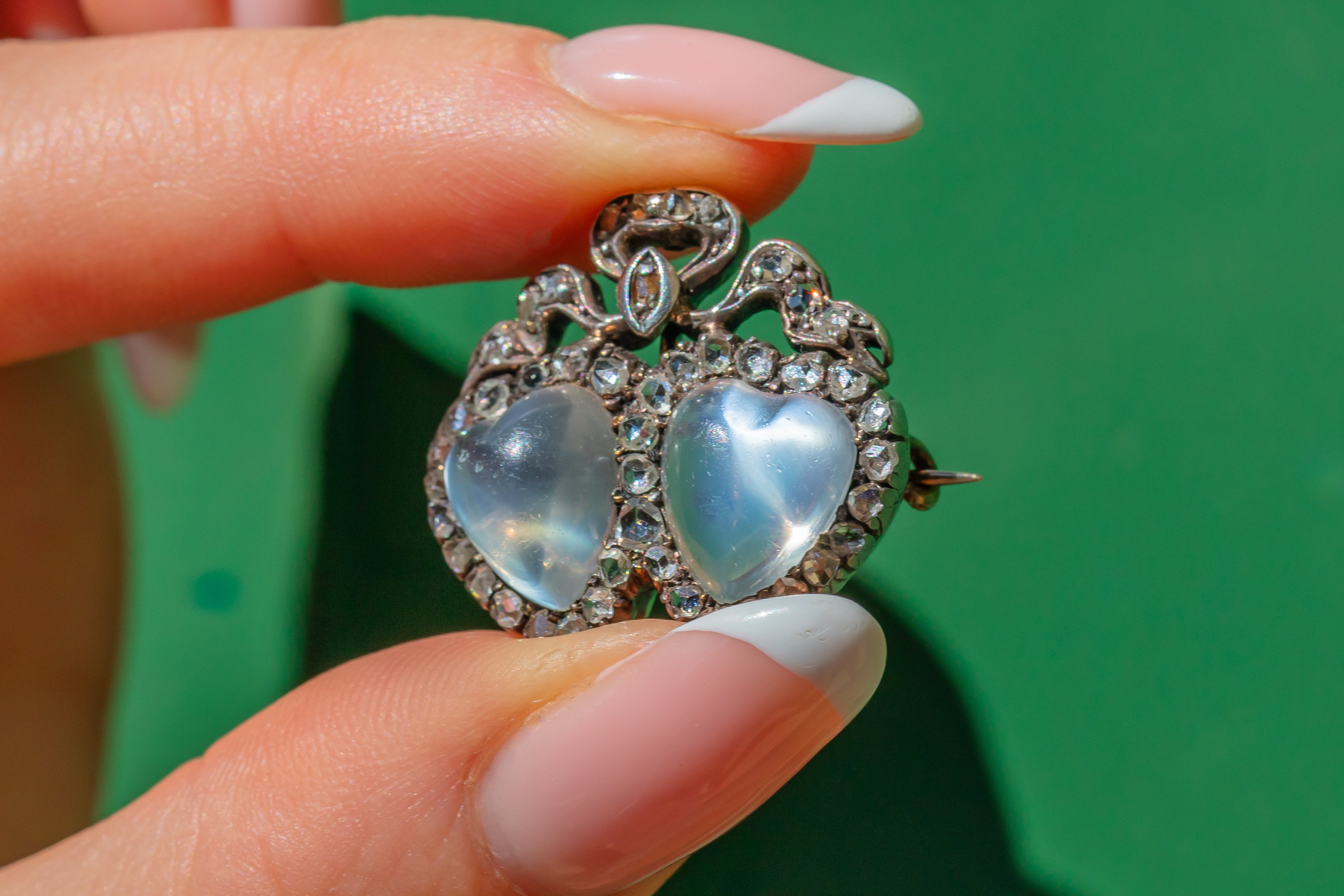 We can't believe our eyes, just look at this rare Victorian Moonstone cabochon Diamond bow heart brooch, she's certainly got our hearts racing!