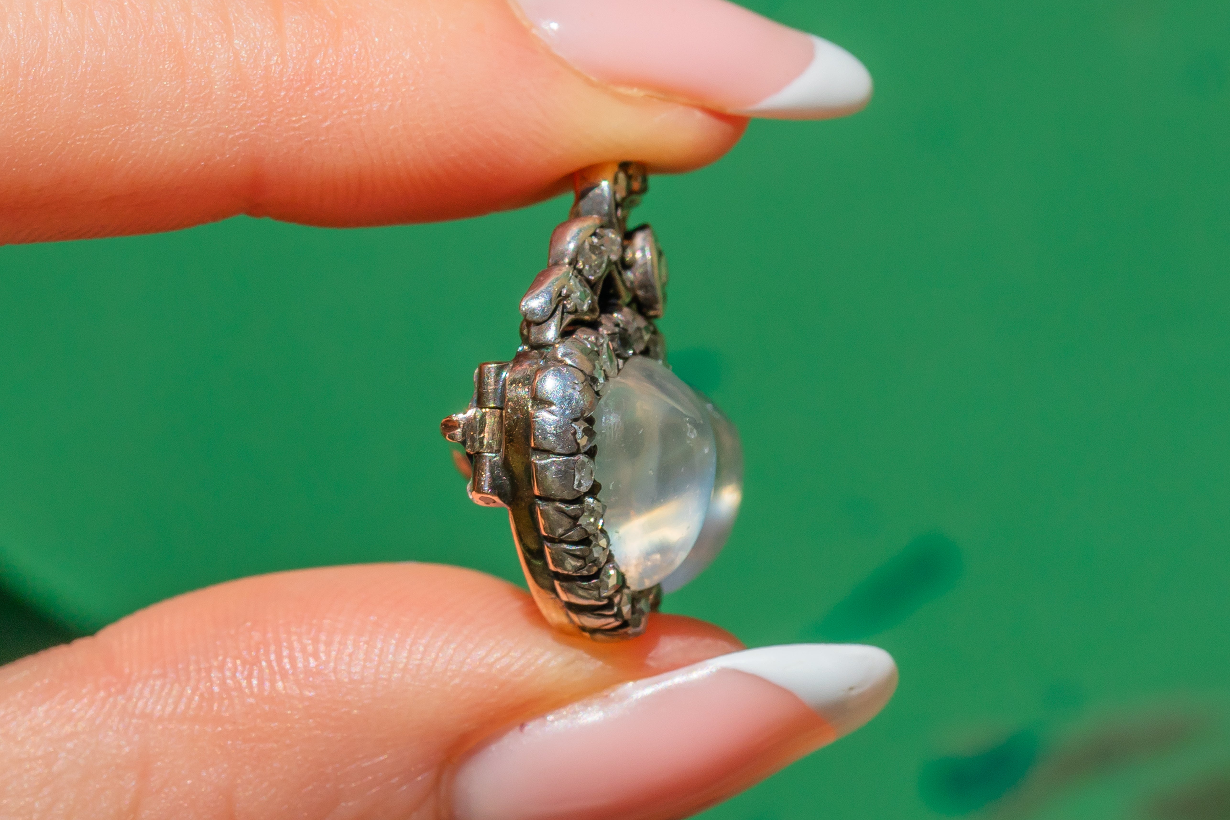 MATERIALS: 9ct Gold, Silver, rare hand carved heart shaped Moonstone cabochons, Rose-cut Diamonds.