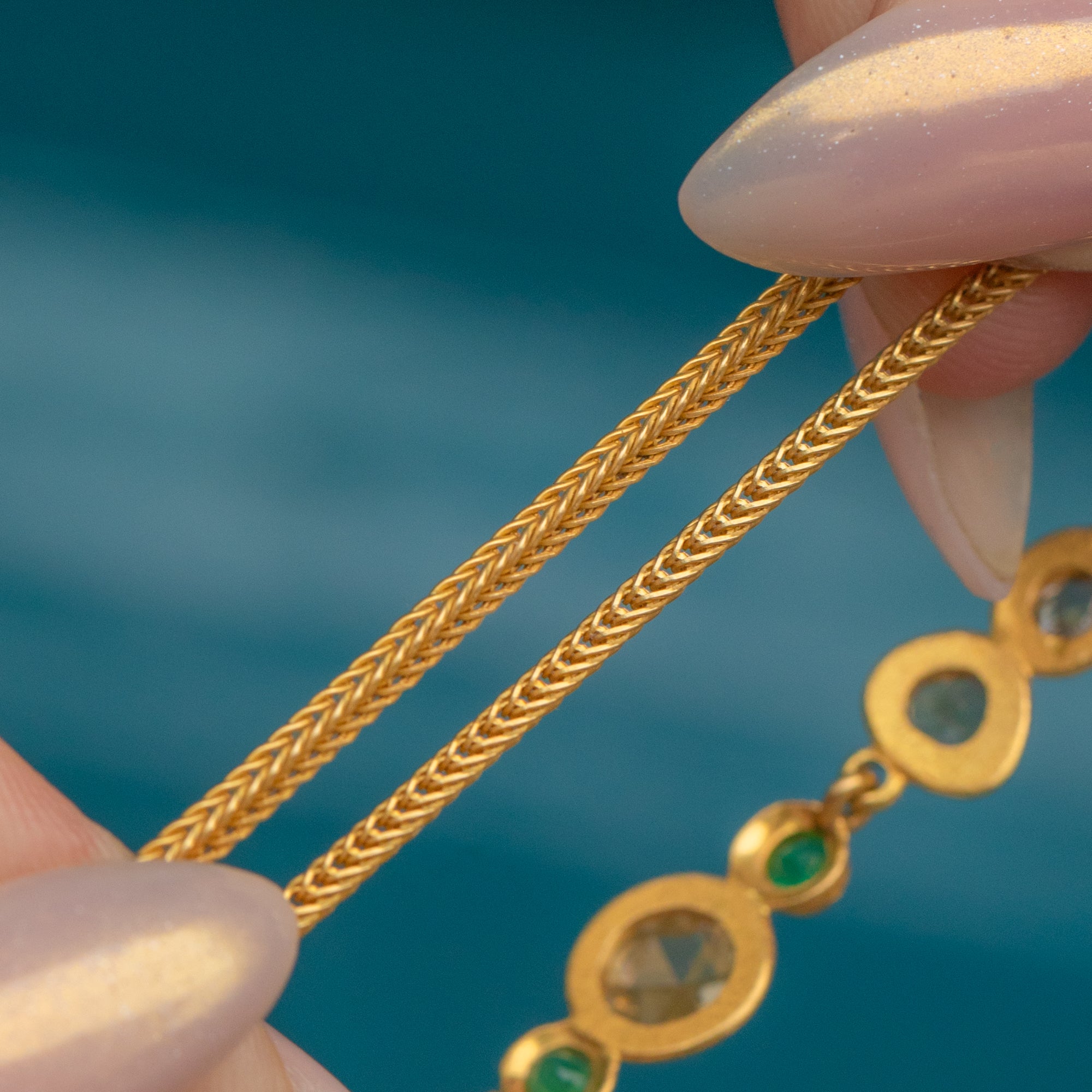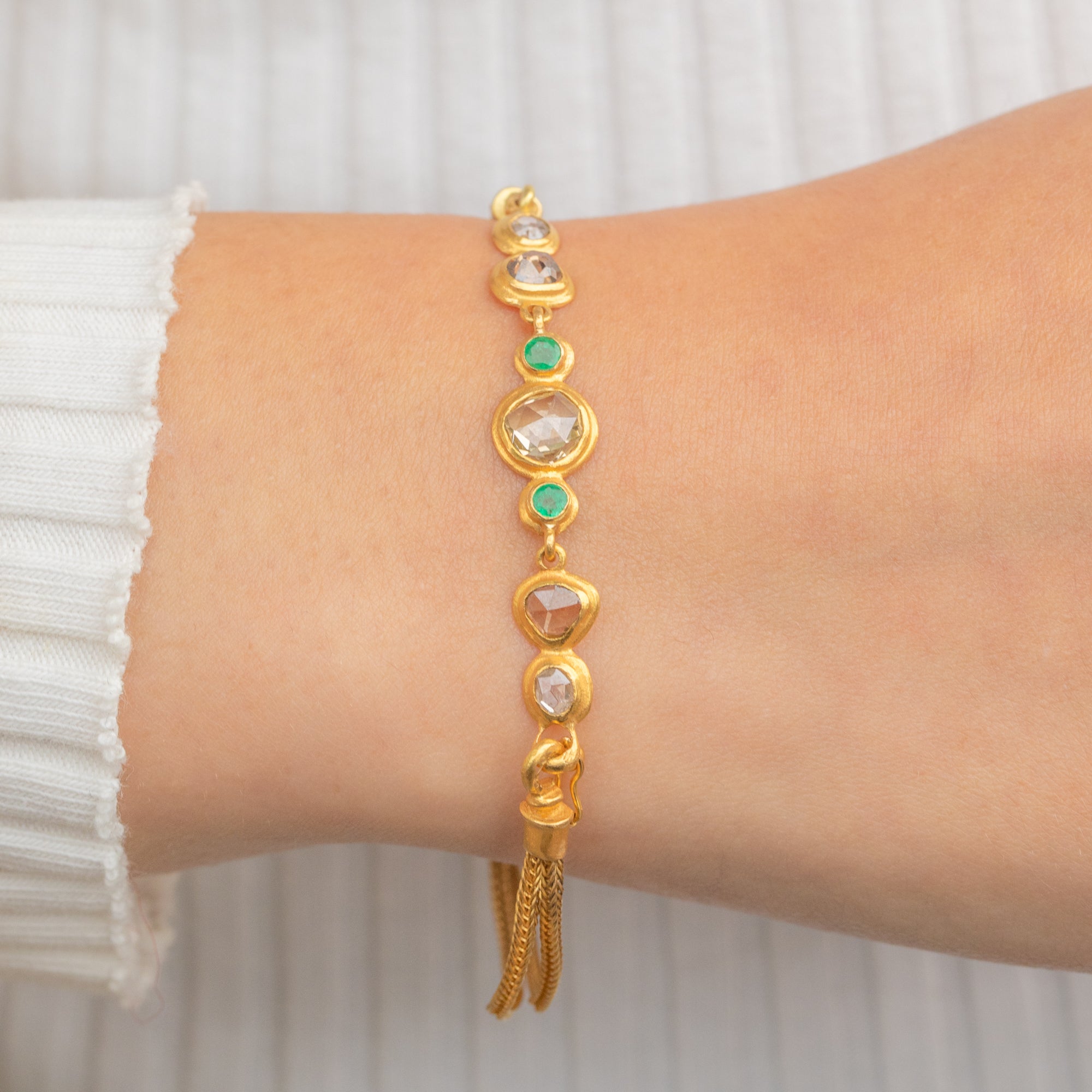 This exceptional bracelet showcases a series of rose-cut Diamonds and vivid Emeralds, each set in bold high carat Gold bezels. The gemstones are linked by fine fox-tail chains, creating a supple, flexible design that sits elegantly against the wrist. The Diamonds, individually shaped and full of antique character, display a variety of tones from silvery-white to soft cognac, enhanced by the glowing green of two natural Emerald accents.