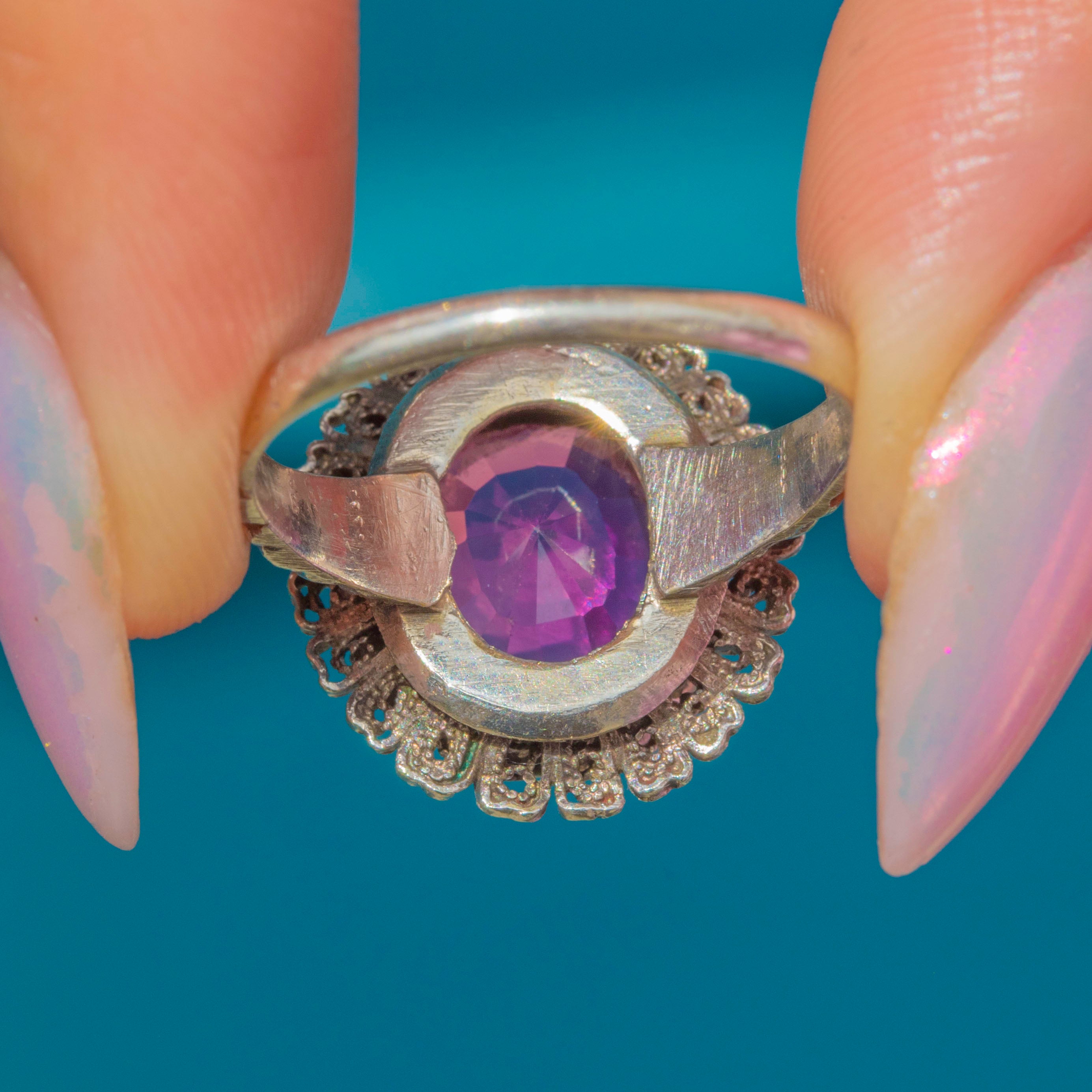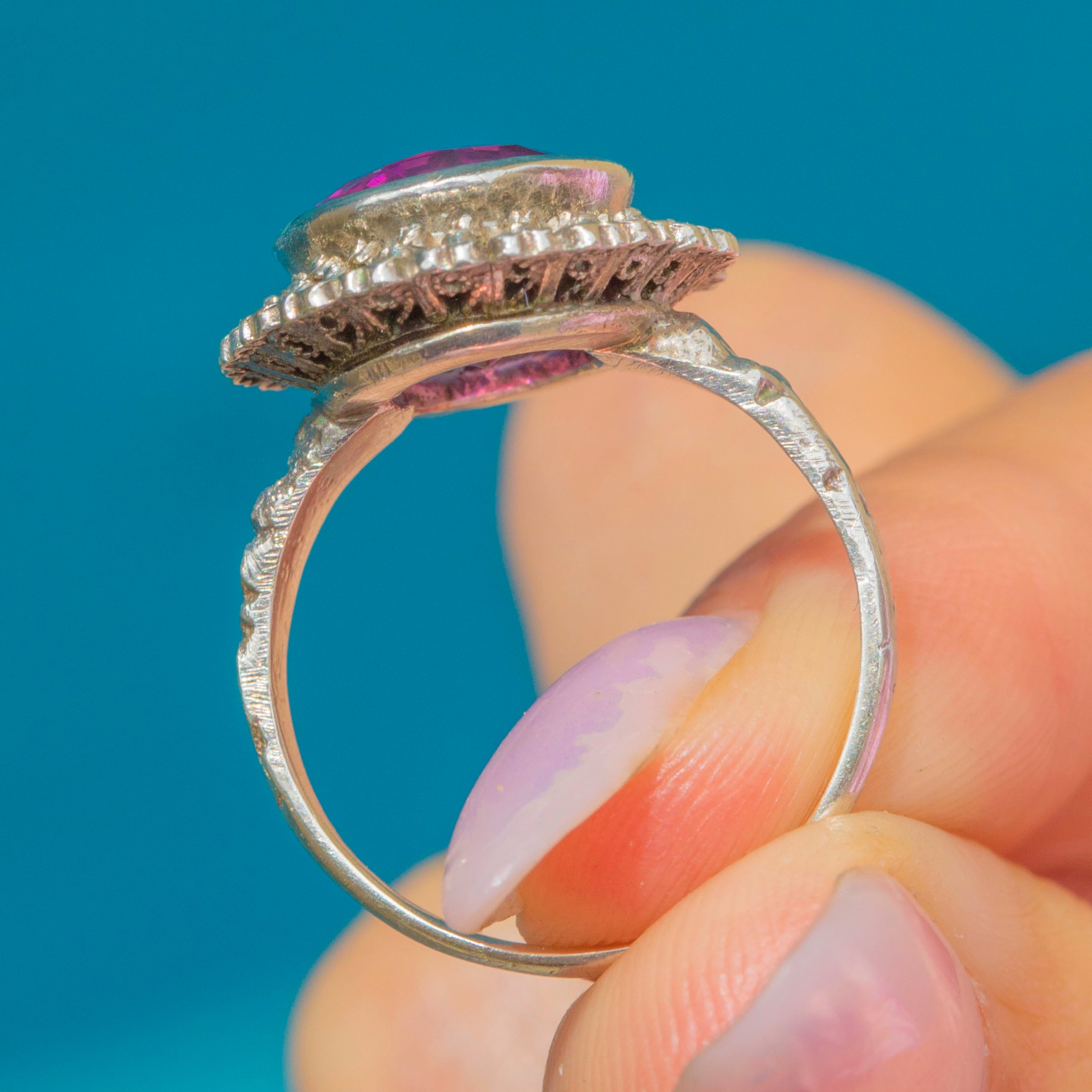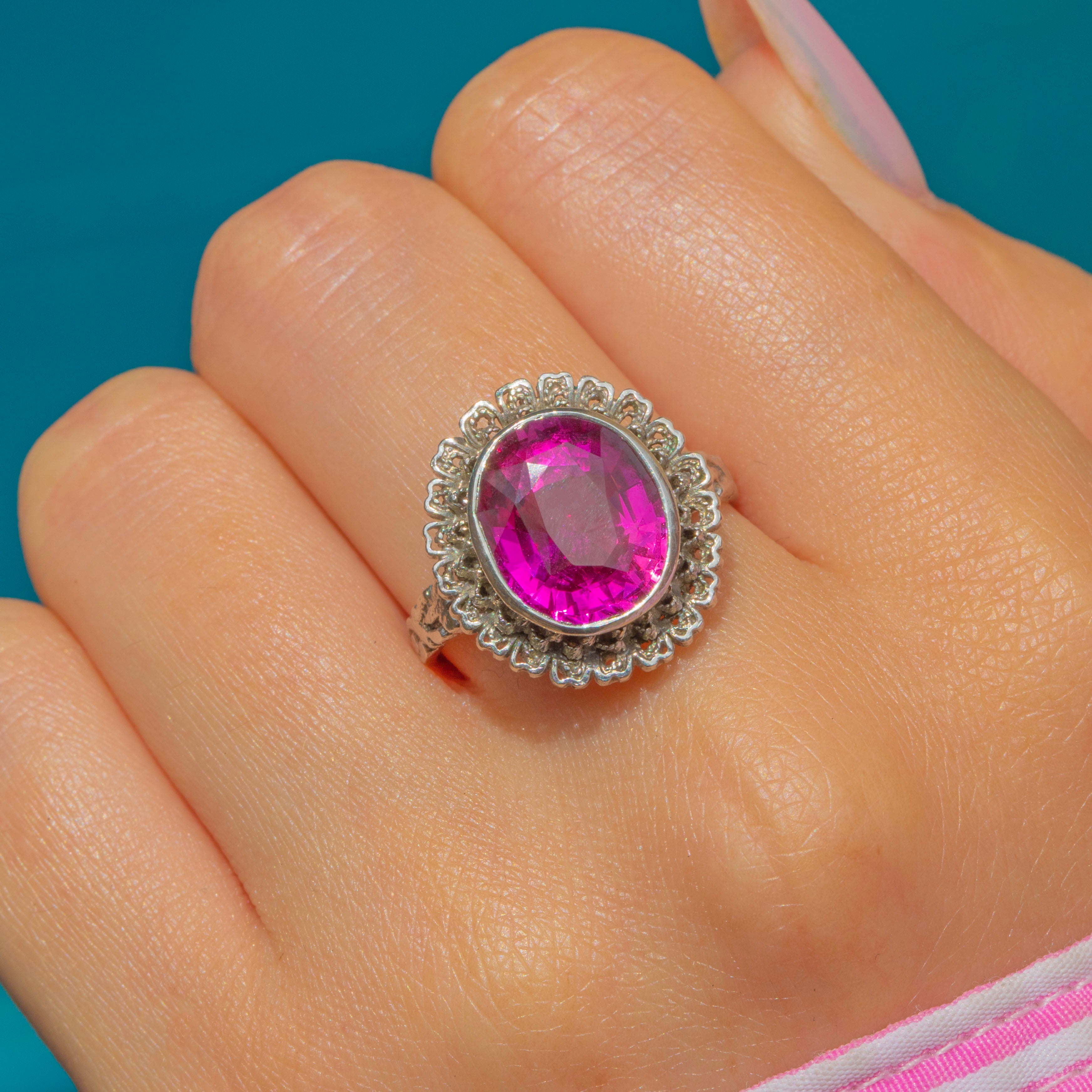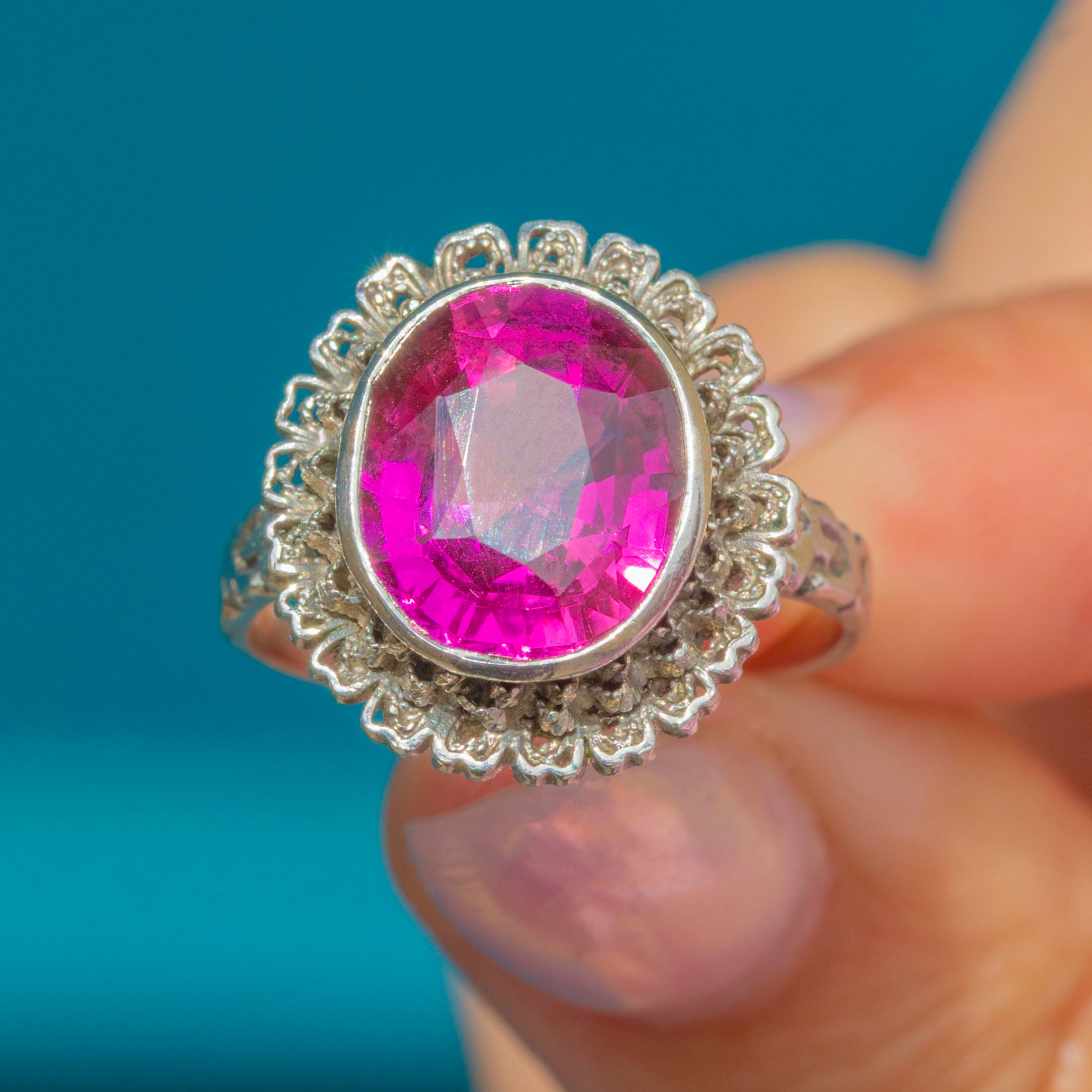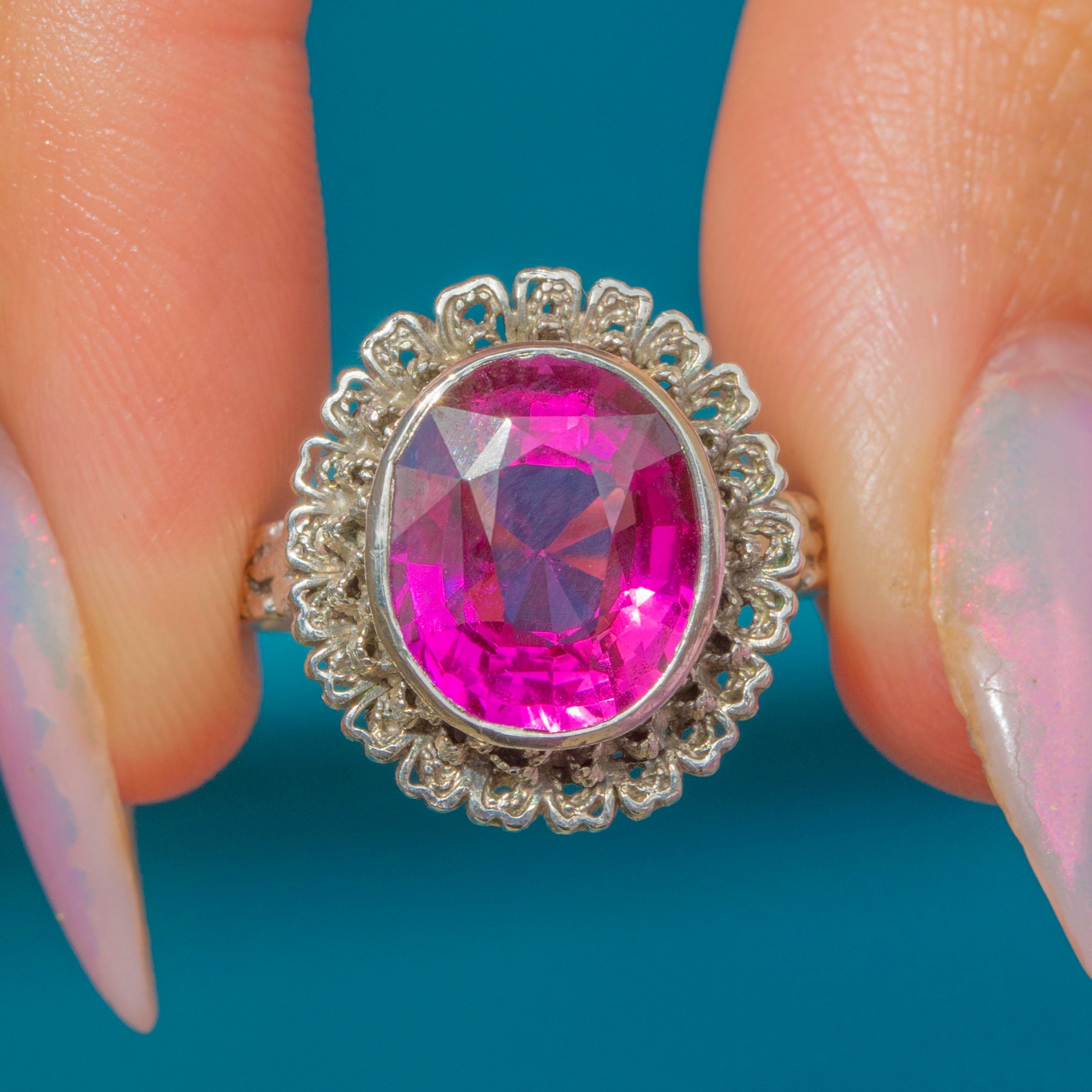 This bewitching mid-century vintage ring features stunning cannetille openwork and is inlaid with a 3.30ct hot pink Ruby!