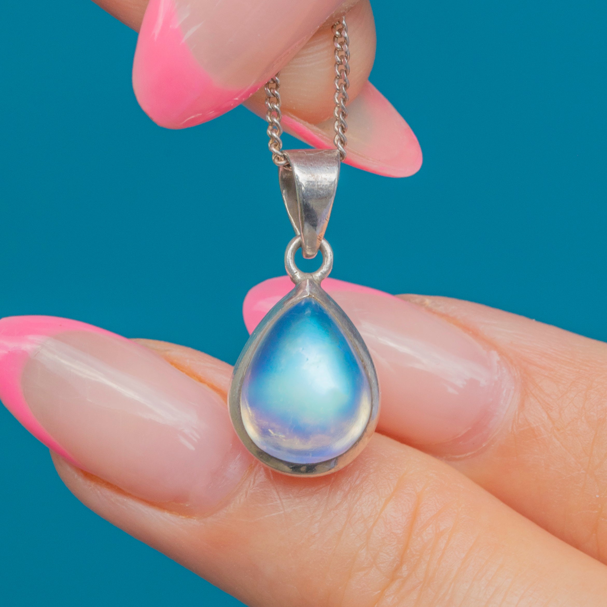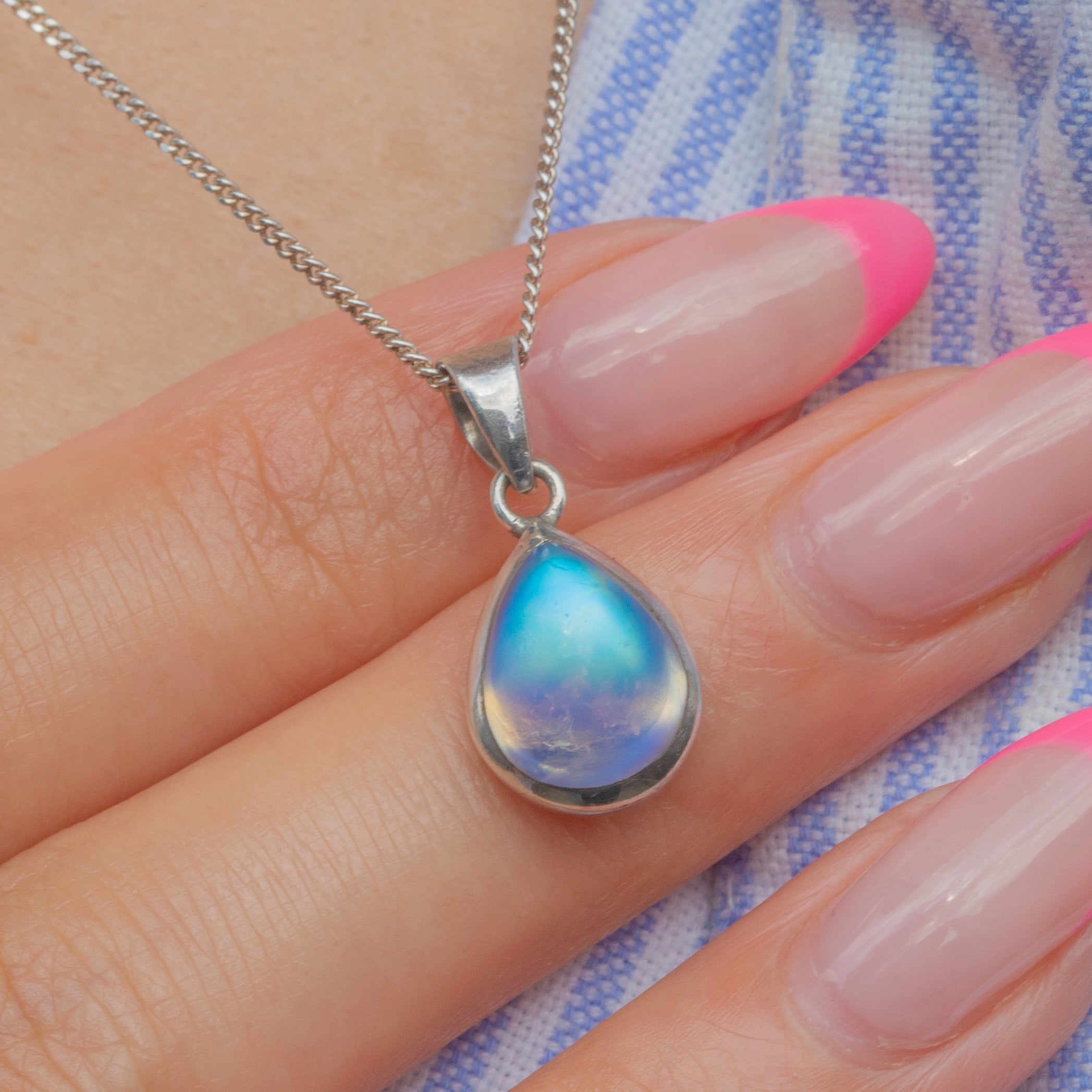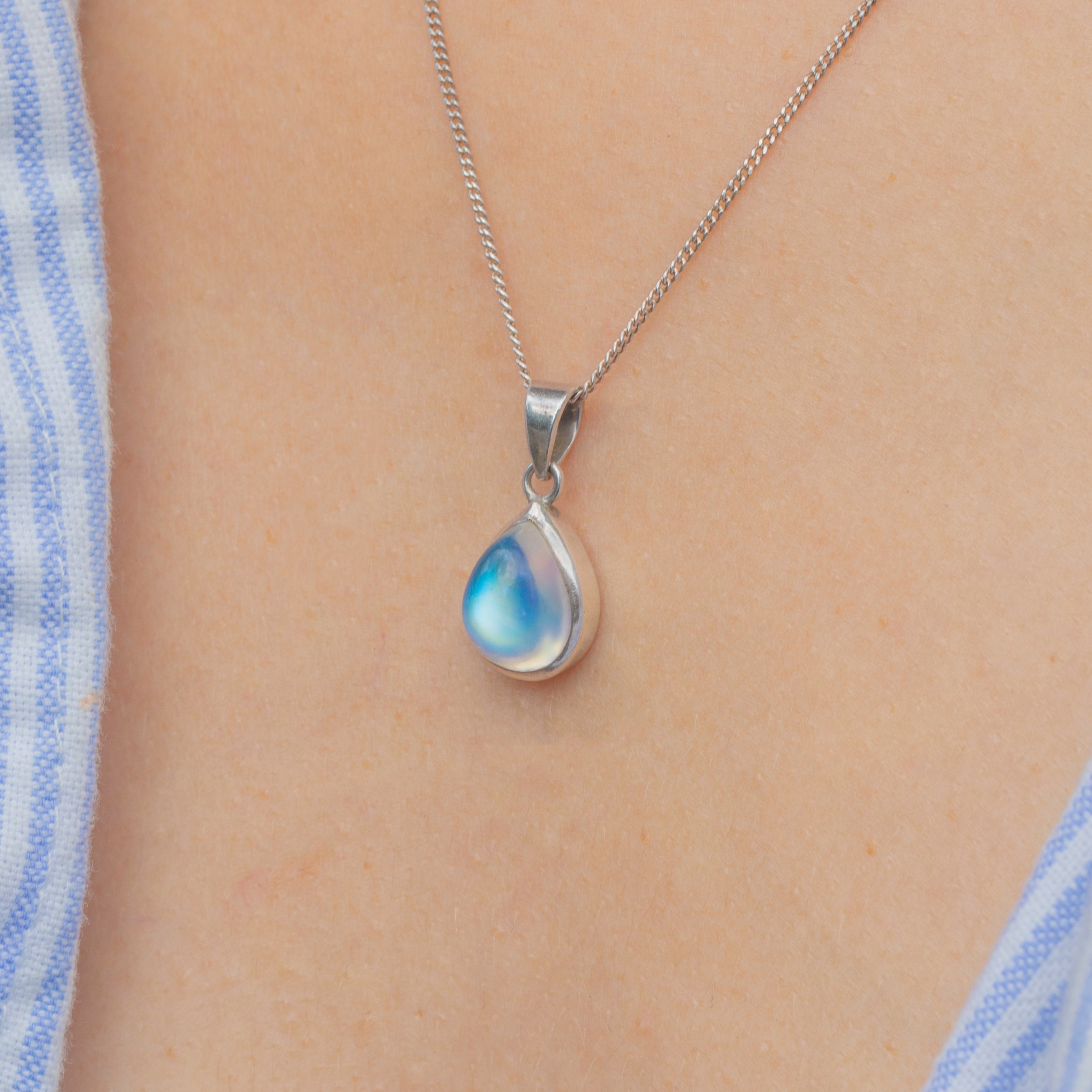 Suspended from a lustrous 18" Silver fine chain rests a dainty pear-shaped rainbow Moonstone cabochon charm. With a whimsical adularescence as she billows the light, this Moonstone cabochon projects gorgeous rainbow tones from every angle. She is set within a glossy Silver bezel, the cool tones effortlessly complementing the Moonstone charm.
