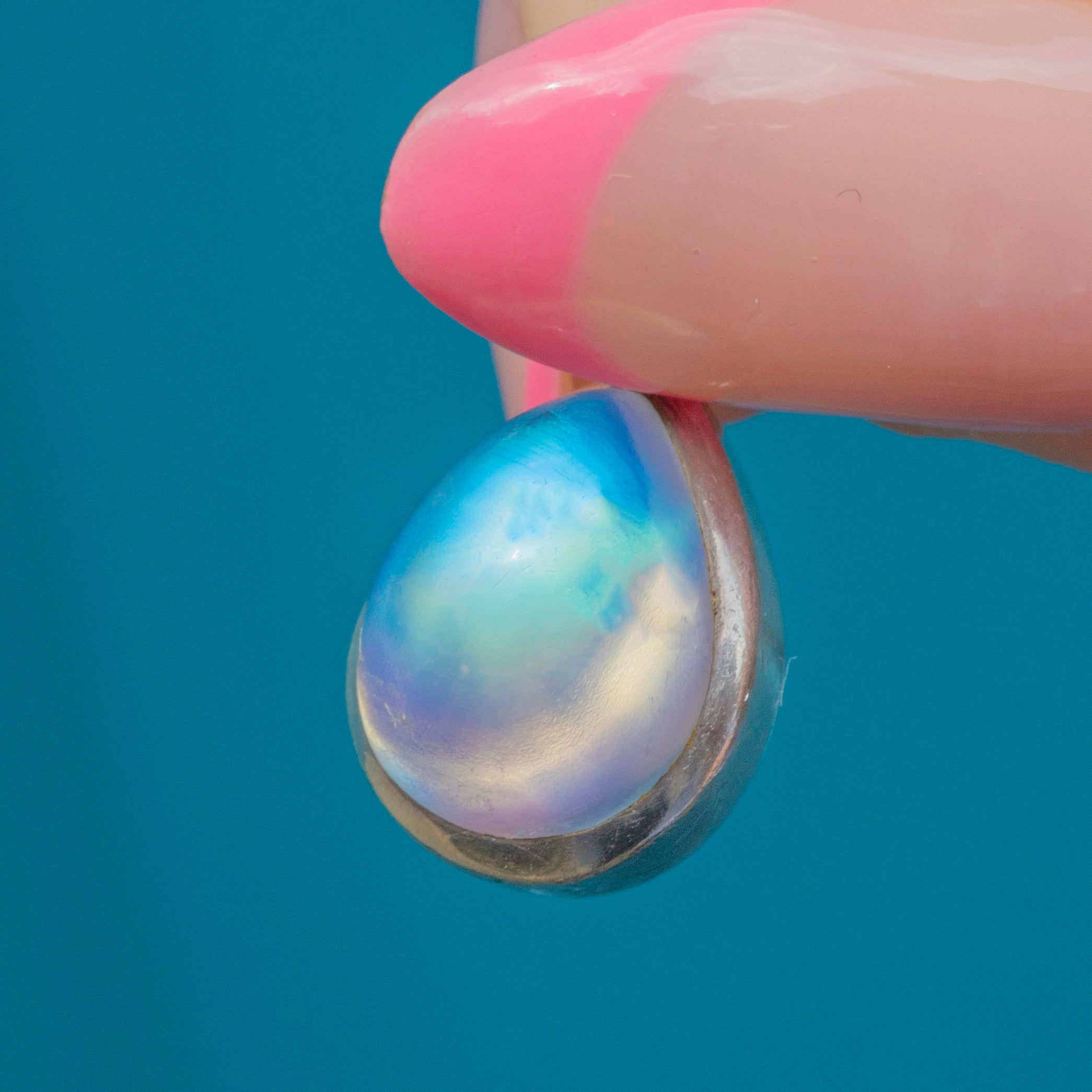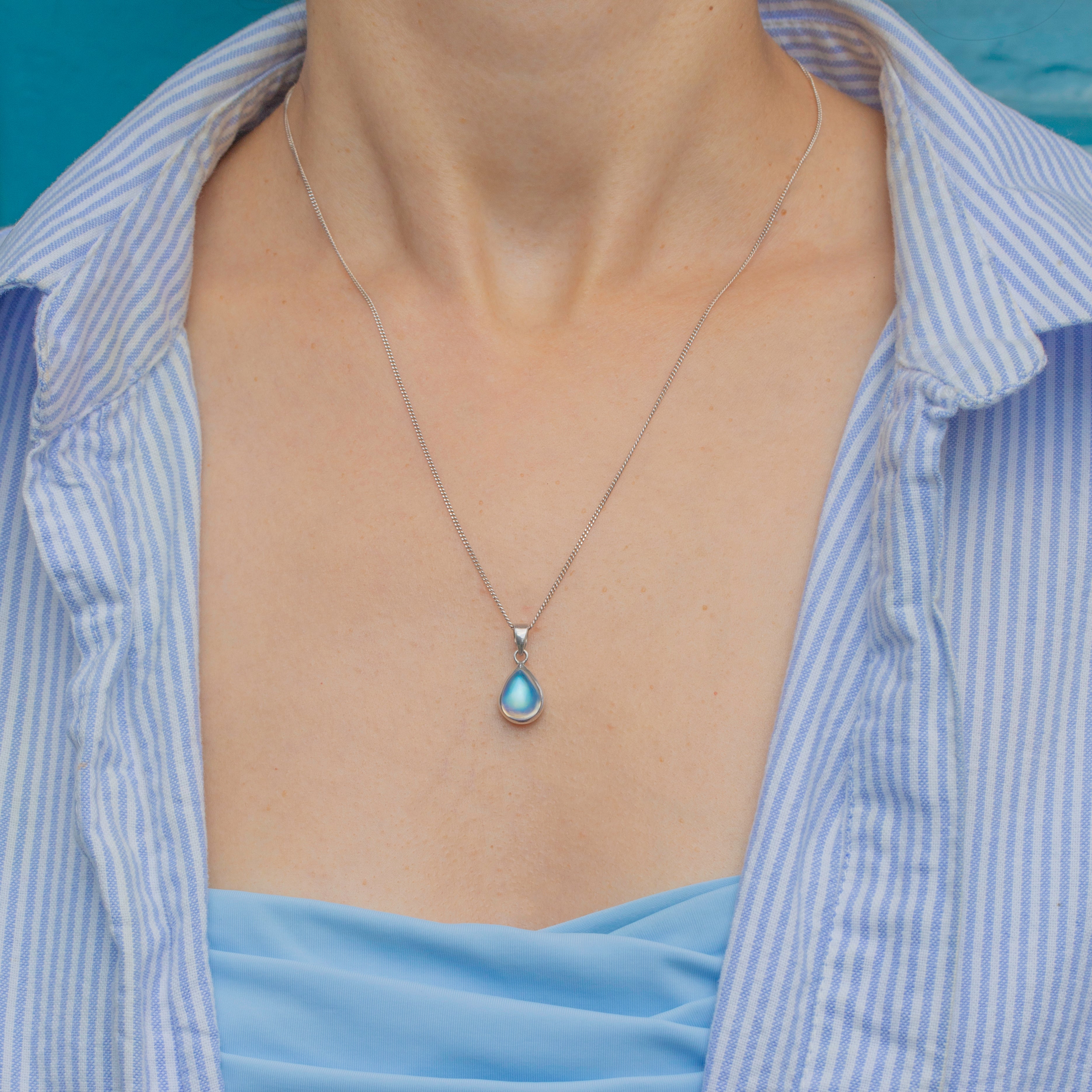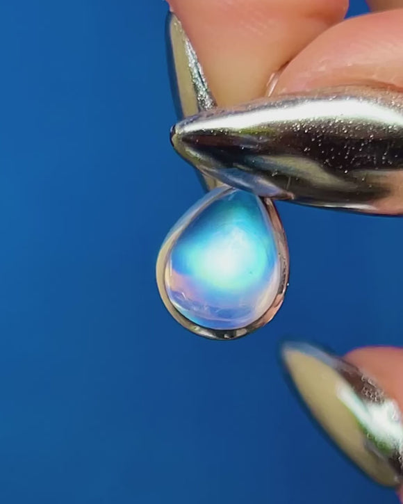 Suspended from a lustrous 18" Silver fine chain rests a dainty pear-shaped rainbow Moonstone cabochon charm. With a whimsical adularescence as she billows the light, this Moonstone cabochon projects gorgeous rainbow tones from every angle. She is set within a glossy Silver bezel, the cool tones effortlessly complementing the Moonstone charm.