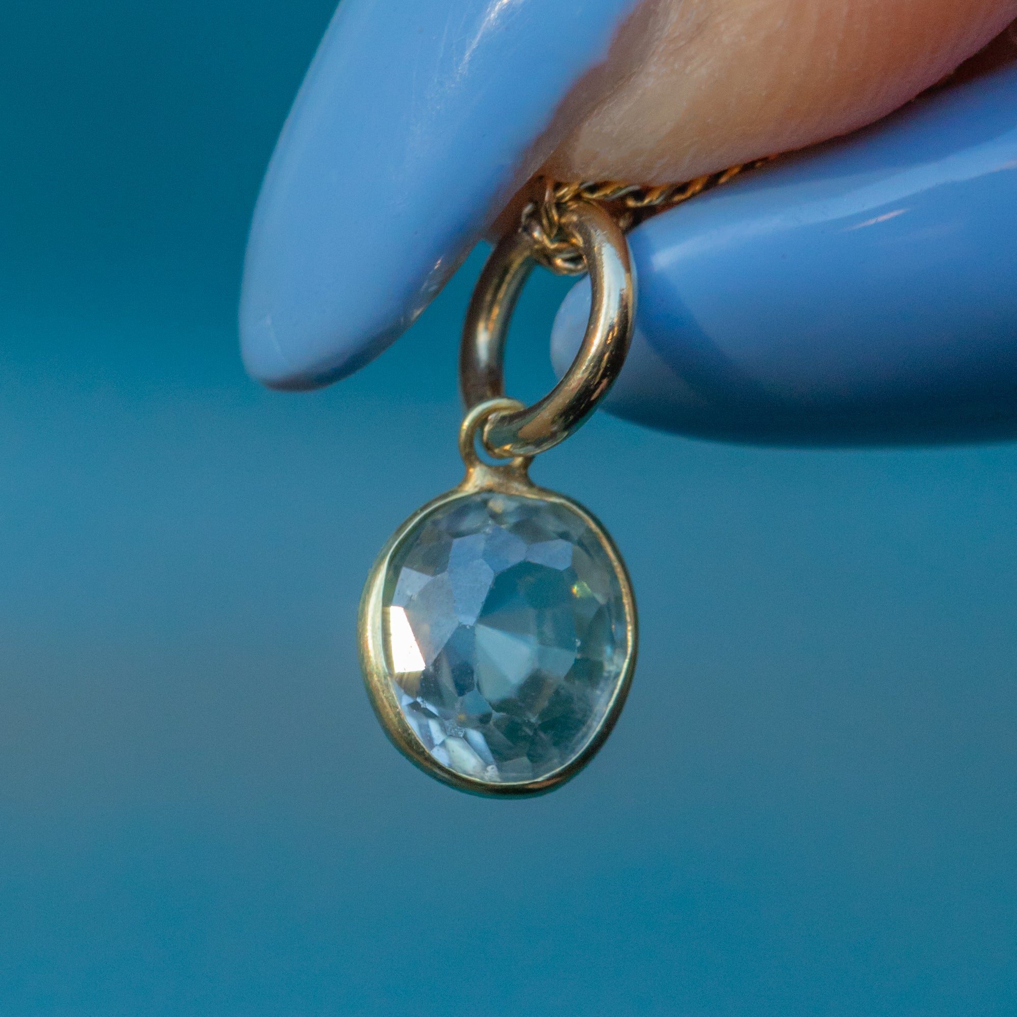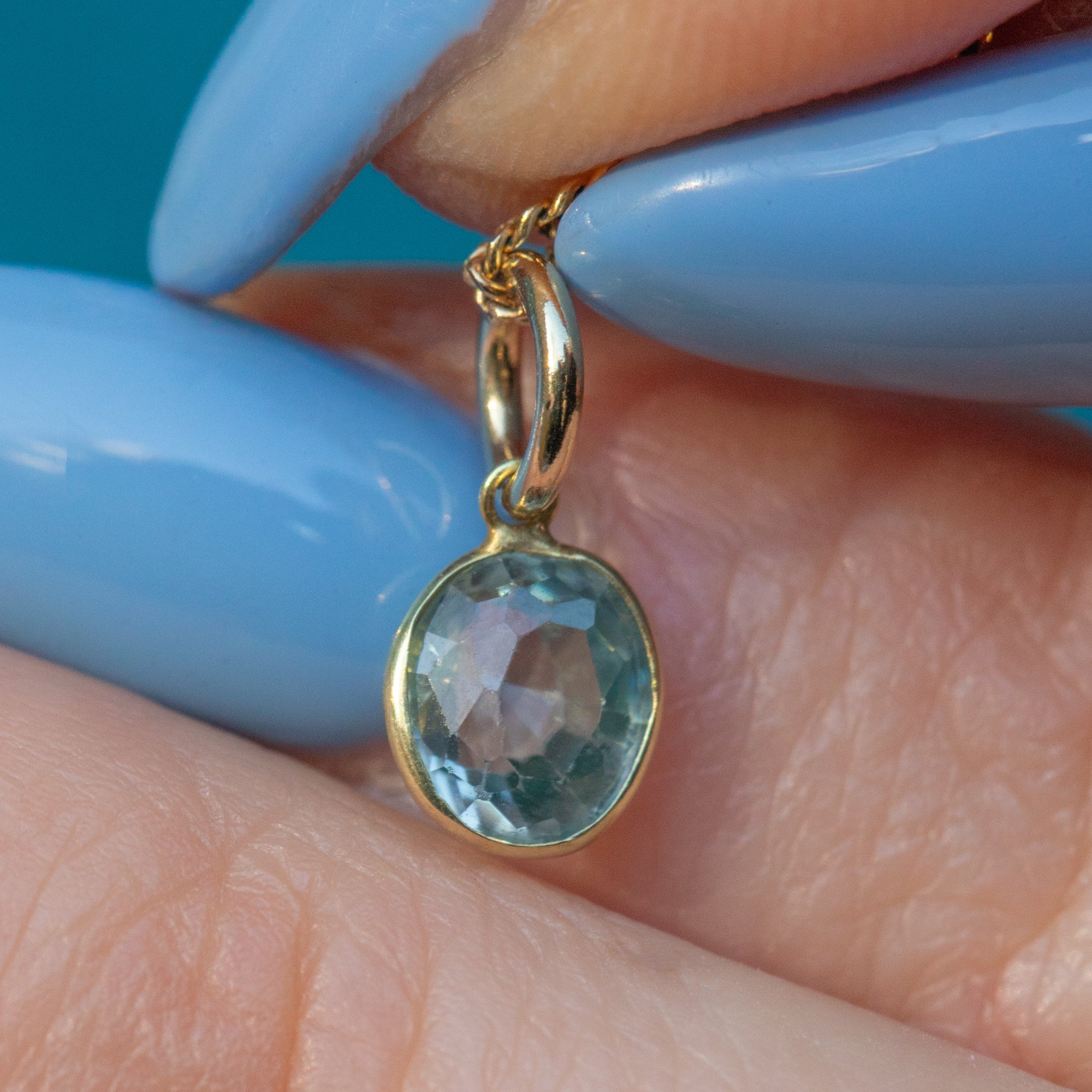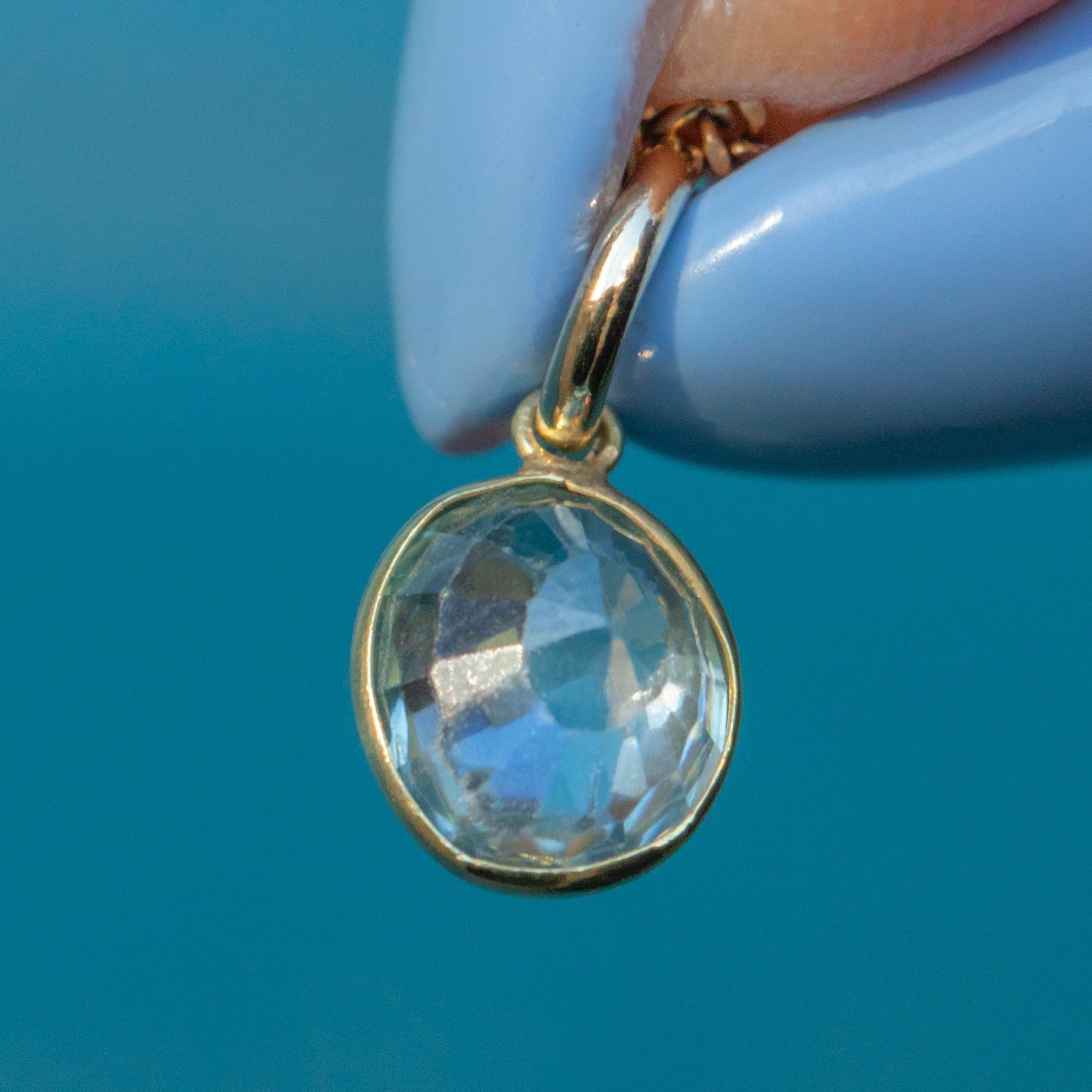 This small Blue Topaz bezel-set charm is the perfect dainty treasure! Ideal for adding a subtle sparkling accent to your décolletage, this Victorian Topaz charm glistens lovely cerulean hues as its crisp facets catch the light.