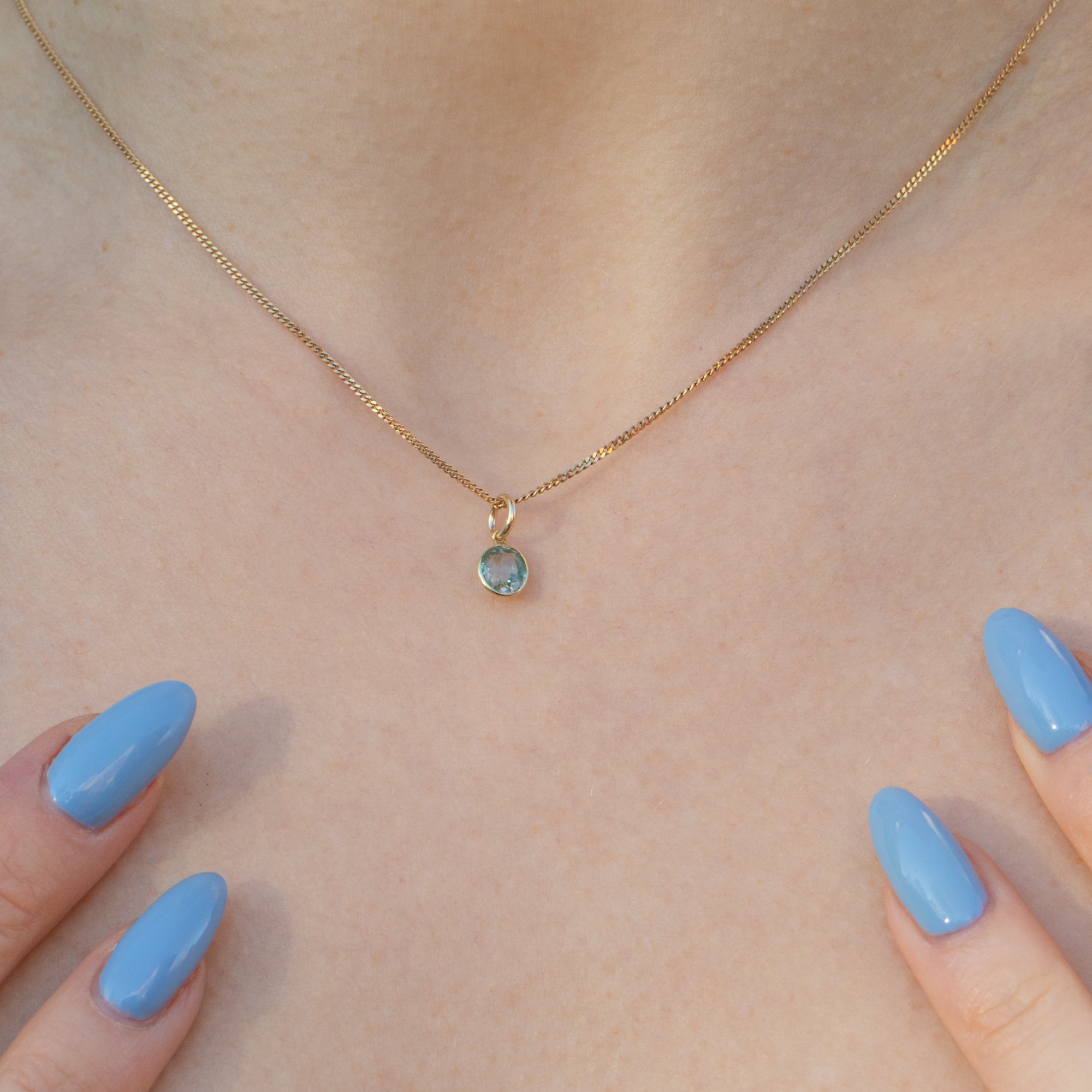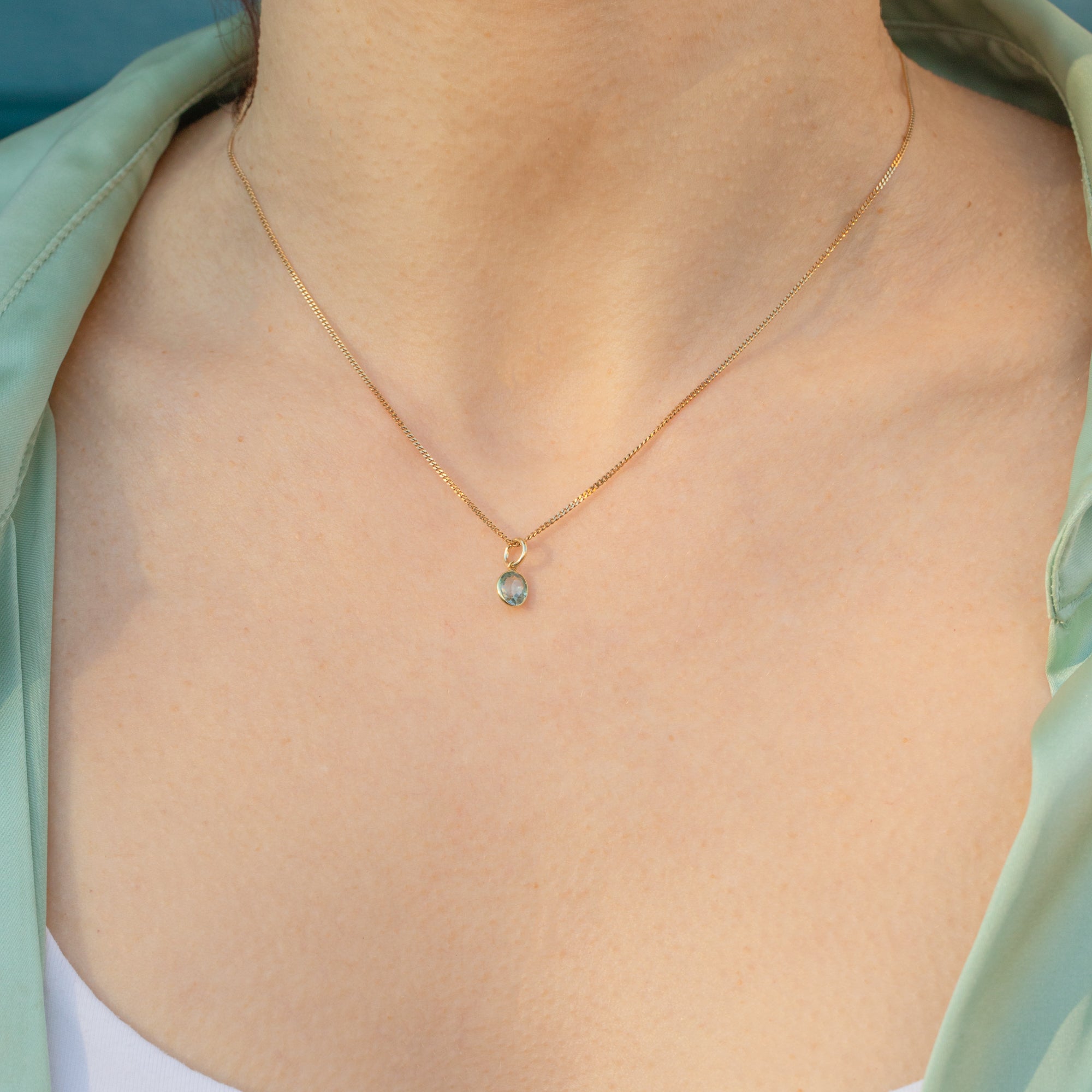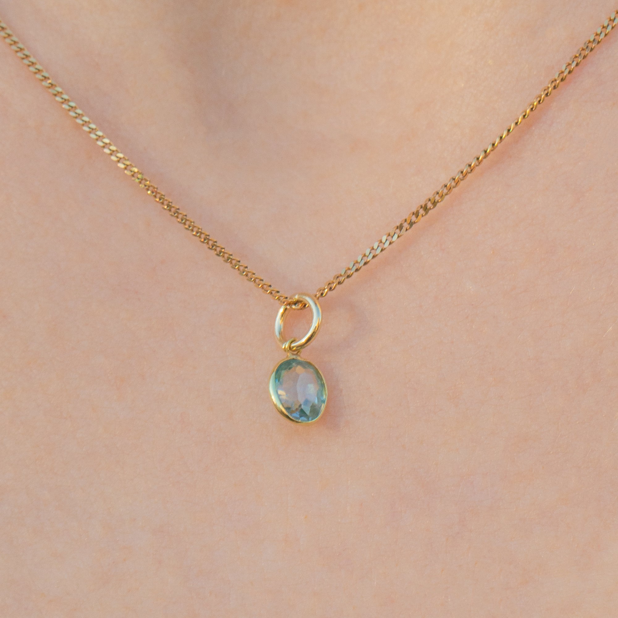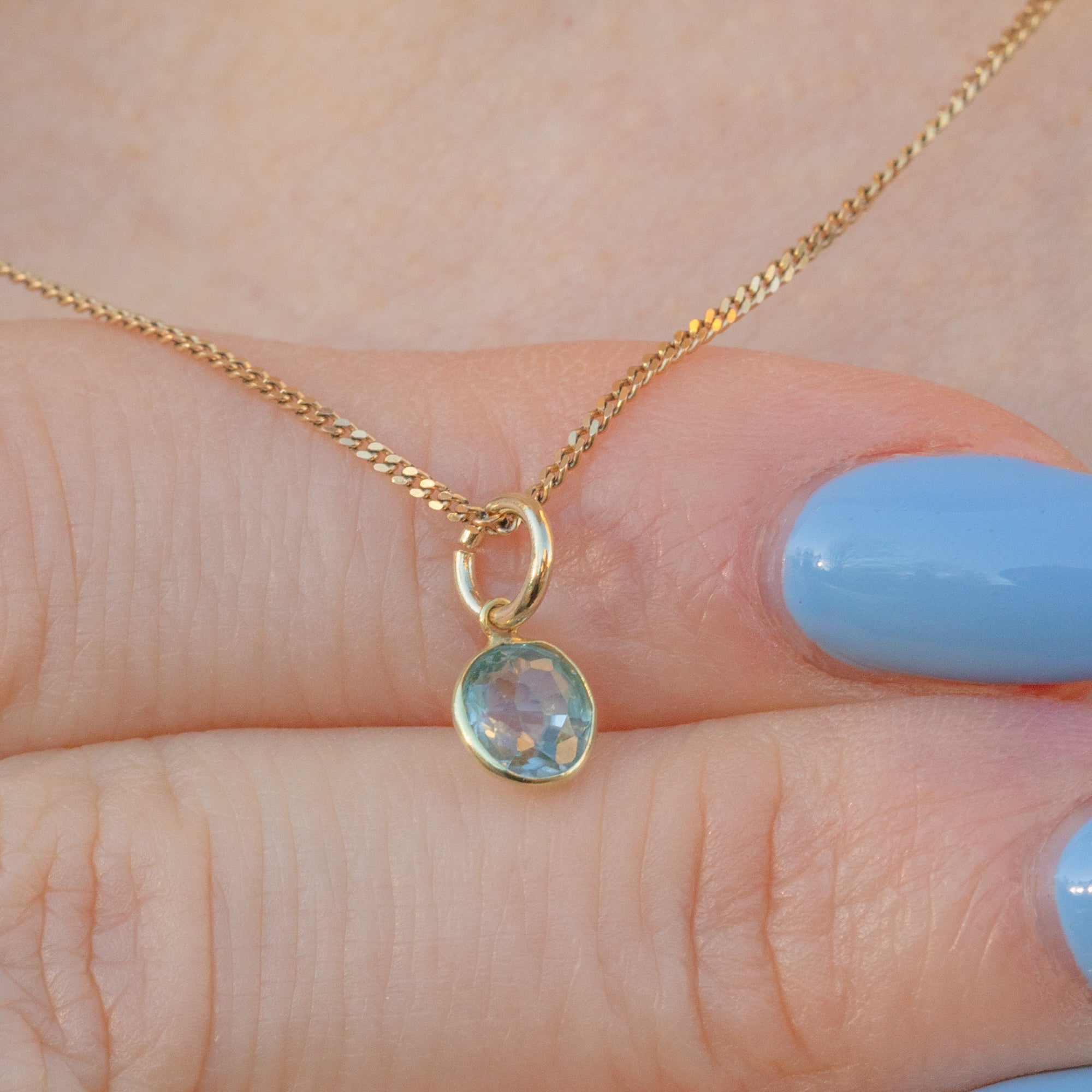 This small Blue Topaz bezel-set charm is the perfect dainty treasure! Ideal for adding a subtle sparkling accent to your décolletage, this Victorian Topaz charm glistens lovely cerulean hues as its crisp facets catch the light.