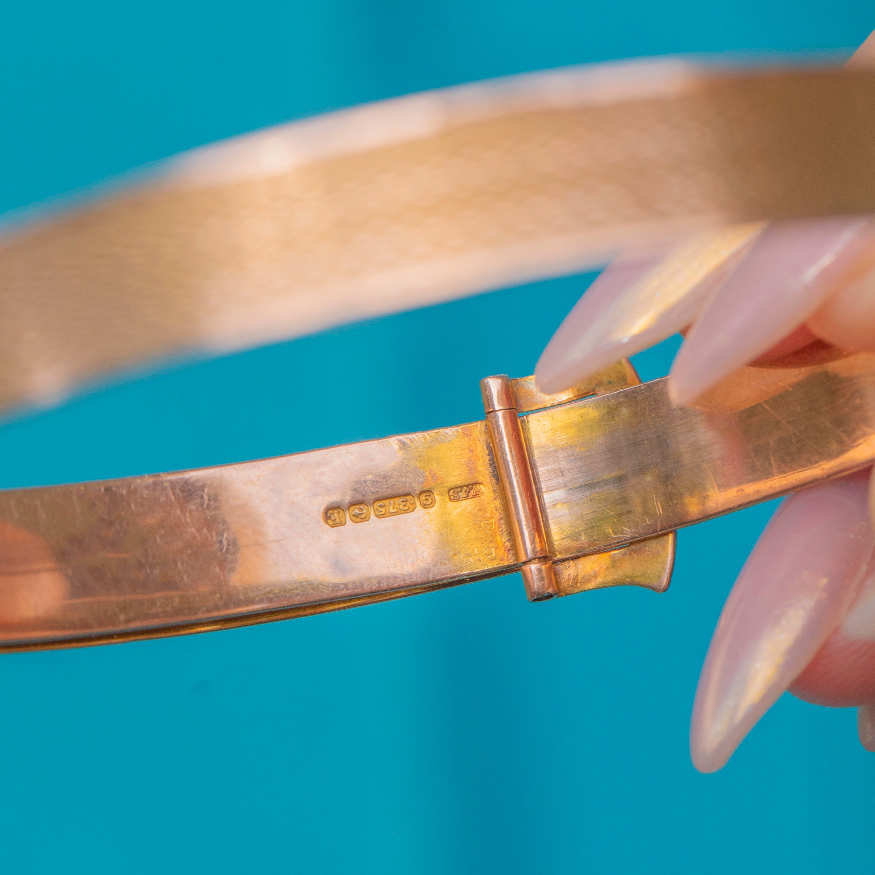 This striking Art Deco buckle bangle, hallmarked 1919, is crafted in solid 9ct Gold and beautifully engraved with a engine-turned pattern across its surface and the size is ingeniously adjustable!