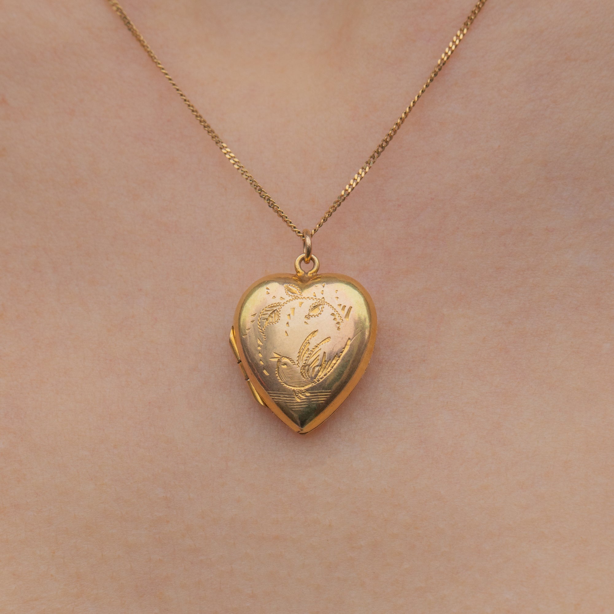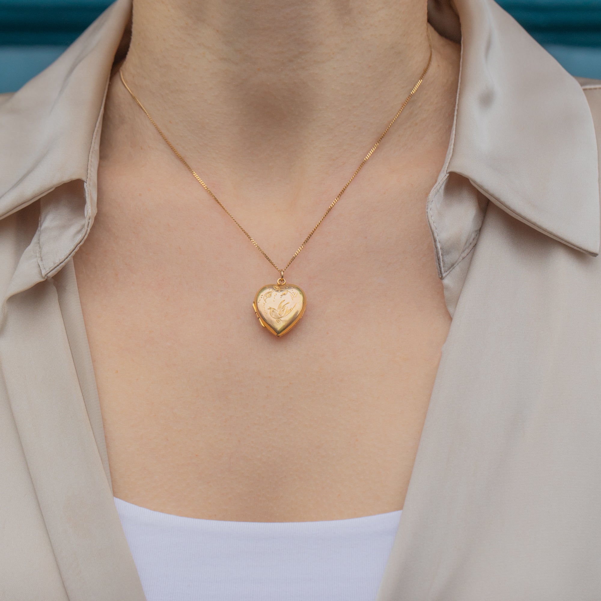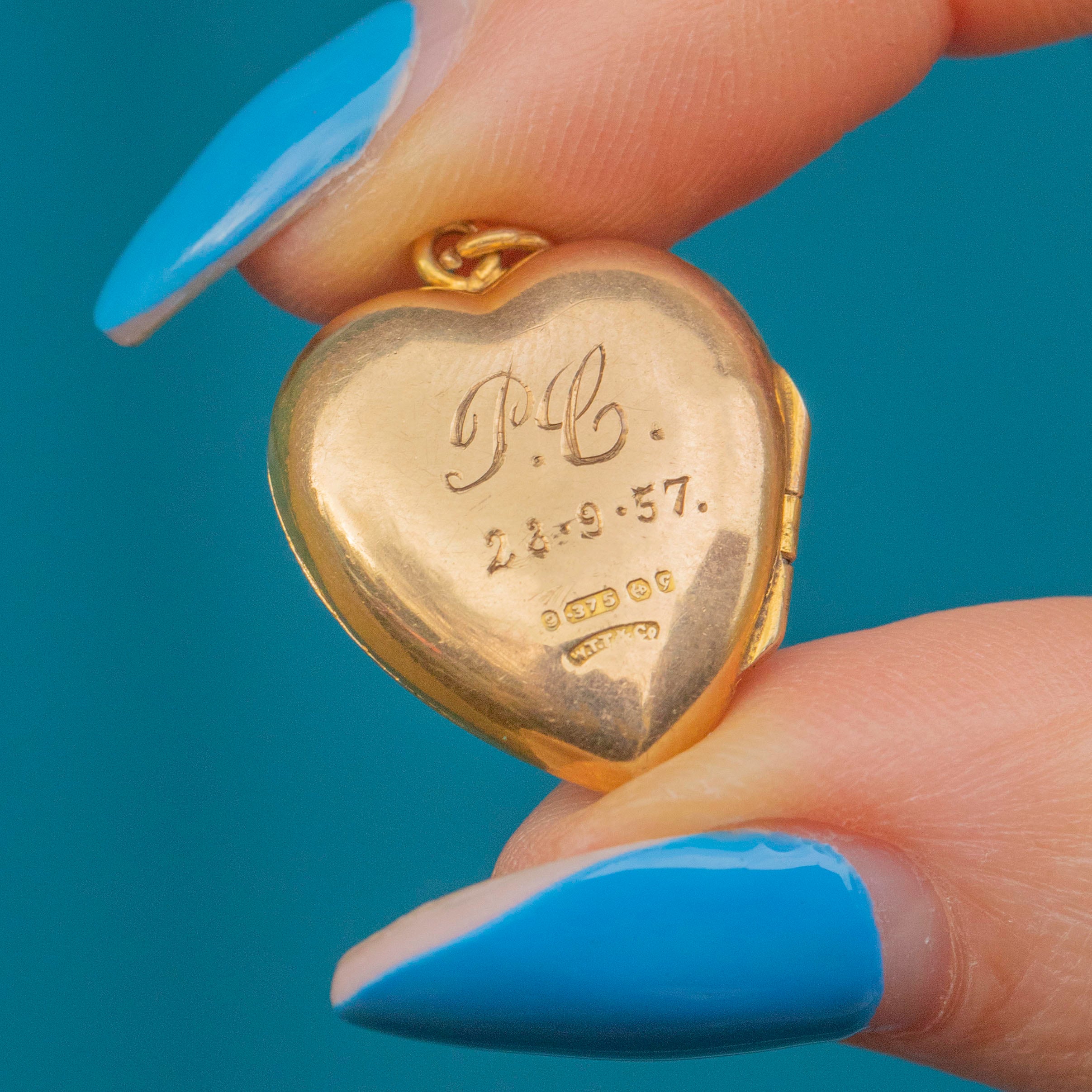 EXCELLENT. This solid 9ct Gold engraved heart locket is in excellent condition, with minimal signs of age. The back bears a lovely personal engraving, "P.C." and the date "28.9.57," offering a glimpse into her sentimental history and a nod to her previous owner. The Gold remains smooth and glossy with crisp engravings, and the locket opens and closes securely allowing you wear it with confidence!