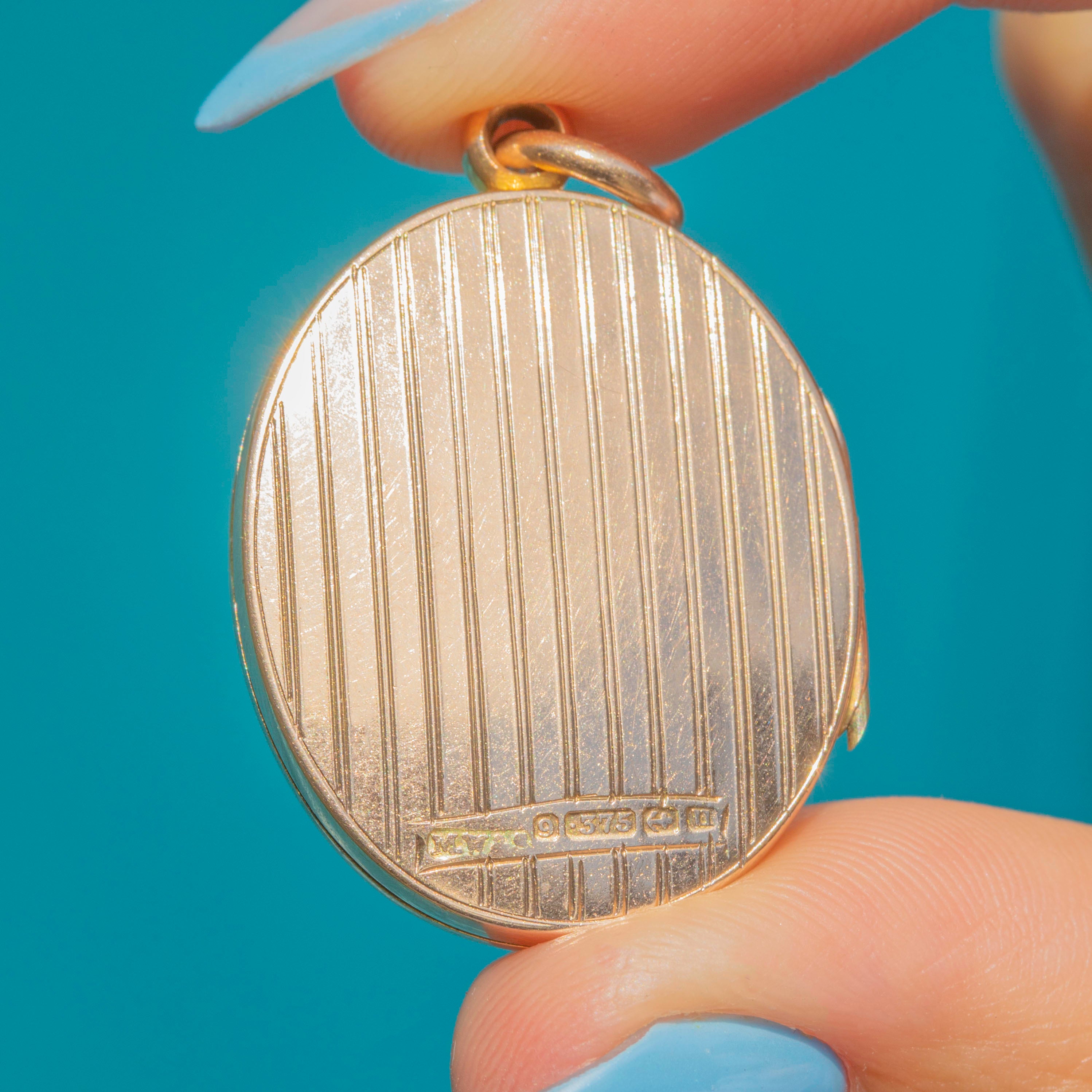 This wonderful Art Deco locket has been crafted from solid 9ct Gold and displays a striking pinstriped design that catches the light beautifully, creating an interesting visual effect.