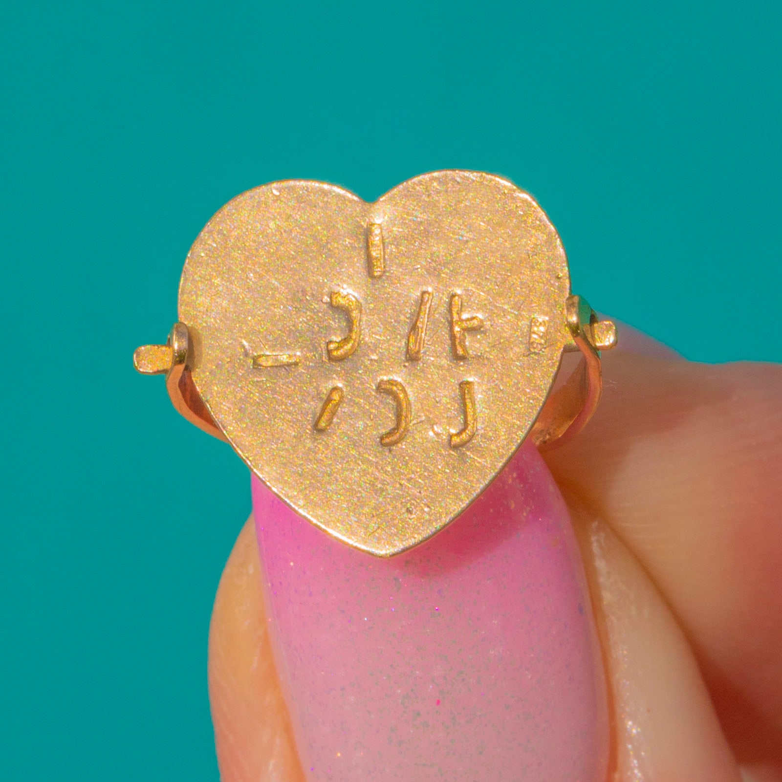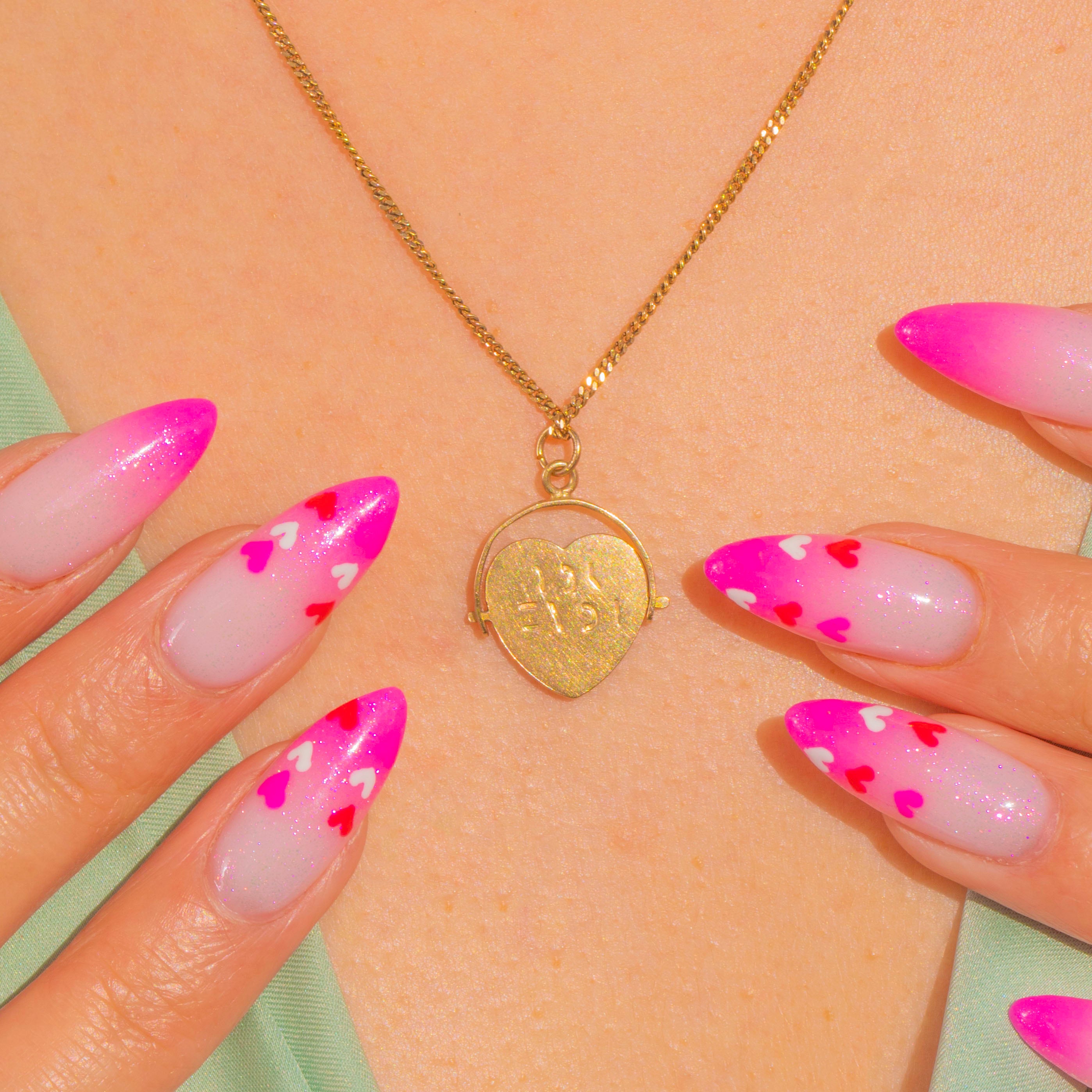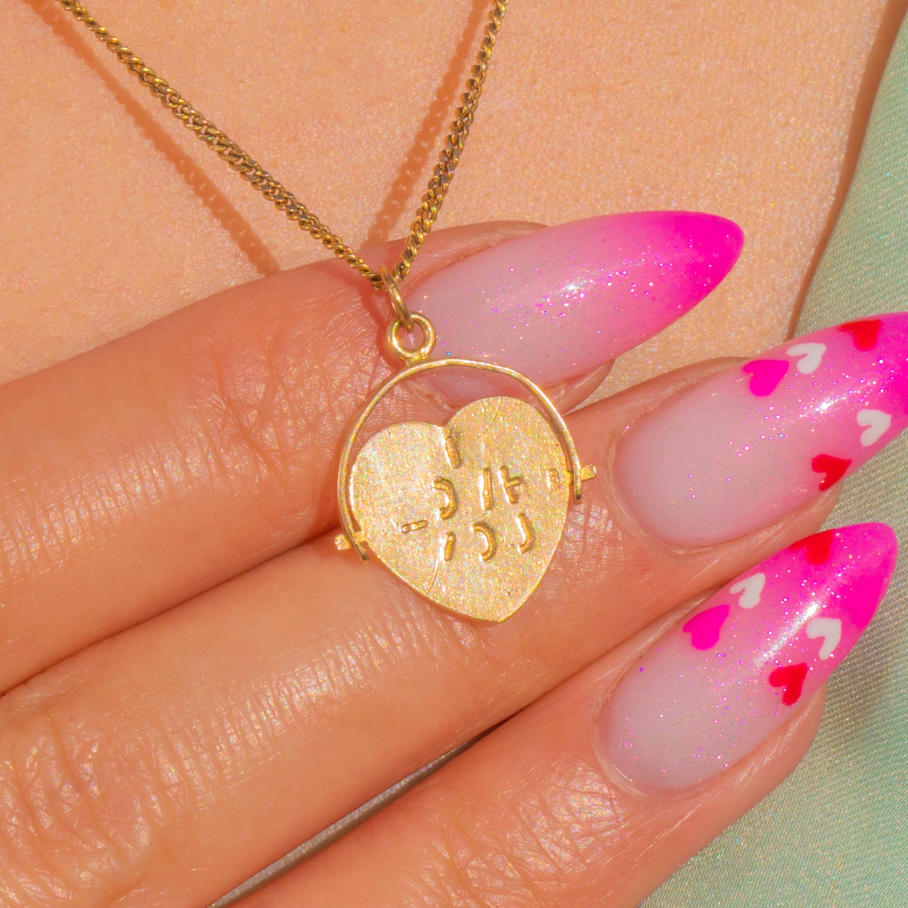 Slim, sweet and brimming with sentiment, this solid 9ct Gold spinner pendant declares “I LOVE YOU” in classic Mid-Century style. The heart pivots within its fine circular frame, giving a gentle tactile twirl and a warm golden glow with every movement.