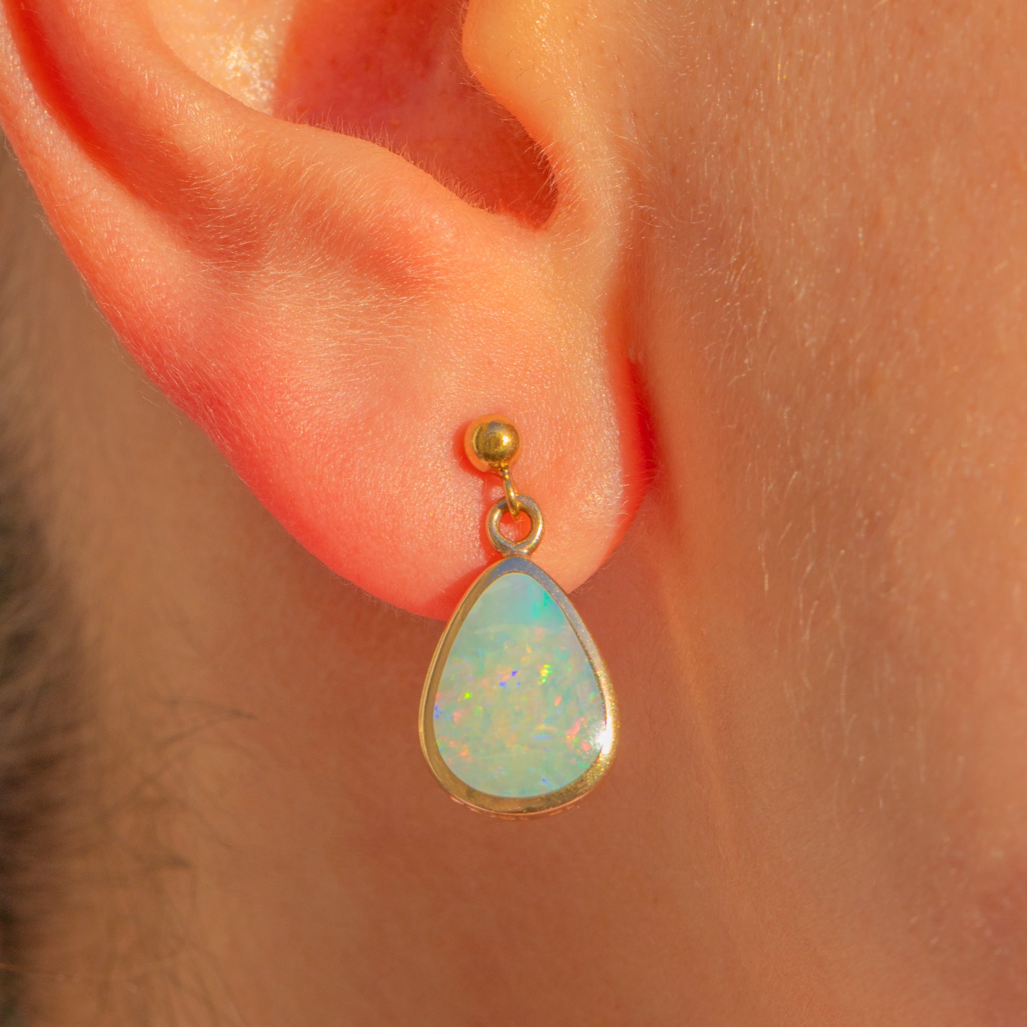 EXCELLENT: The Opals are glossy with no chips, cracks or surface wear visible. The Gold bezels are crisp with minimal age-related wear. The earrings hang beautifully with secure fittings and have clearly been very well cared for.