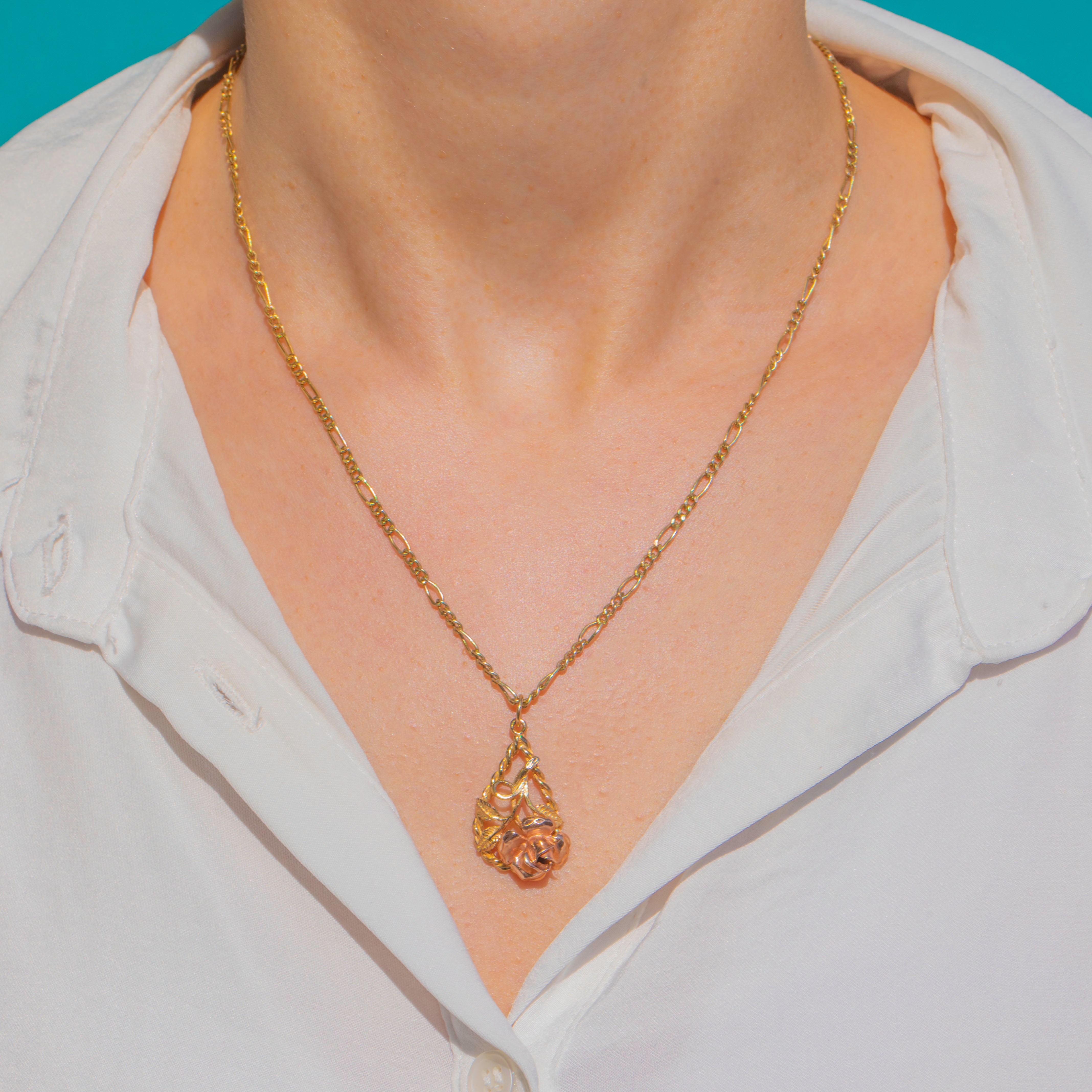 Romance in full bloom, this sculptural rose pendant is rendered in two-tone 9ct Gold, pairing warm Rose Gold petals with a Yellow Gold twisted-rope teardrop frame. The blossom is beautifully modelled in high relief, with trailing stems and engraved leaves that lend graceful movement and depth.