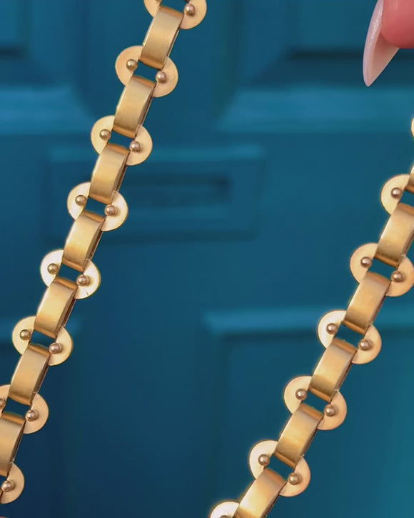 A spectacular Victorian book-chain necklace in rich 15ct Gold. Built from sculptural rectangular plaques linked by domed “button” connectors, its silky satin finish glows softly while polished accents catch the light. Fully articulated, it drapes fluidly around the collar for an elegant, engineered look that’s both bold and refined.