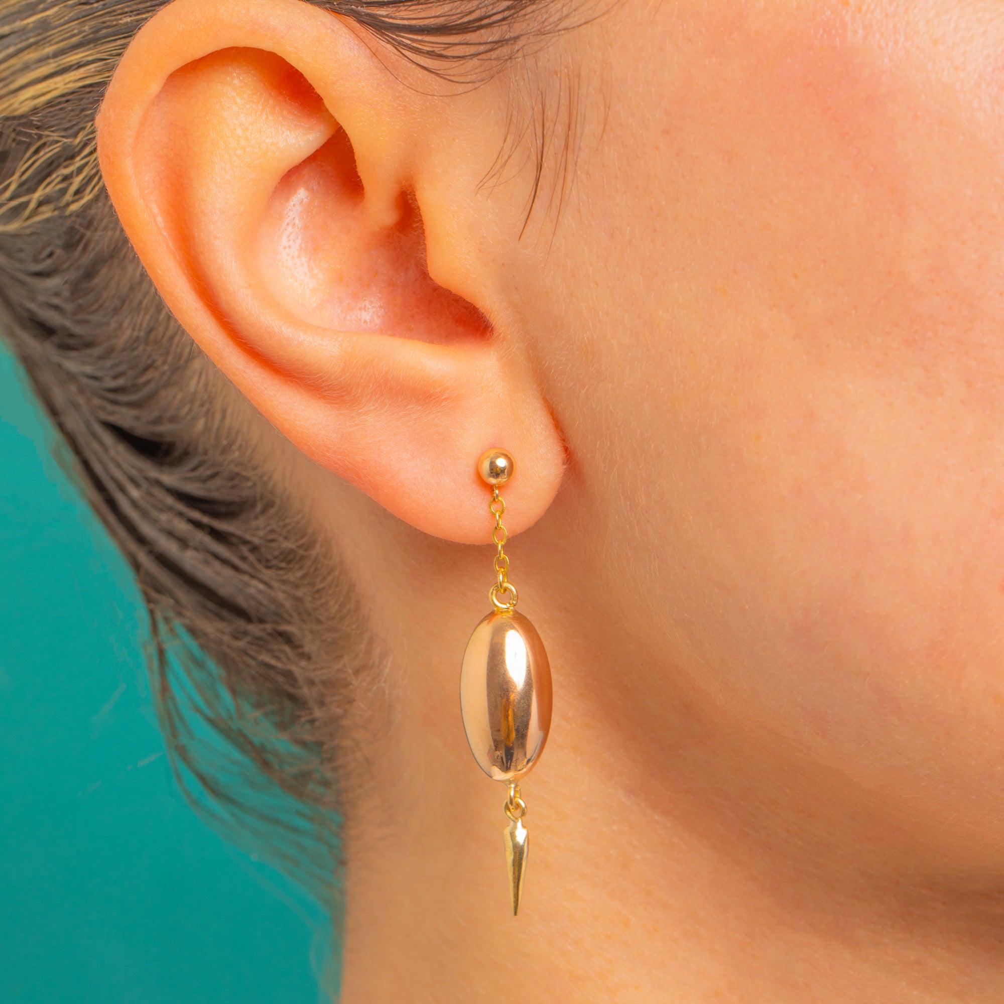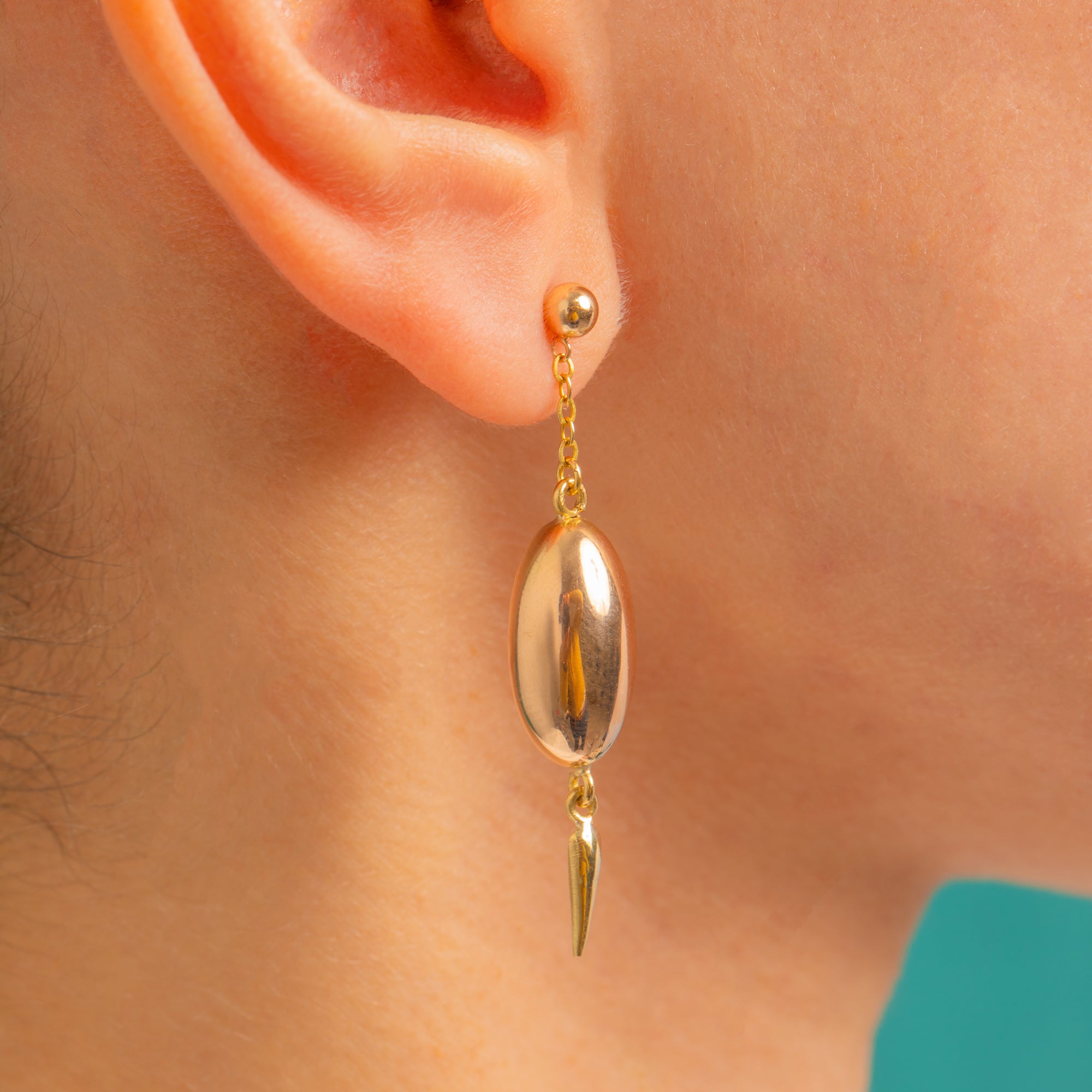 Sleek, sculptural and undeniably elegant, these Victorian torpedo drop earrings are beautifully rendered in glowing 15ct Gold. From a polished ball stud, a short length of chain leads the eye to a smooth elongated oval and a tapering finial, creating that classic torpedo silhouette with delicious, mirror-bright shine and graceful movement.