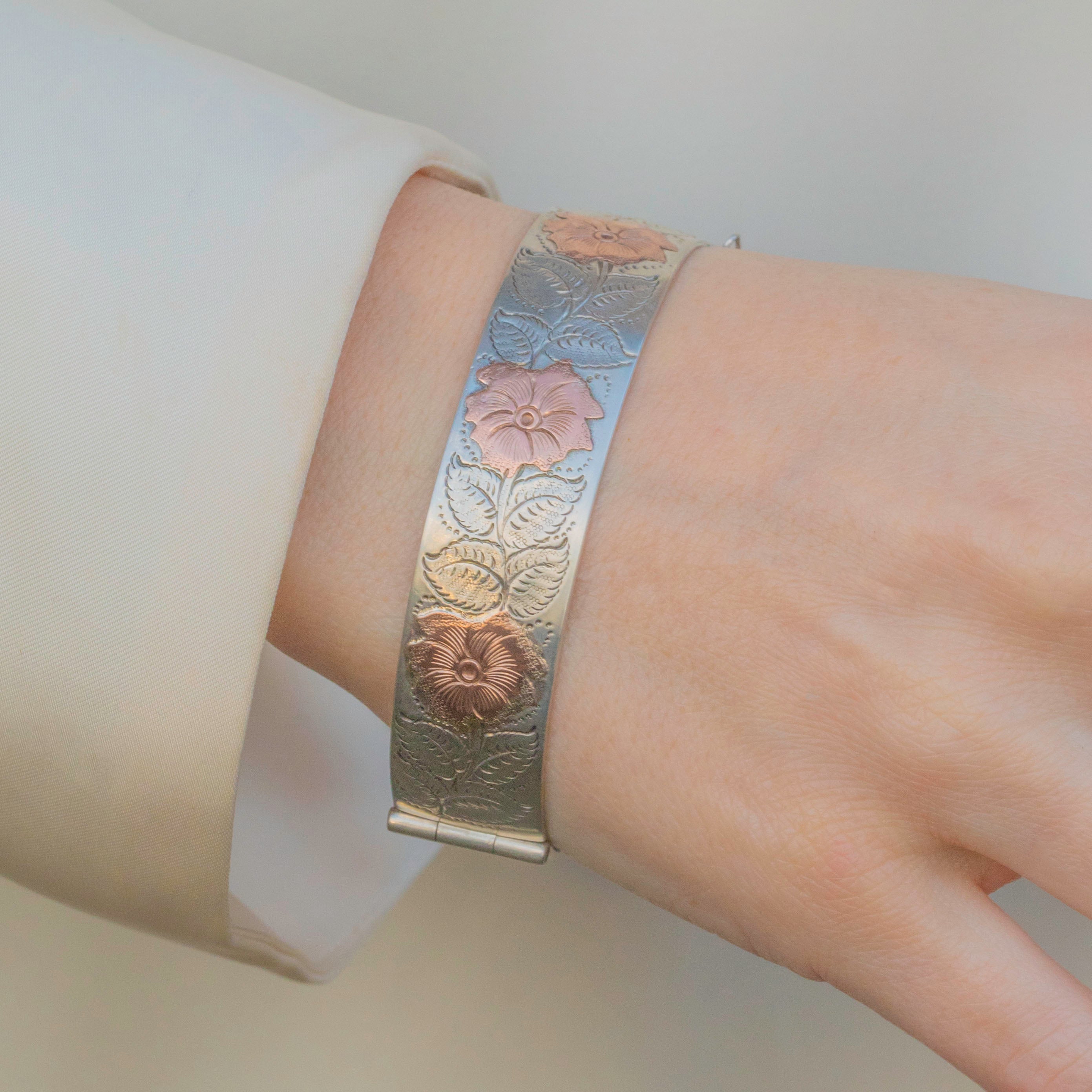 EXCELLENT. This Sterling Silver & 9ct Gold floral engraved bangle is in wonderful condition. The Sterling Silver is bright and glossy and the 9ct Gold accents are rich with rosy tones. She has retained her oval shape incredibly well and wears ever so comfortably. Her engraved details have remained crisp and clear, and she shuts with a satisfying 'click'! This mid-century cuff bangle will become your go-to piece!