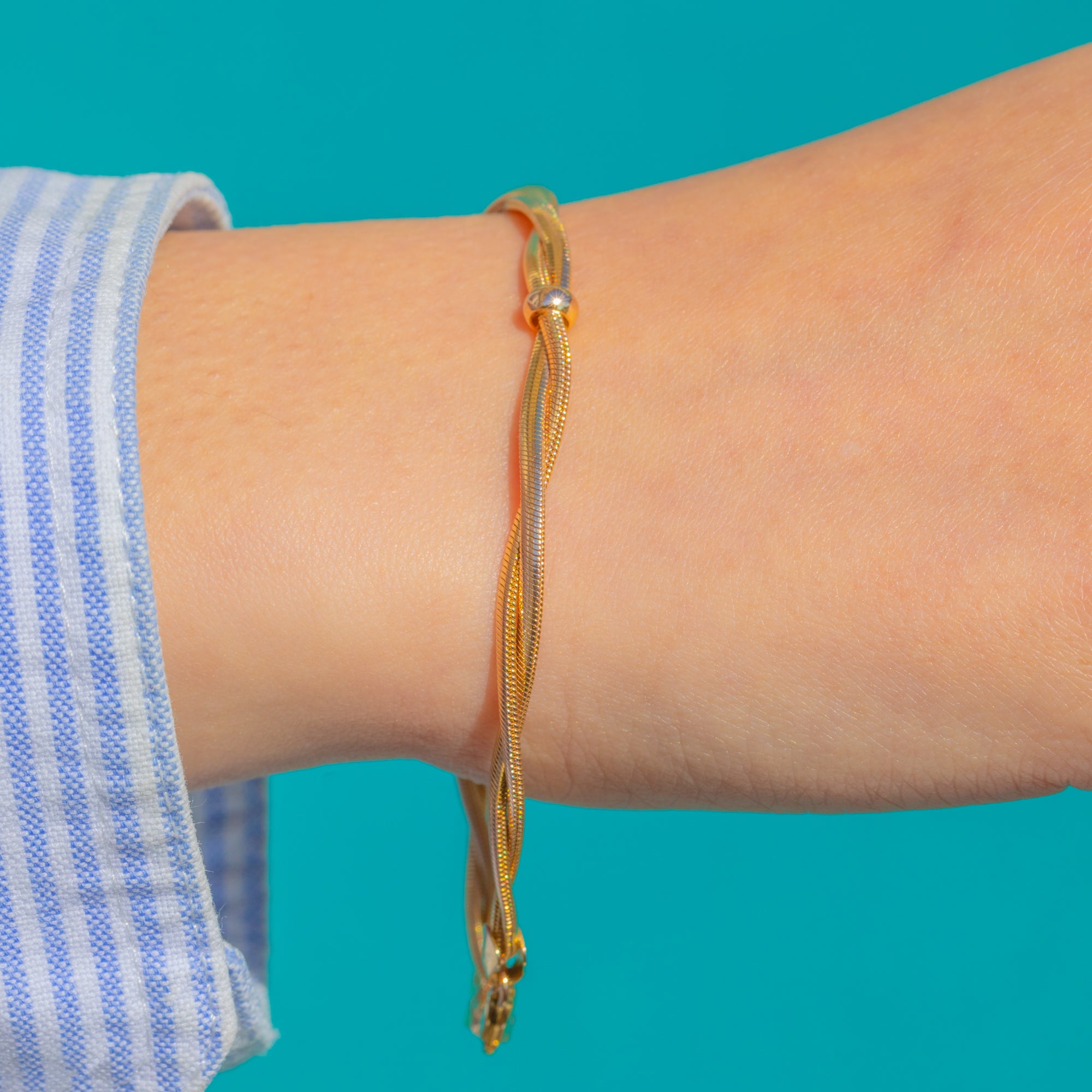 Elegant and effortlessly wearable, this Vintage 9ct Gold double snake bracelet is made up of two silky snake chains, gently twisted into a refined rope silhouette. The articulated links flowing smoothly around the wrist and catching the light with a bright, high-polish glow.