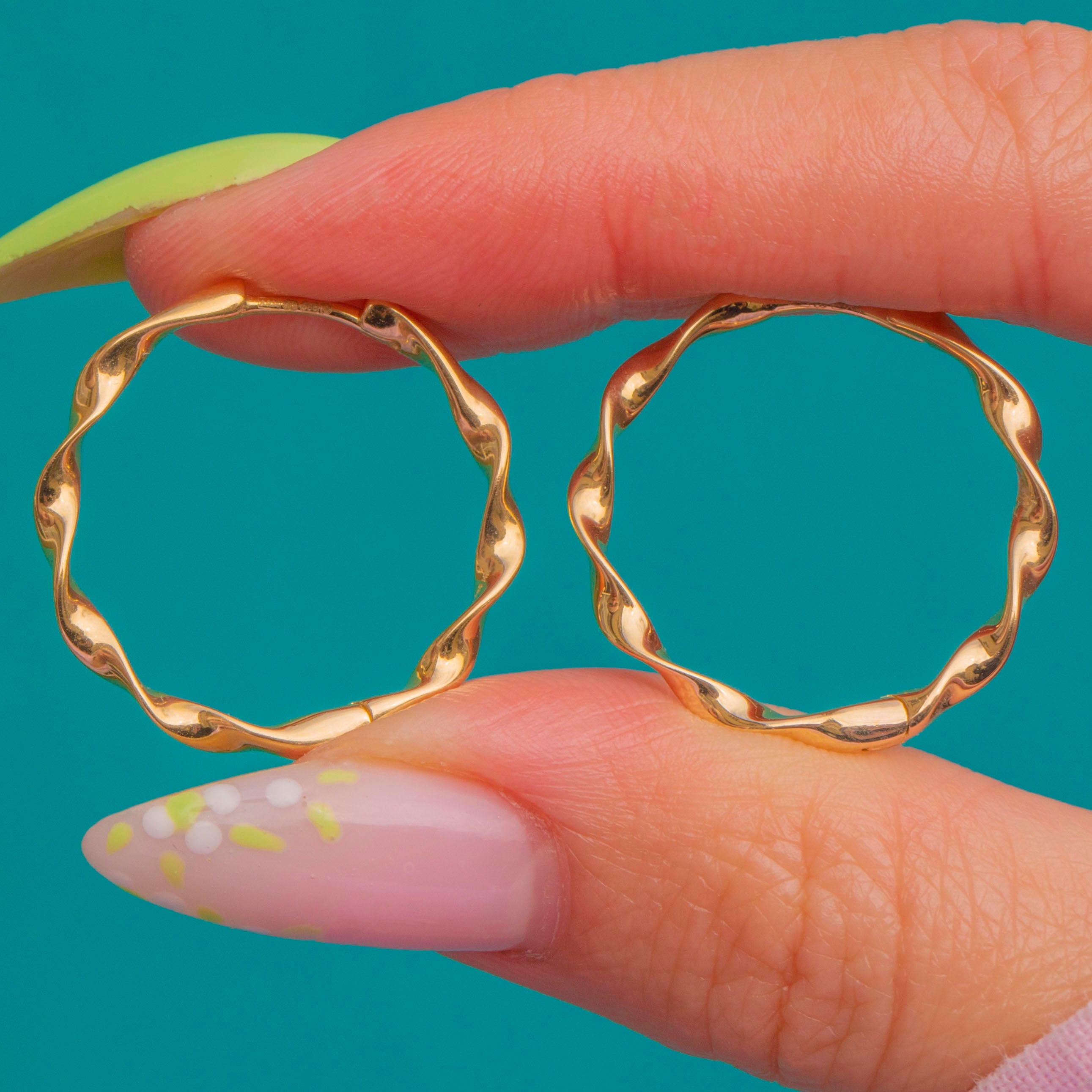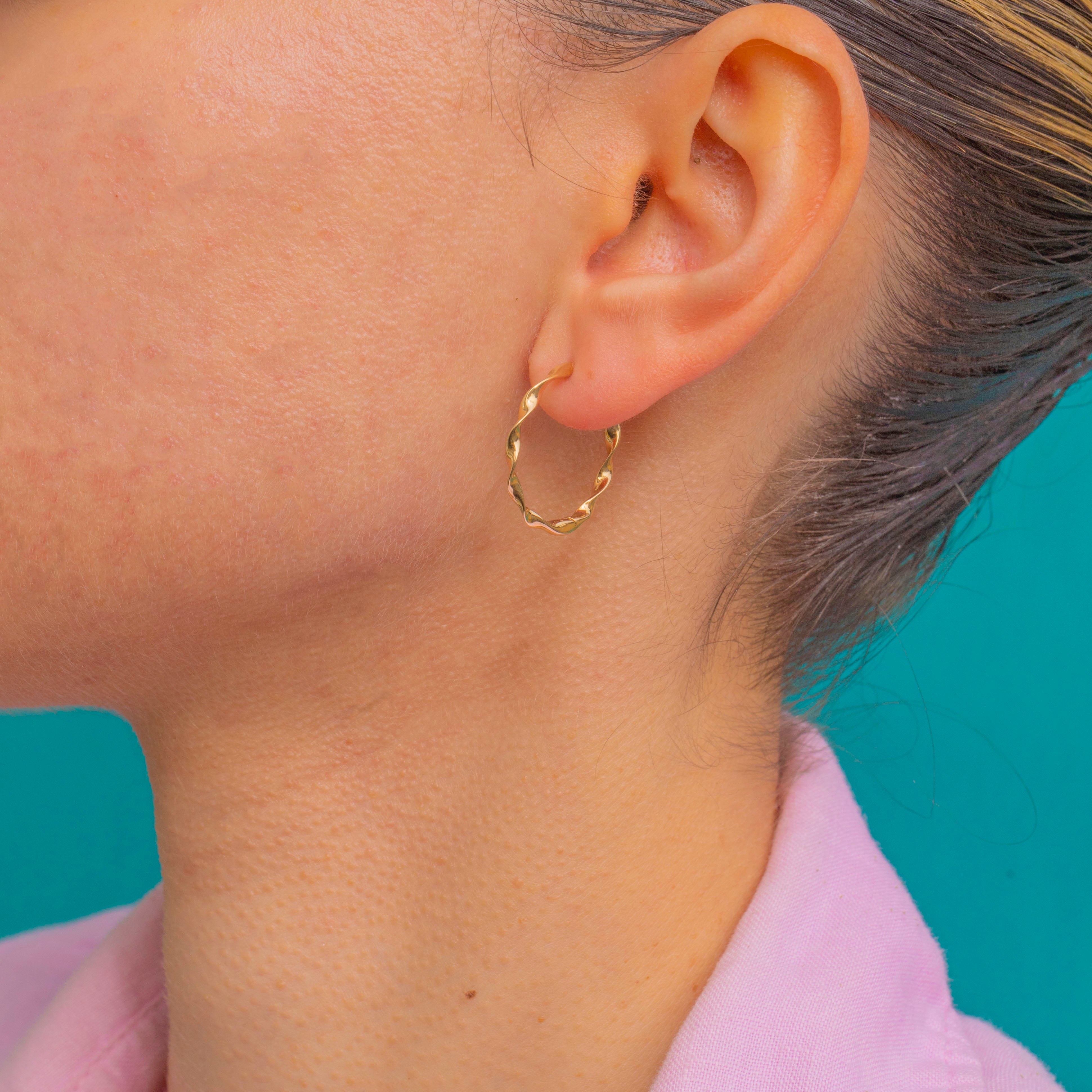 These twisted hoop earrings are effortlessly elegant. Crafted in solid 14ct Gold, their undulating ribbon silhouette and high-polish finish create a sculptural glow that feels refined yet understated—perfect for elevating your everyday.
