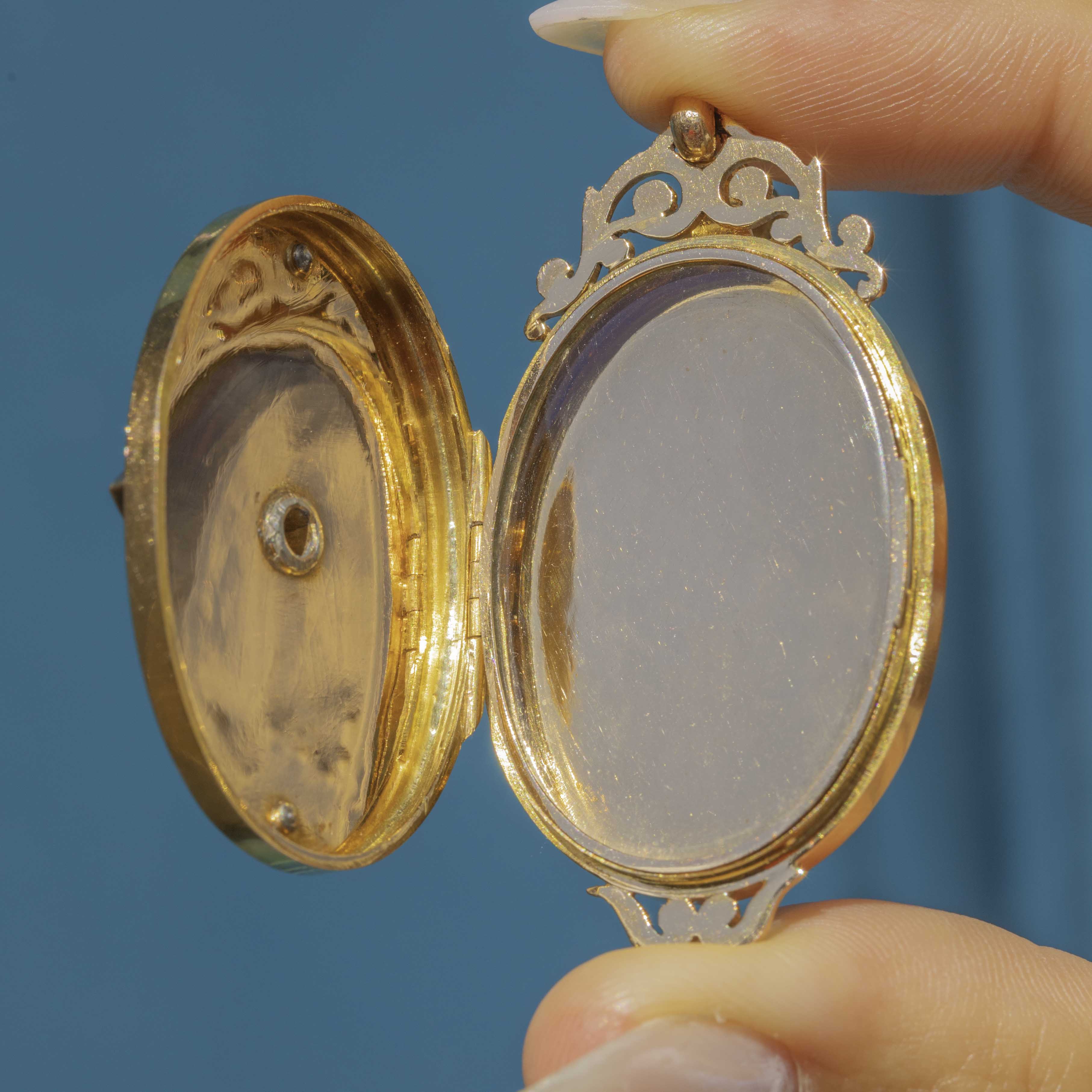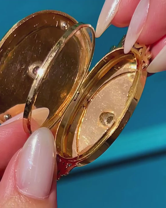 EXCELLENT: The Gold has a gorgeous rosy hue and the details are all intact, with no dings or scuffs visible on the locket. The Diamonds are bright, securely set, and free from chips or abrasions. The locket requires a firm push to open, but it closes securely so you can use and wear this Victorian locket with utmost confidence!