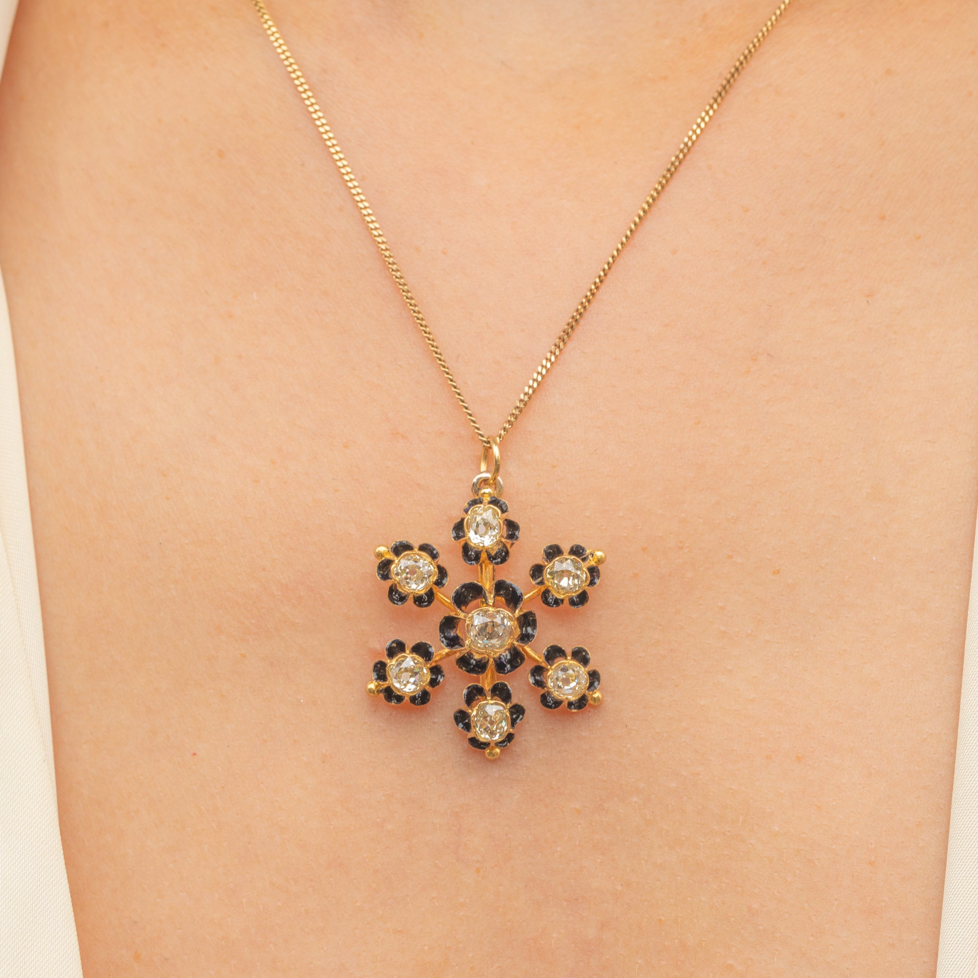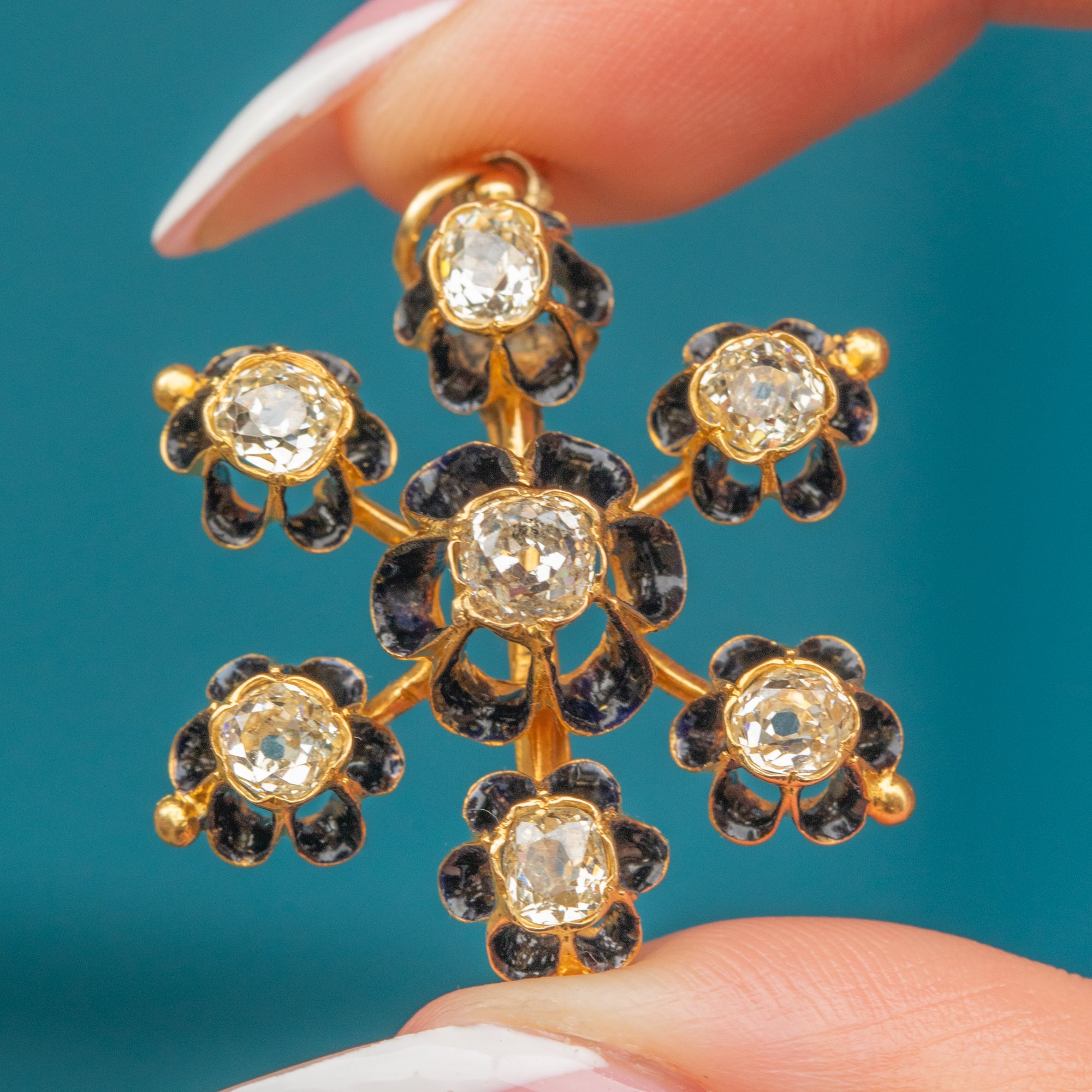 This superb Antique pendant showcases a dazzling cluster of Old Mine Cut Diamonds with a total weight of approximately 1.75ct.