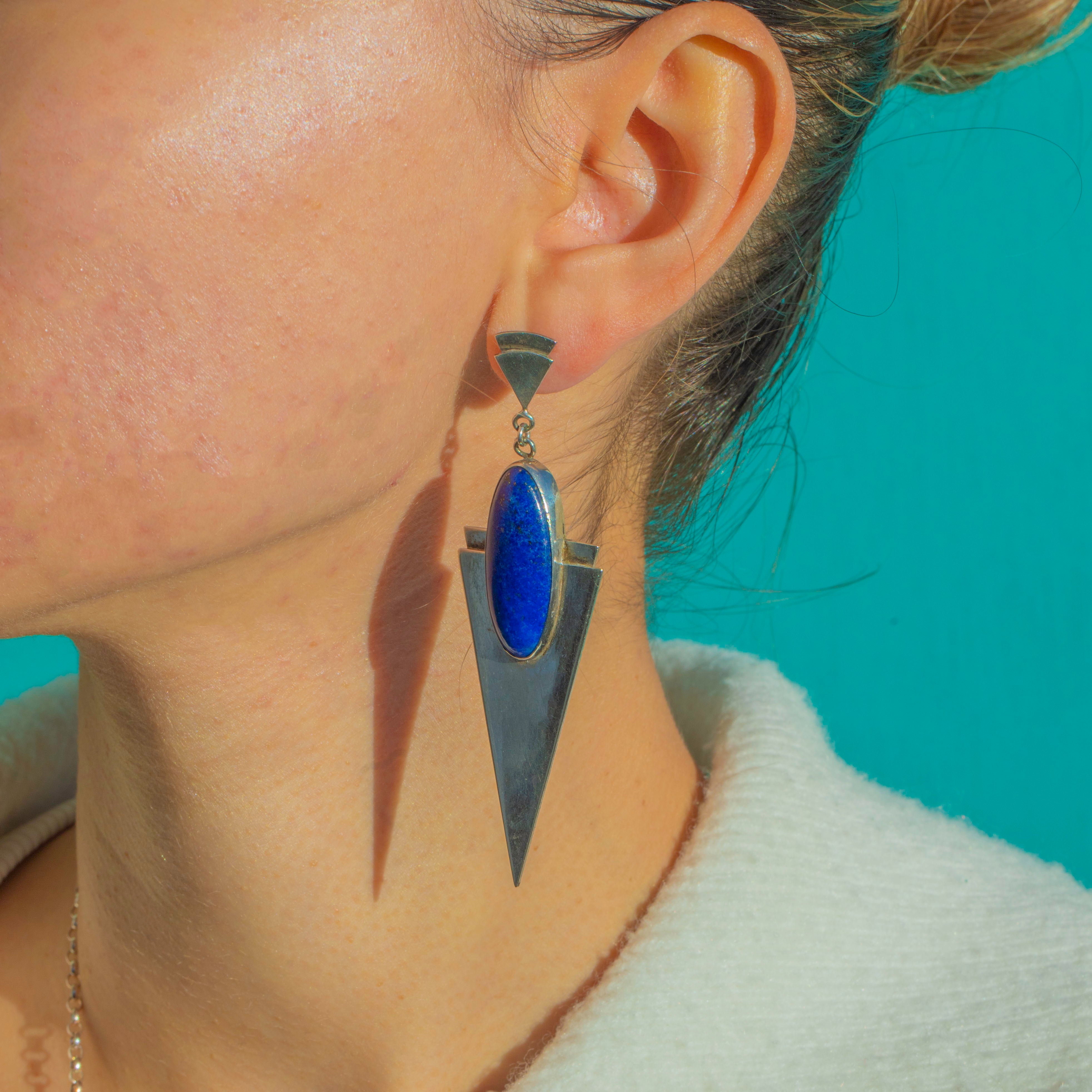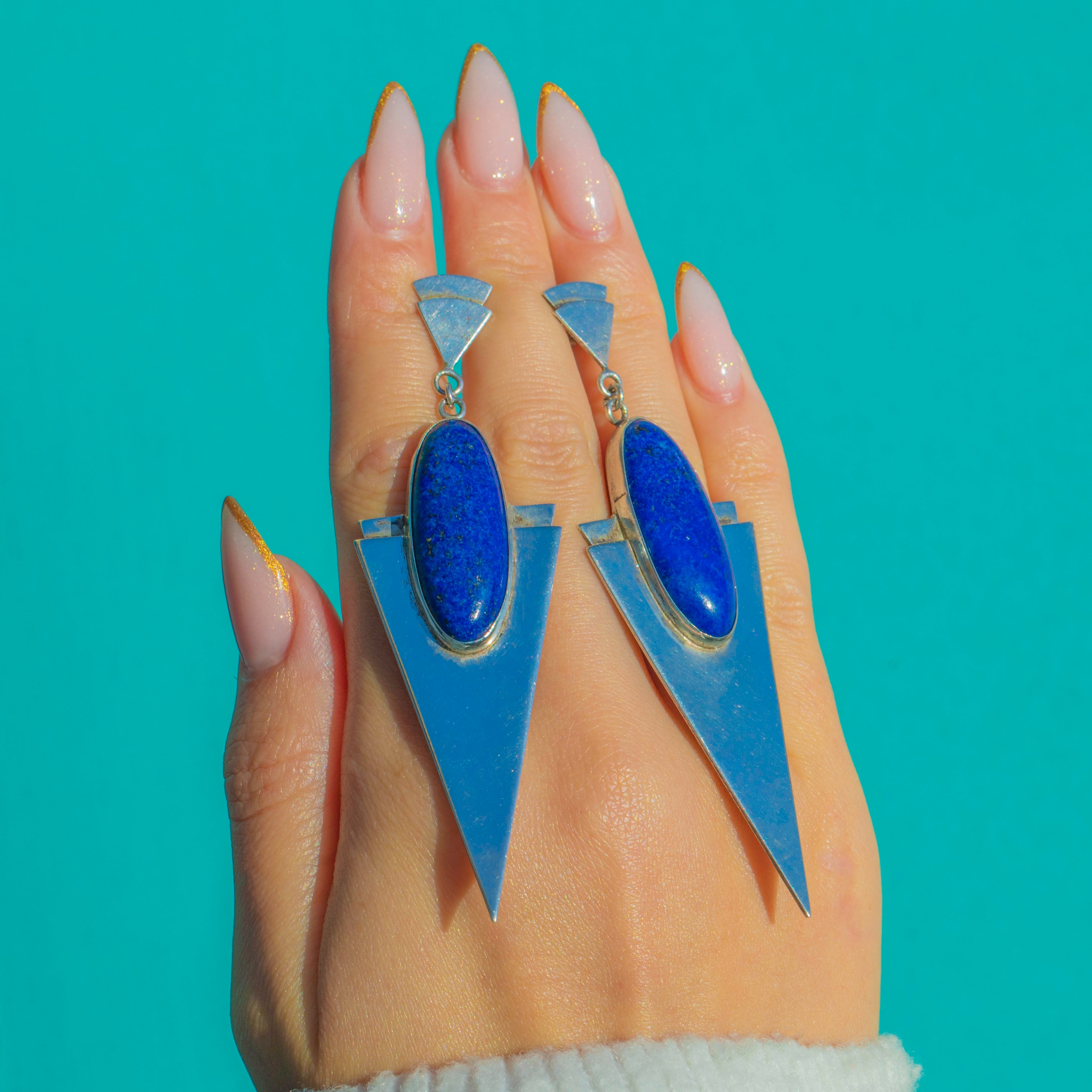 These incredible Van Peterson modernist earrings are a bold statement in sculptural Silver and vivid blue Lapis Lazuli. Crafted in the late 20th century, their sharp geometric silhouettes and elongated drops embody the sleek, architectural glamour the brand is known for.