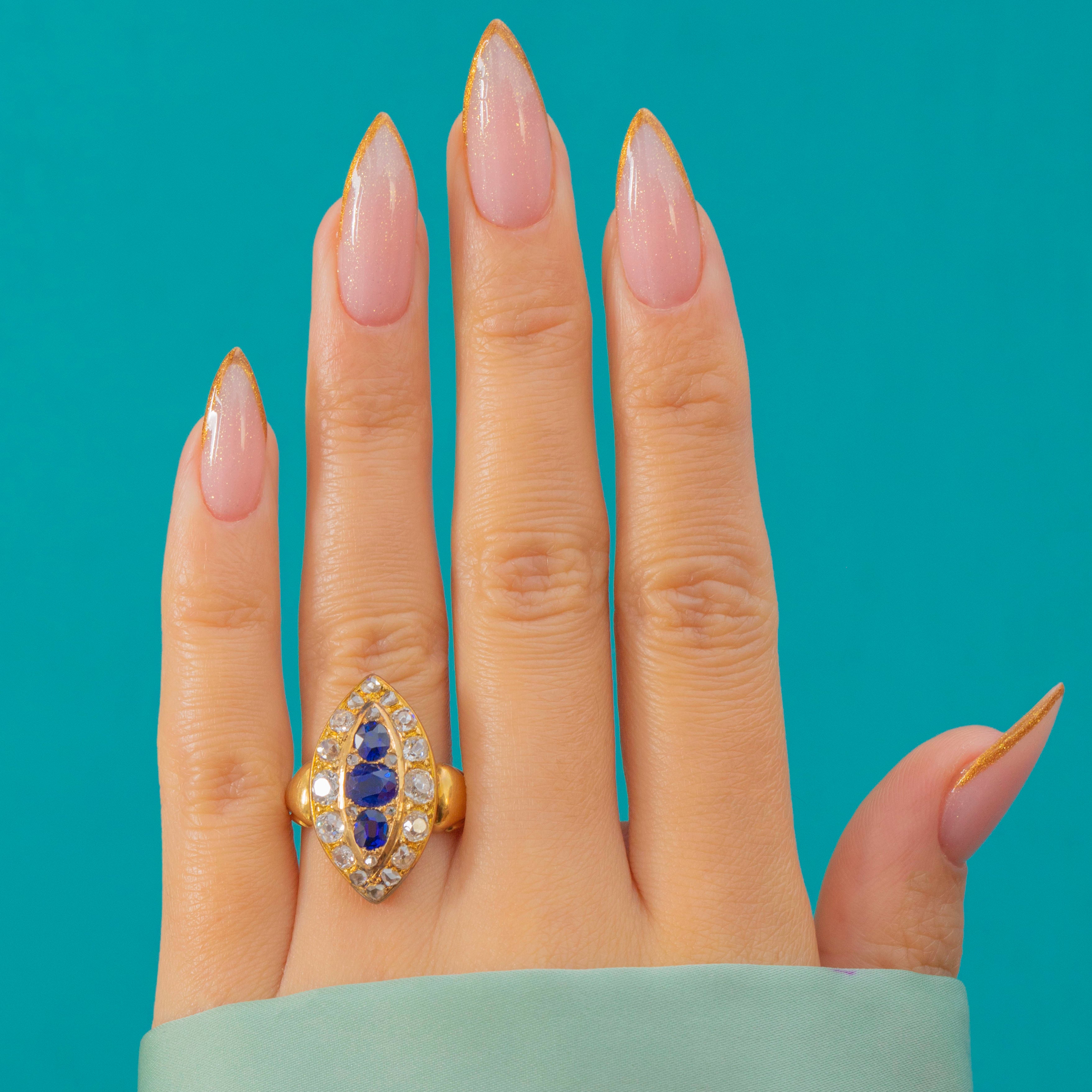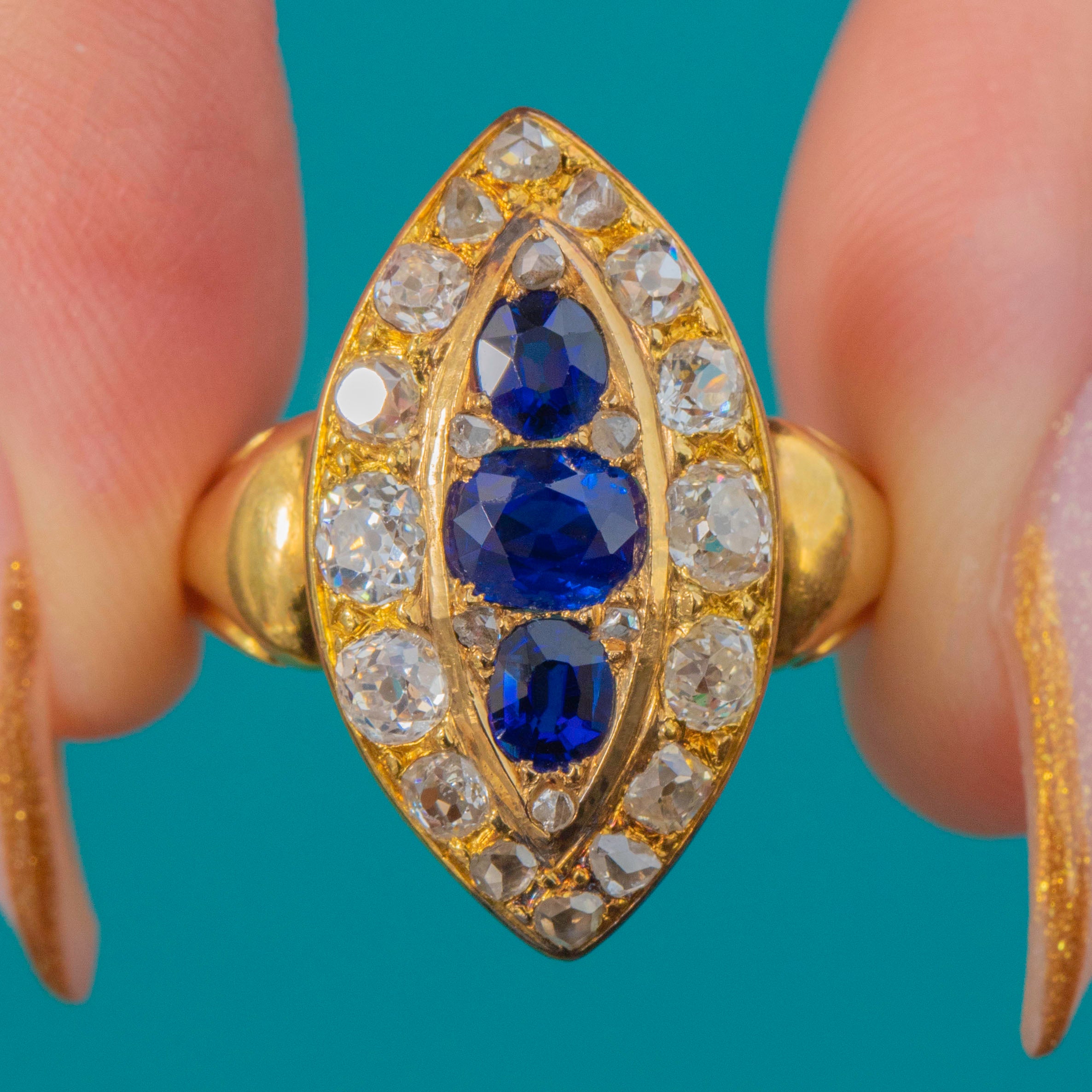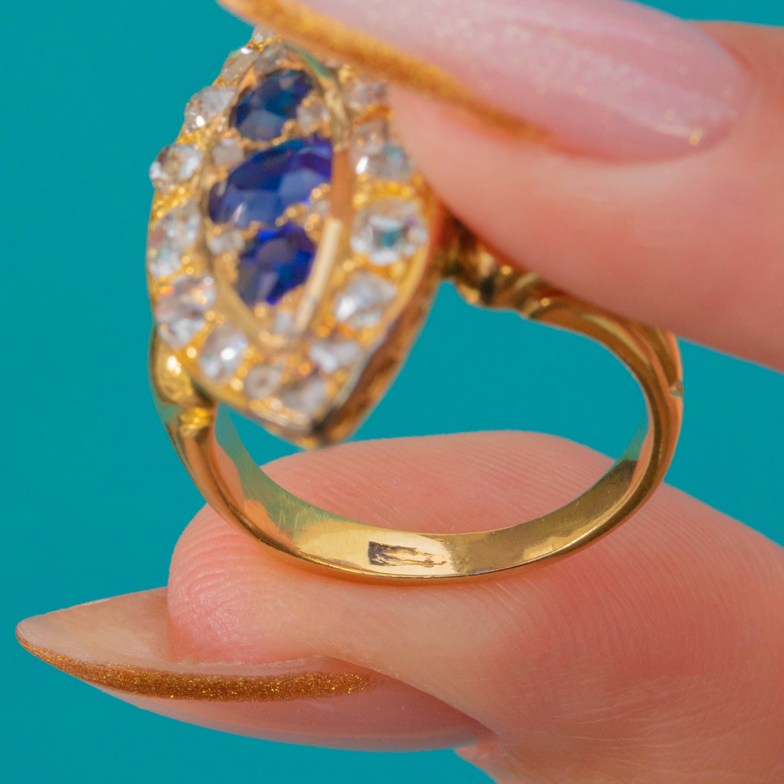 This exquisite late Victorian marquise cluster ring dazzles with a combination of vivid natural, unheated Sapphires and sparkling Old Cut Diamonds. The elongated navette form is both flattering and elegant, showing off the deep royal blue of the Sapphires perfectly against their Diamond surround. Crafted in rich 18ct Gold, this piece captures the opulent style of the 1890s with remarkable craftsmanship and presence.