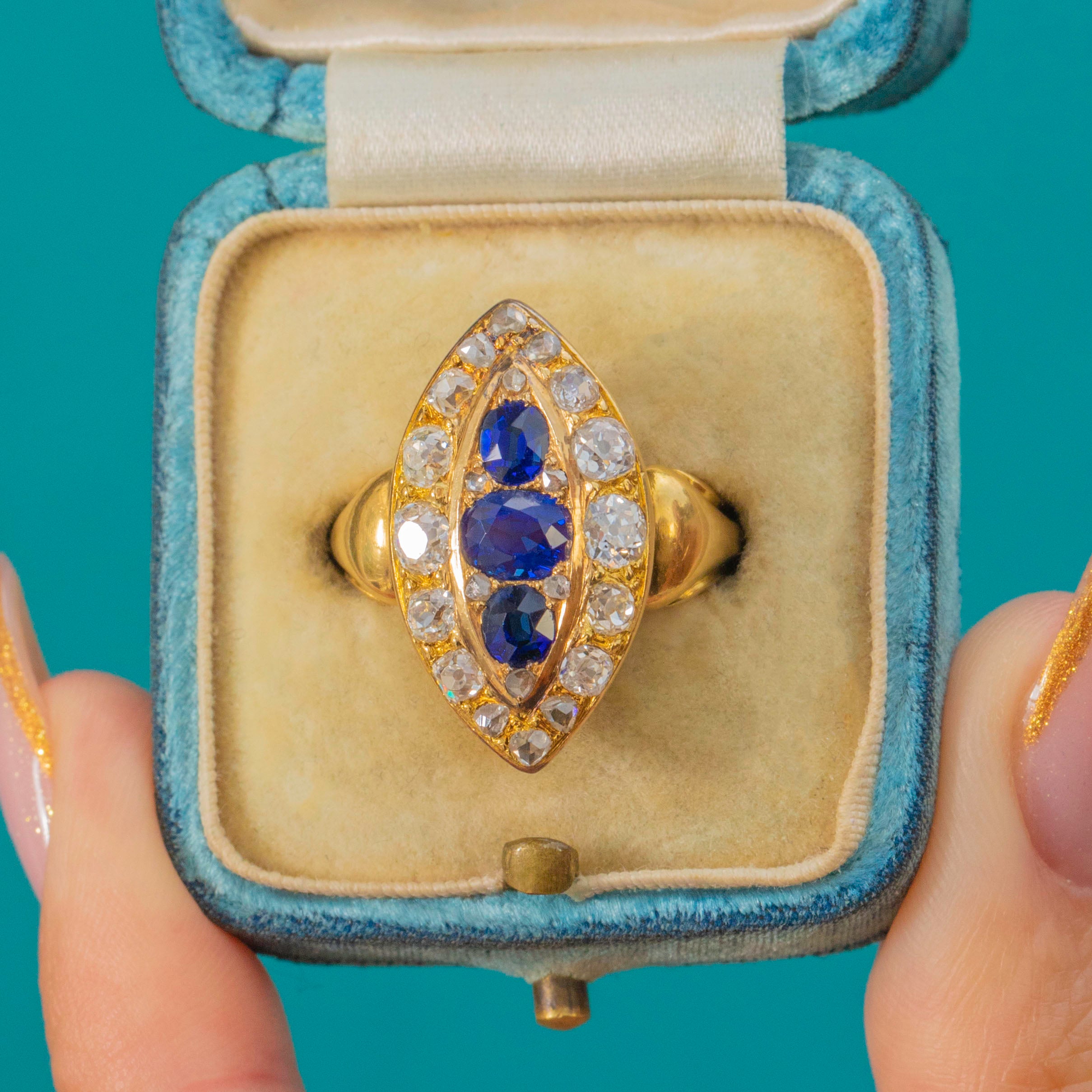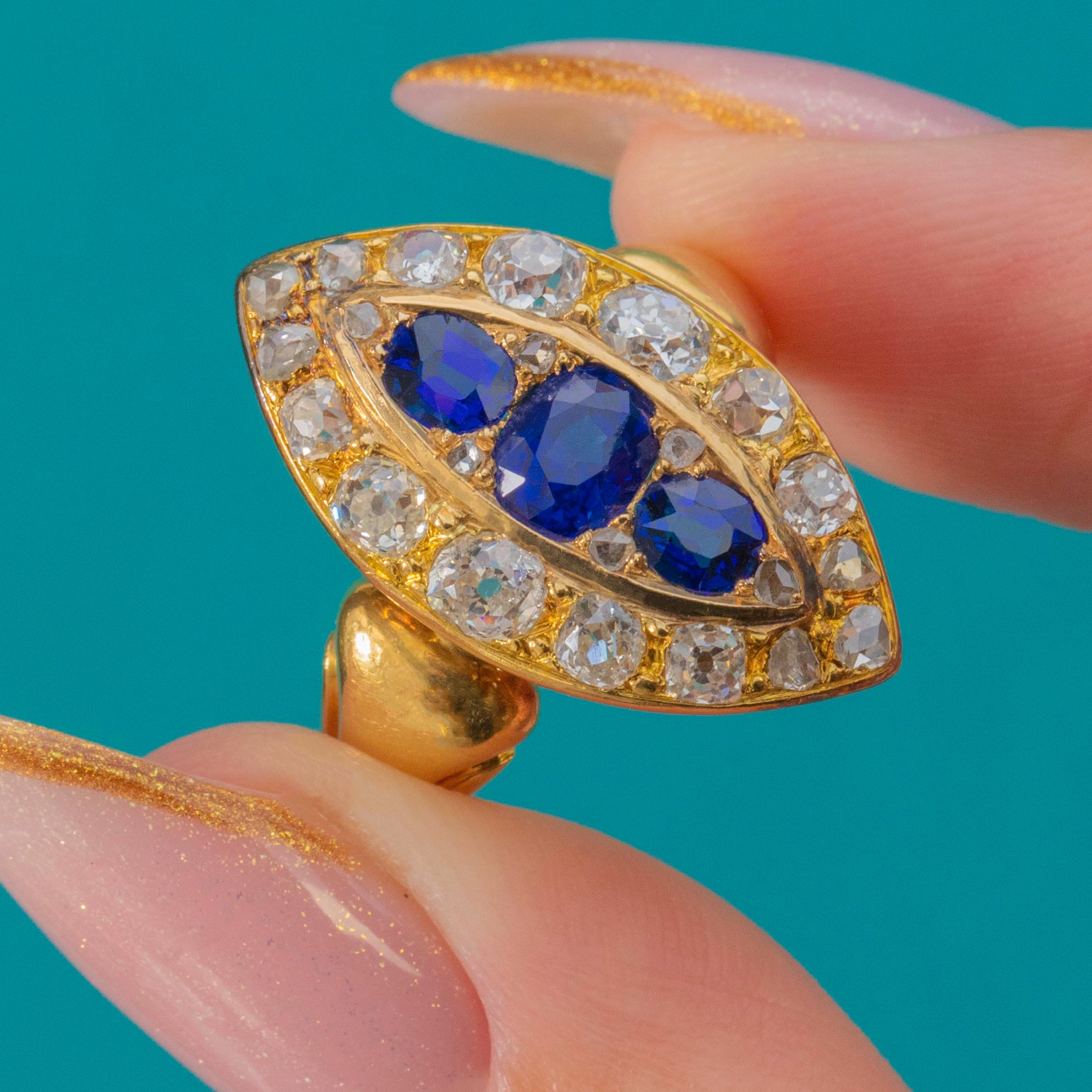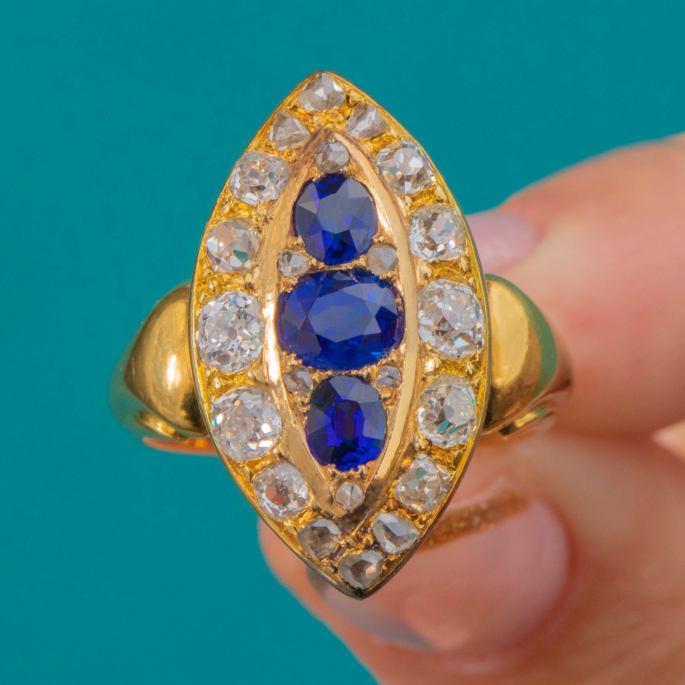 This exquisite late Victorian marquise cluster ring dazzles with a combination of vivid natural, unheated Sapphires and sparkling Old Cut Diamonds. The elongated navette form is both flattering and elegant, showing off the deep royal blue of the Sapphires perfectly against their Diamond surround. Crafted in rich 18ct Gold, this piece captures the opulent style of the 1890s with remarkable craftsmanship and presence.