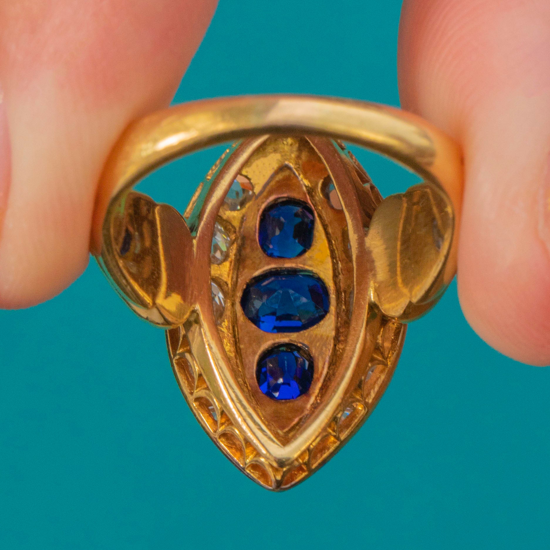 MATERIALS: Tests as 18ct Gold, natural unheated Sapphires (1.35ct), Old Cut Diamonds (0.80ct).
