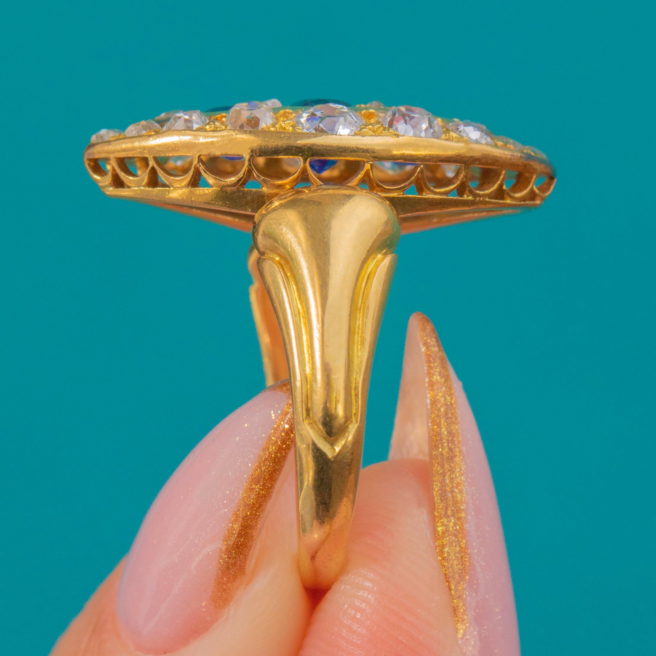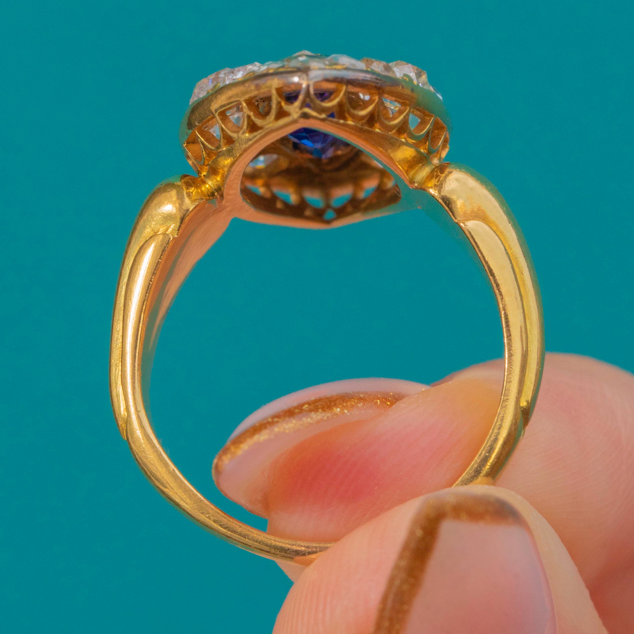 The Sapphires total approximately 1.35ct and are beautifully saturated and bright, while the surrounding Old Cut Diamonds total around 0.80ct, offering a charming antique sparkle. A truly luxurious Victorian statement ring that radiates timeless beauty.