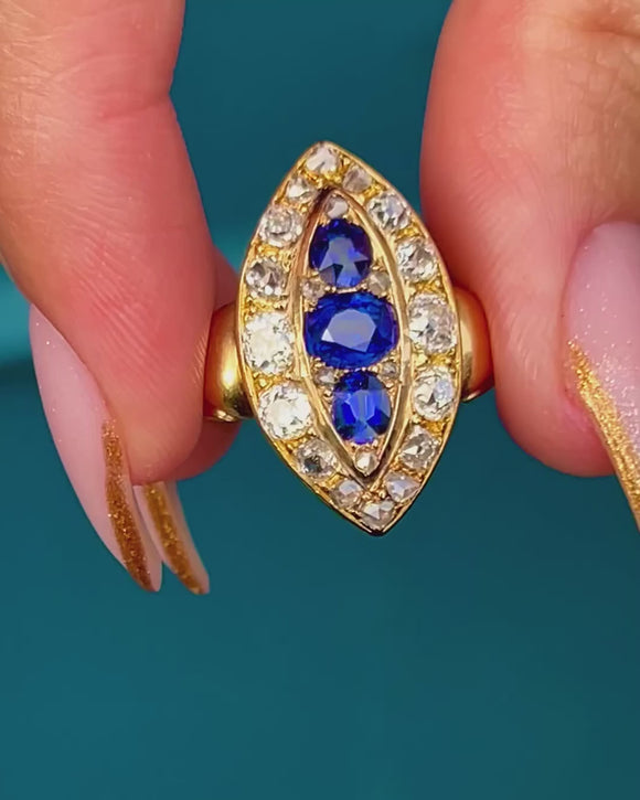 Victorian 1.35ct Sapphire & 0.80ct Old Cut Diamond Marquise Cluster Ring, c.1895 Item added