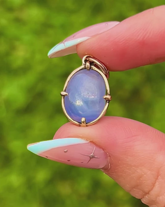 A delicate Victorian charm pendant showcasing a natural, no-heat Star Sapphire of approximately 11.00ct, set in warm 9ct Gold. The oval cabochon glows with a soft, silken luminosity in pale blue to bluish-grey, cradled by four neat claws within an open-backed collet for beautiful light play.
