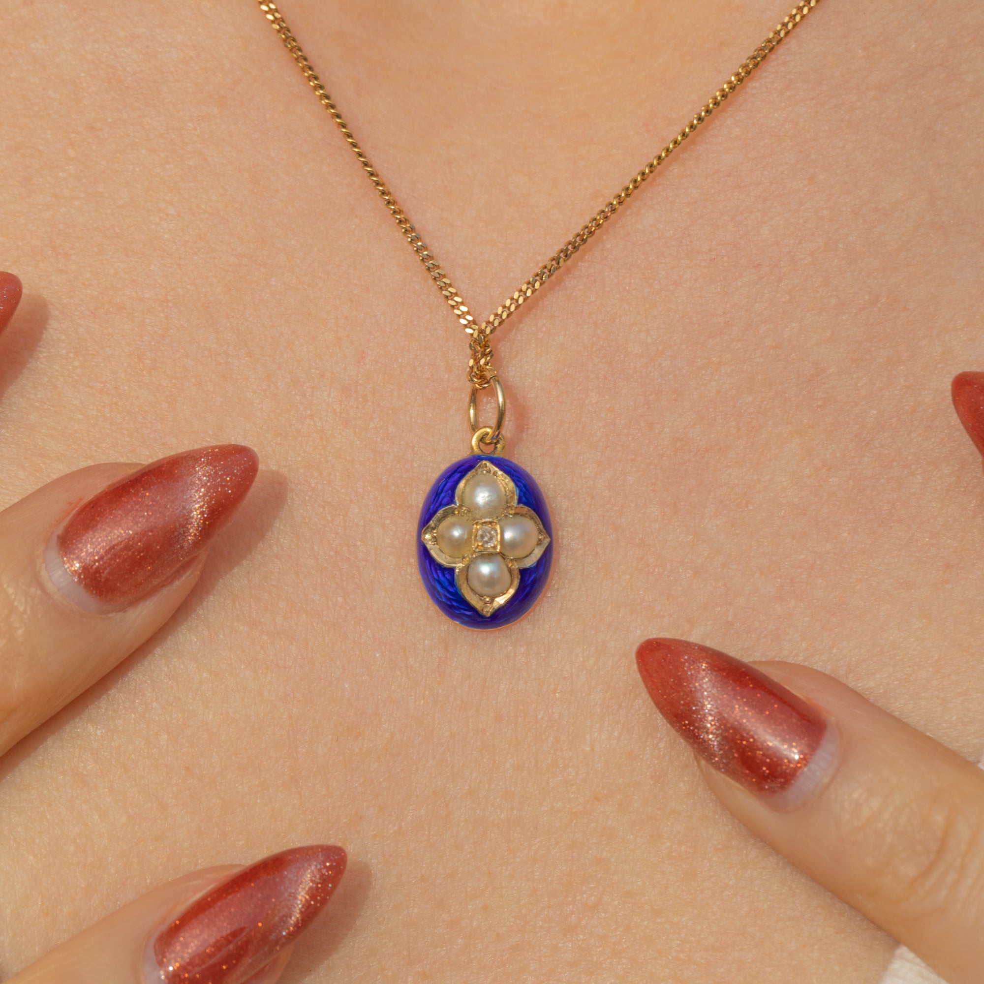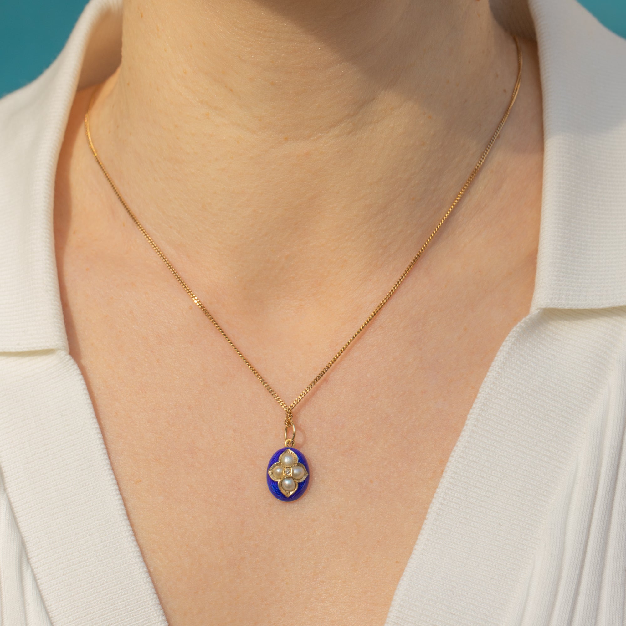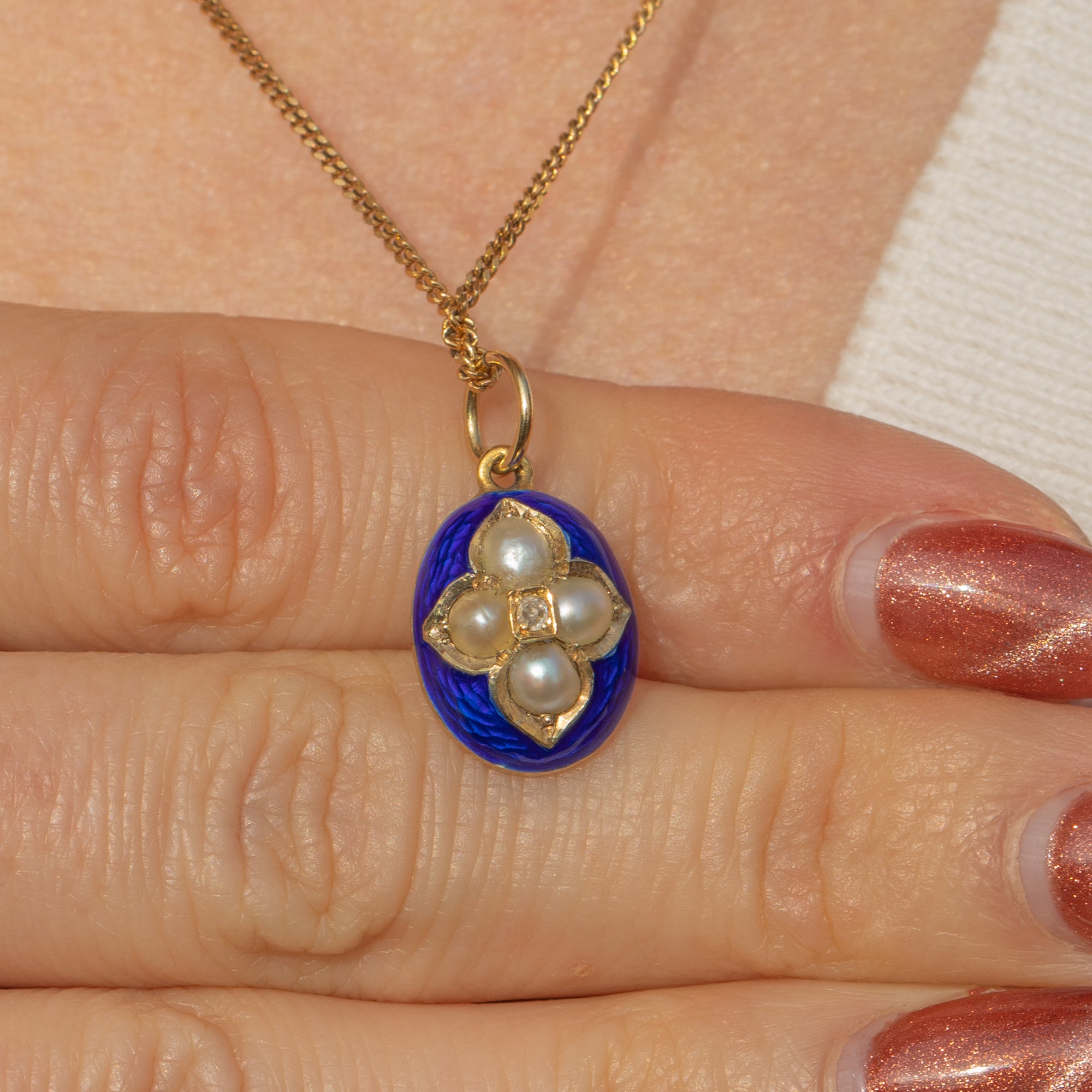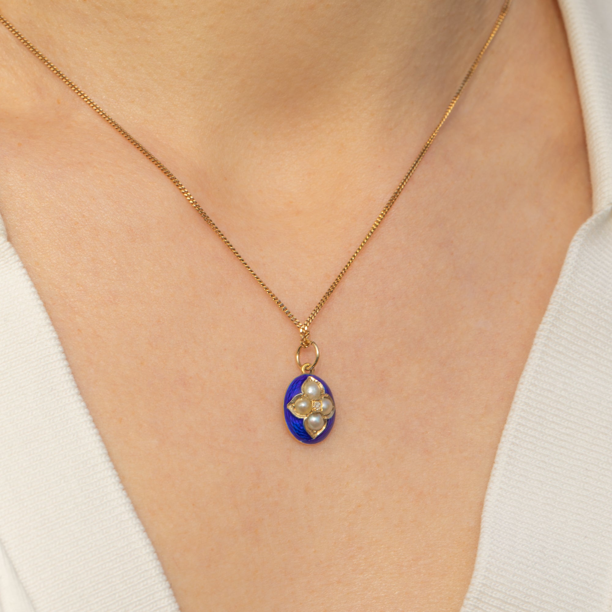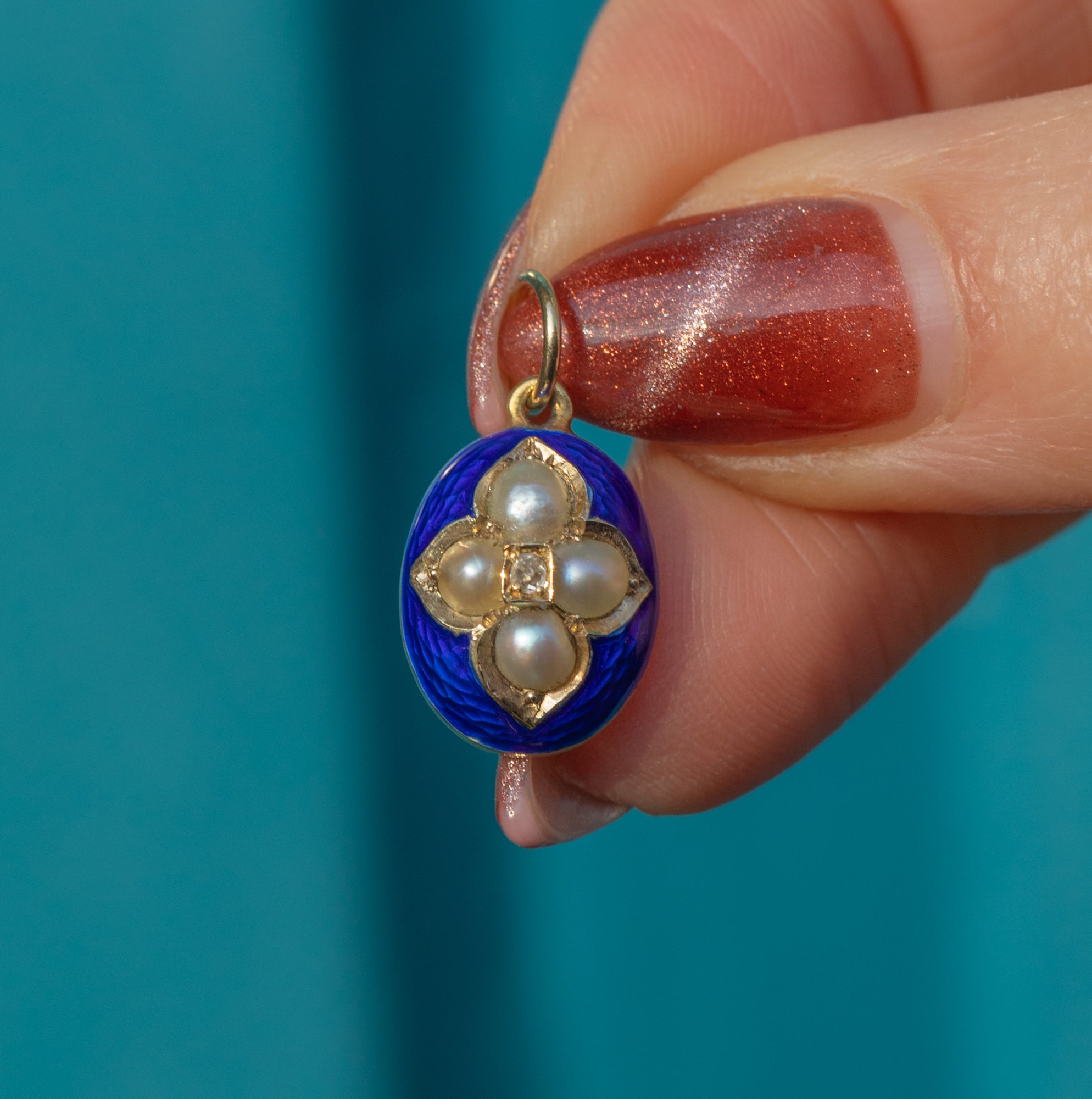 MATERIALS: Tests as 15ct Gold, 18ct Gold jump ring, Blue Enamel, Pearl, Diamond.
