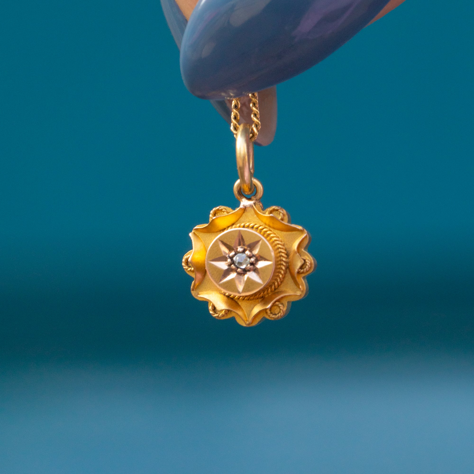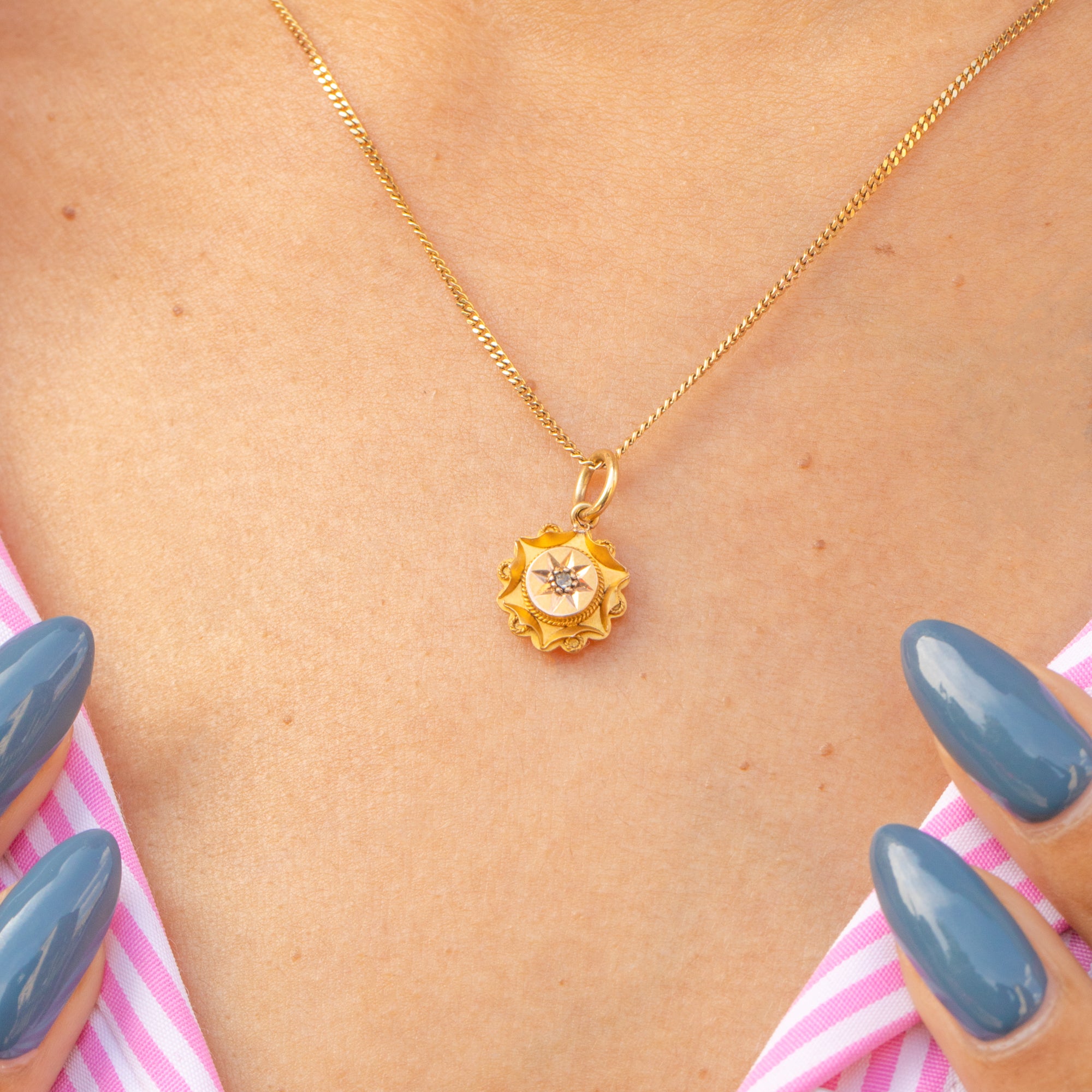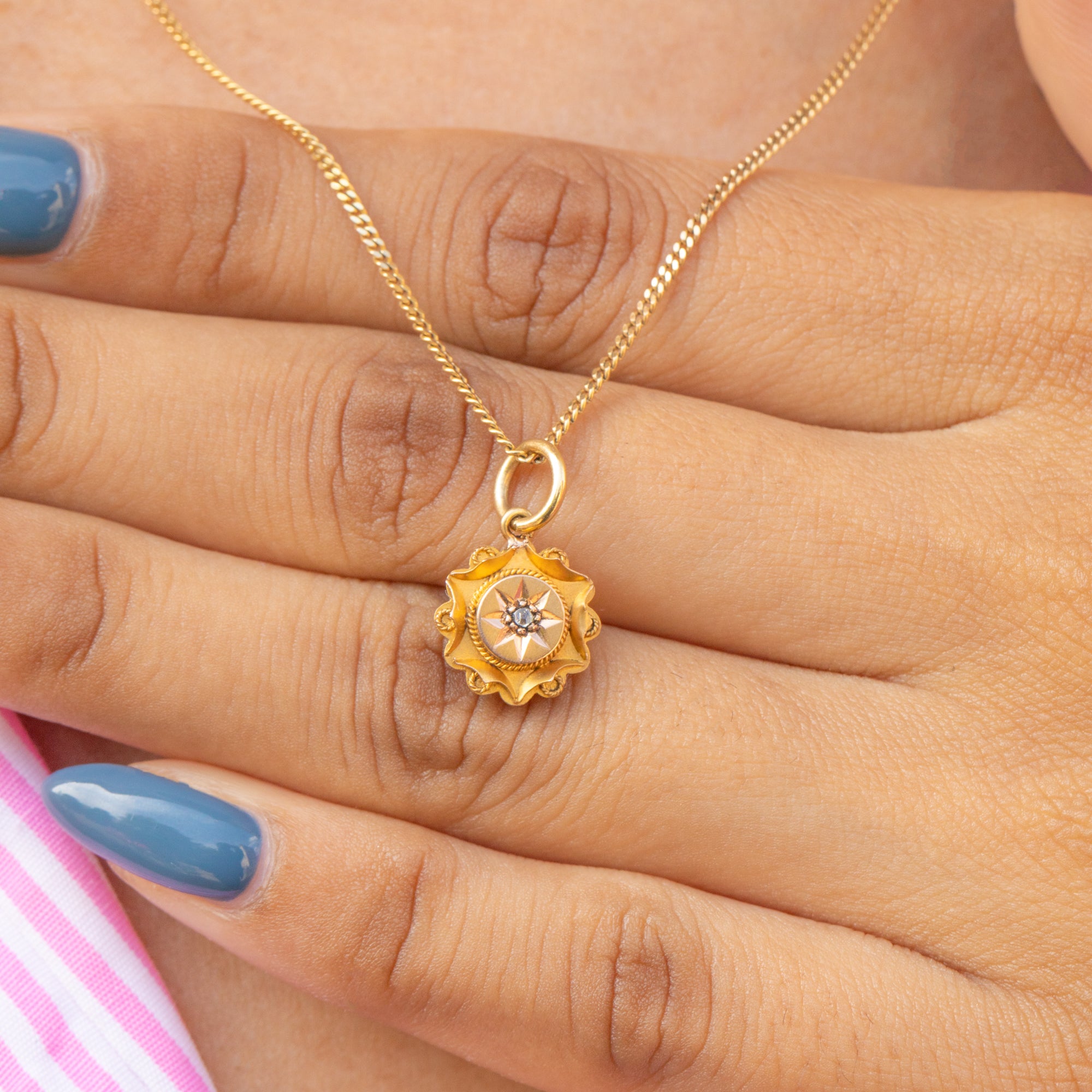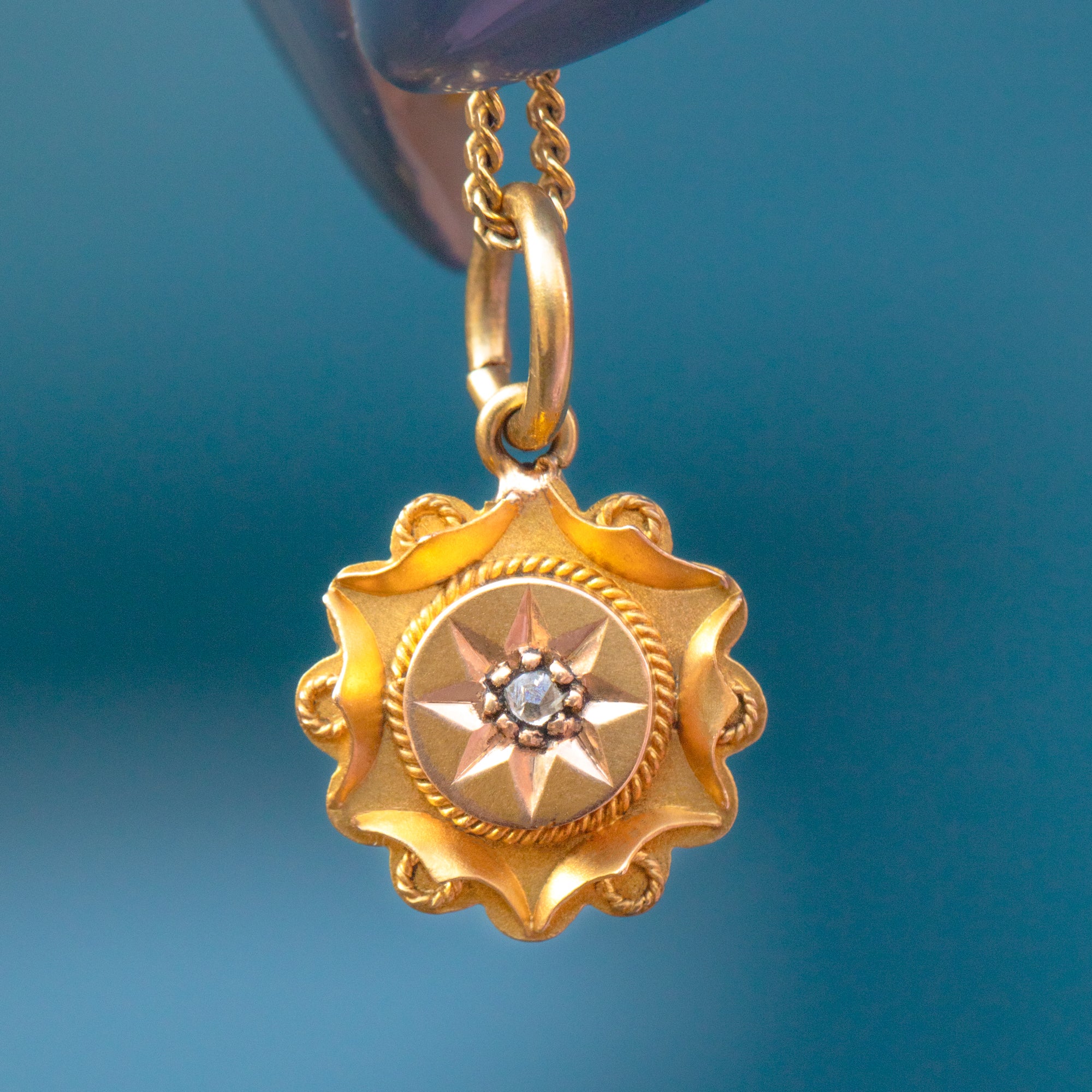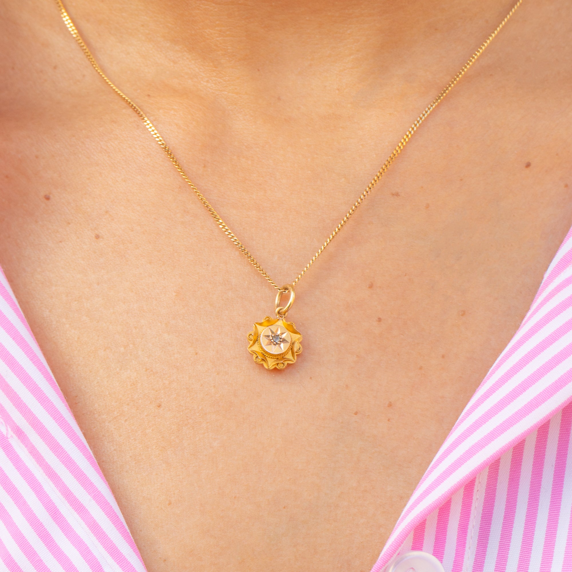 VERY GOOD. This Victorian 15ct Gold Diamond Etruscan charm is in very good condition. The 15ct Gold has a wonderful saturated hue and the rope detailing is firmly soldered around. On the back, there is some subtle wear from her conversion from a stick pin which cannot be seen when worn. A Victorian Diamond pendant with heaps of opportunity to style amongst your other Gold goodies!