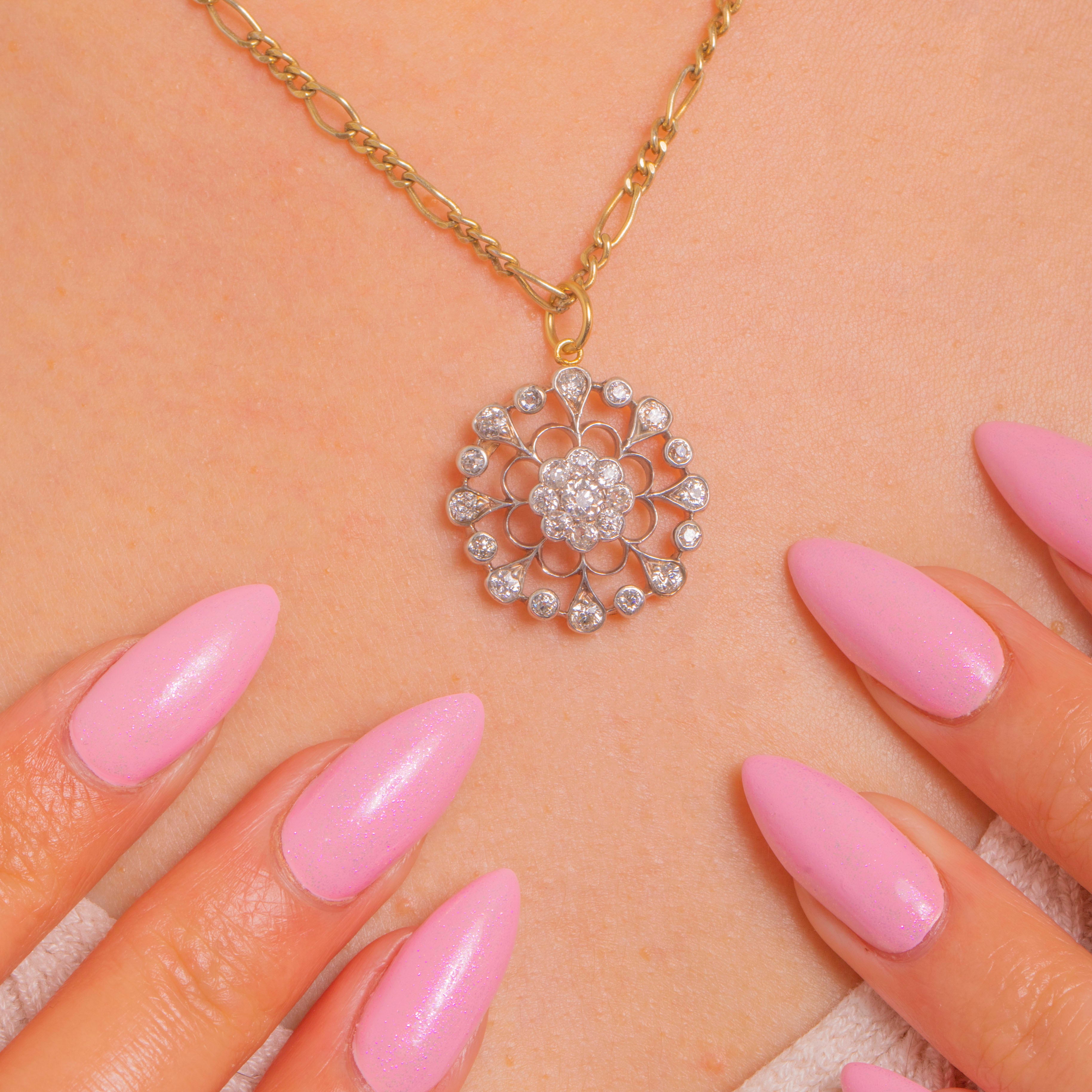Silver-topped Gold was a beloved 19th-century pairing, marrying a bright, icy shimmer to a warm Golden glow. Utterly feminine and beautifully detailed, this pendant is a timeless bloom you’ll treasure for generations.