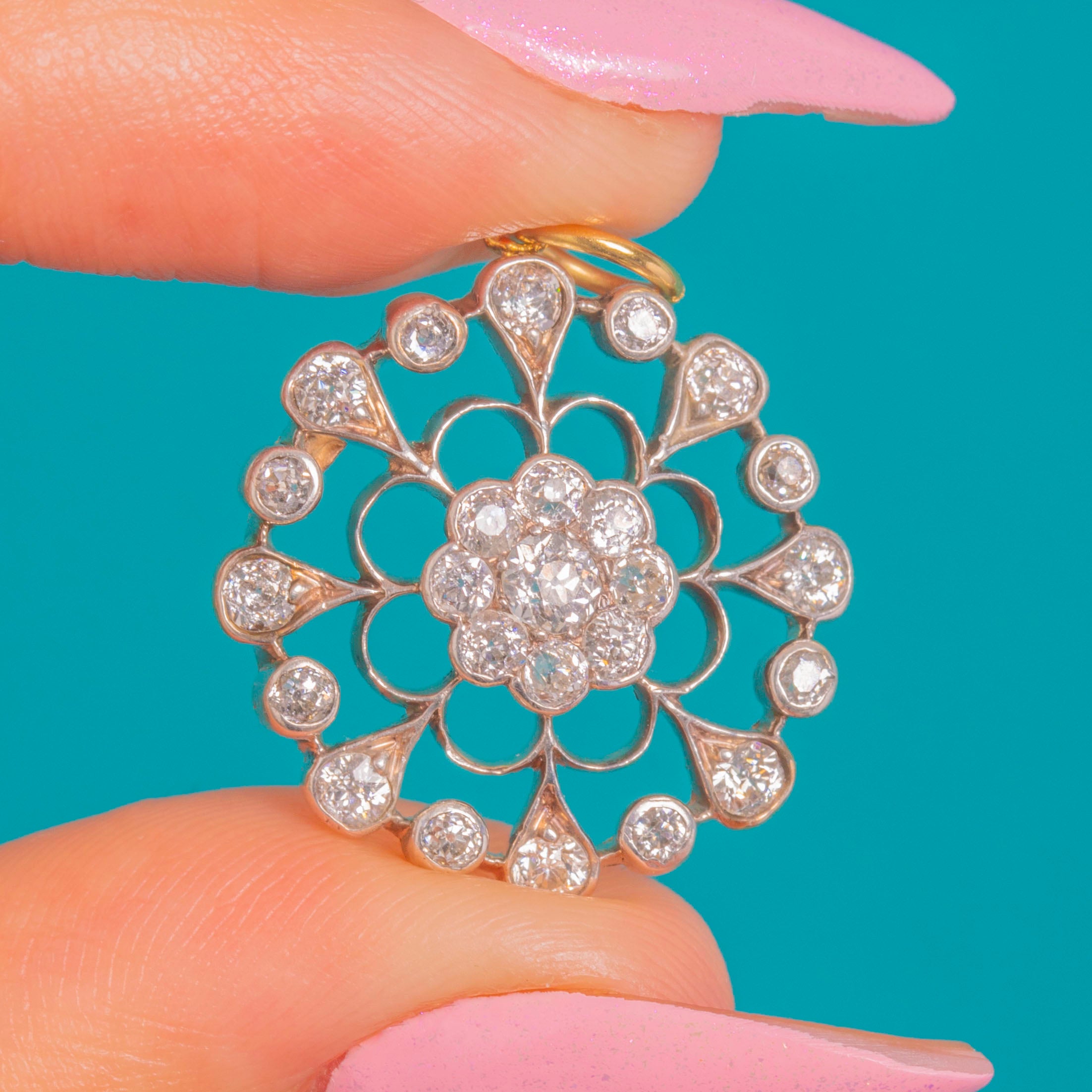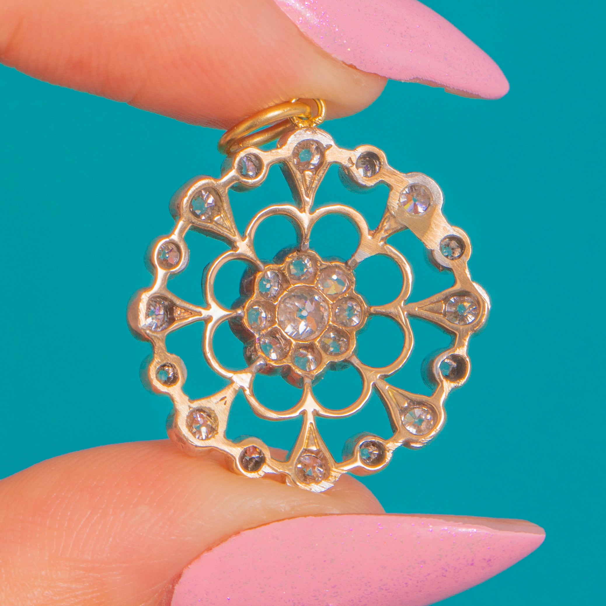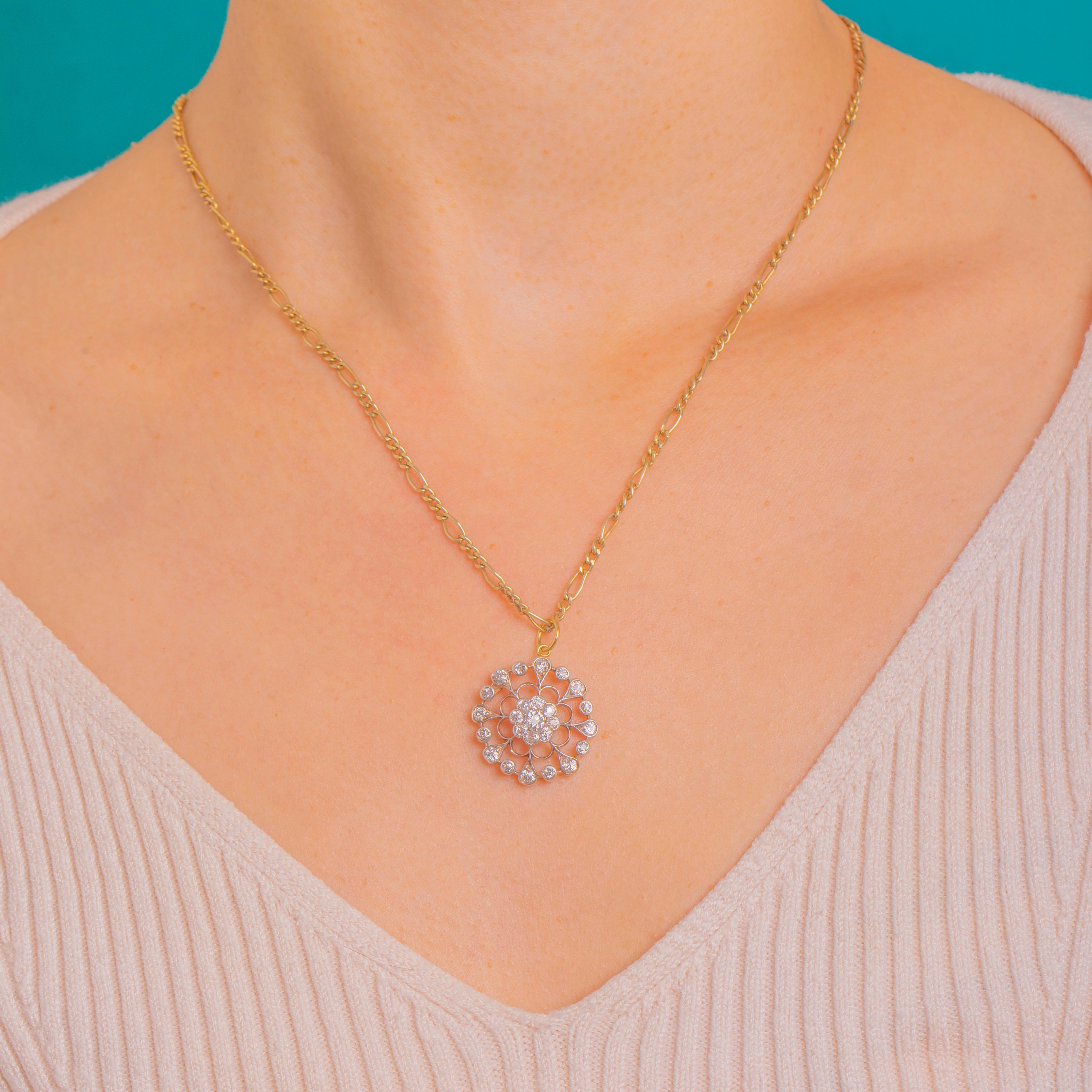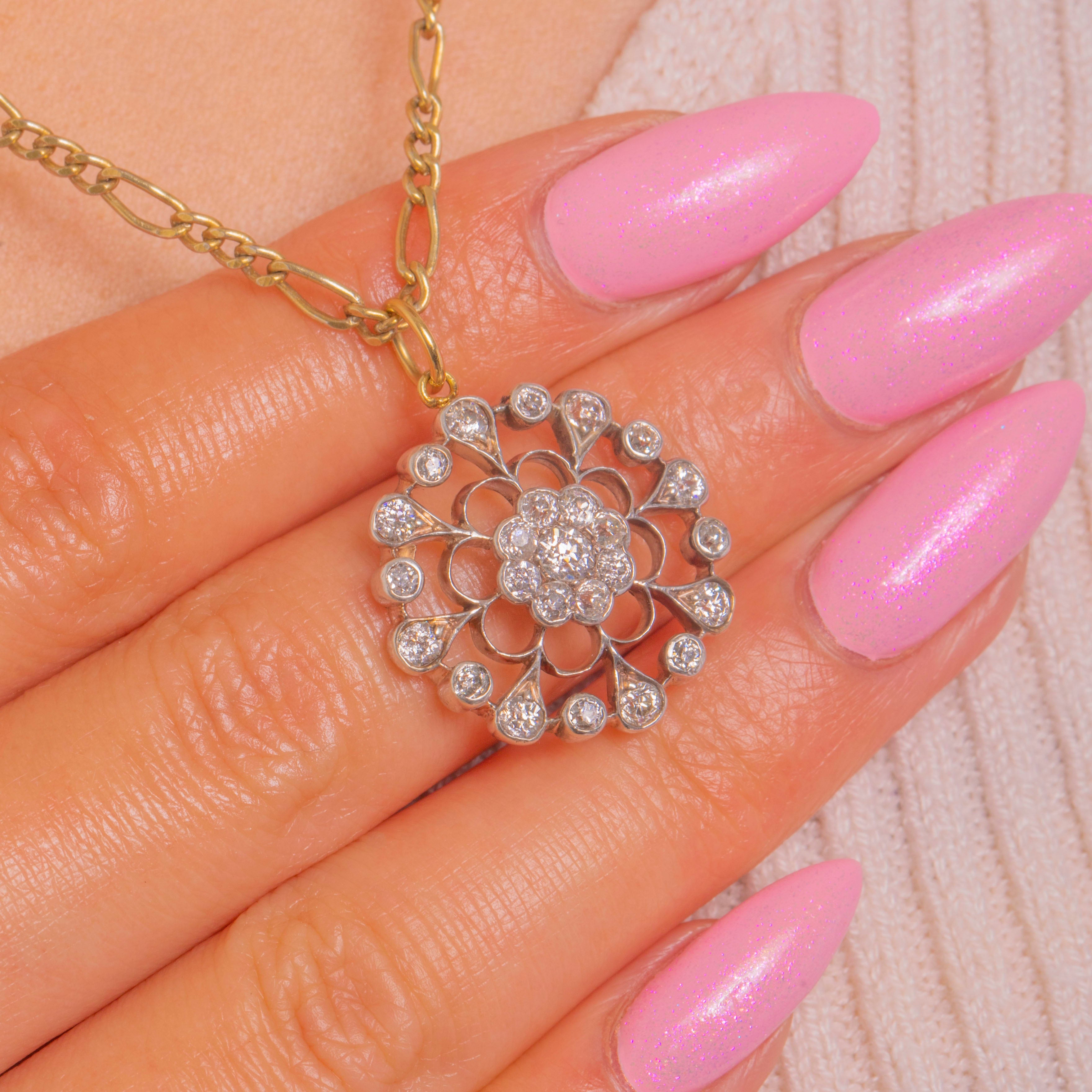 Brimming with Victorian romance, this exquisite Diamond flower pendant is crafted in 15ct Gold with Silver settings and gleams with approximately 0.80ct of Natural Old Mine Cut Diamonds. The openwork rosette unfurls with a raised central Diamond encircled by a halo of petite stones and scalloped petal loops, creating a lace-like silhouette that dances with antique sparkle.