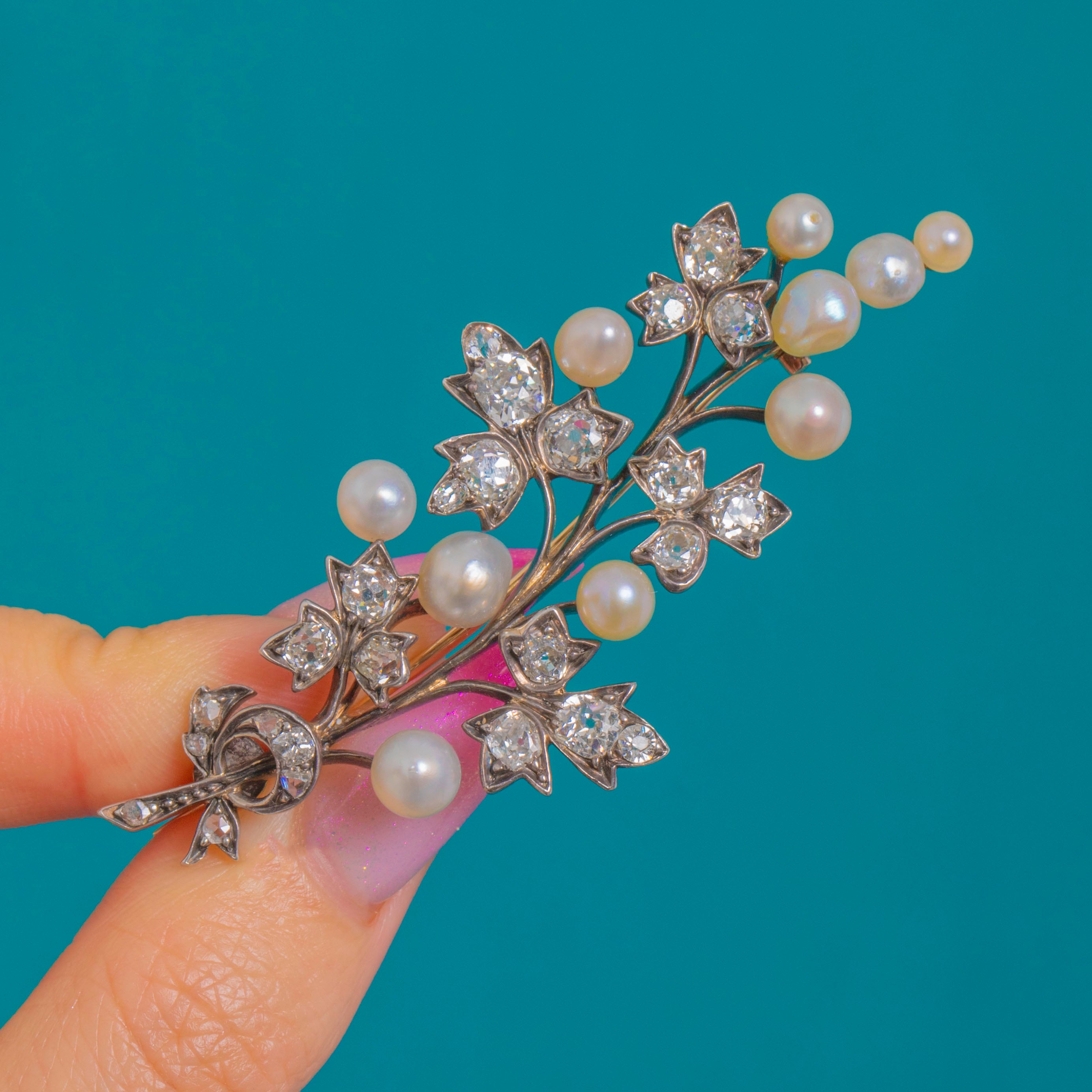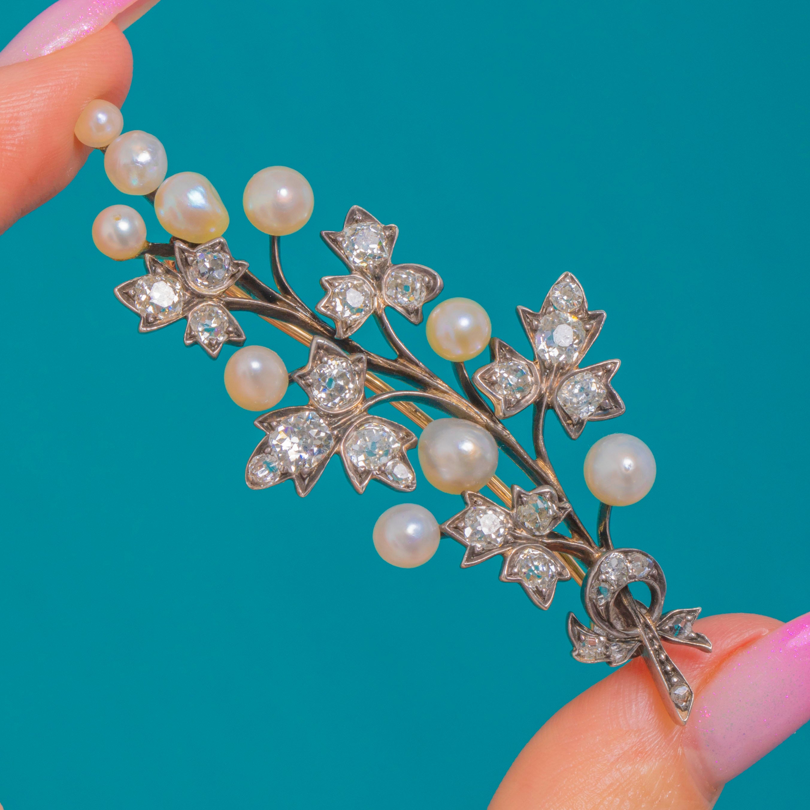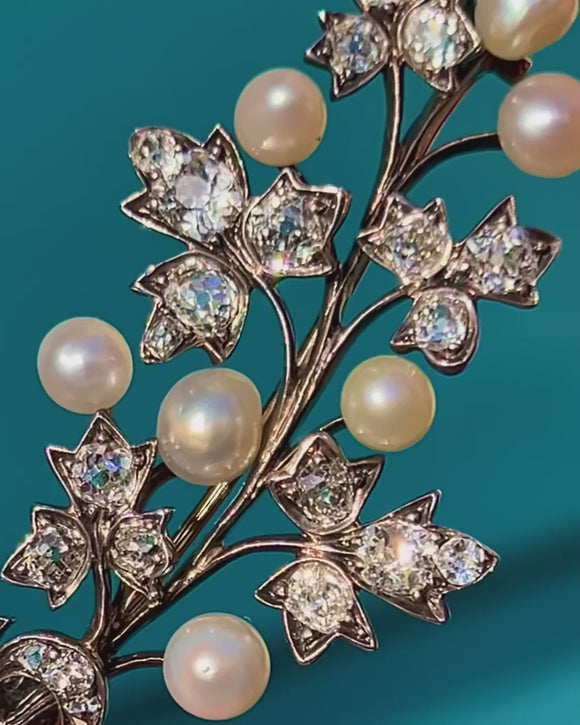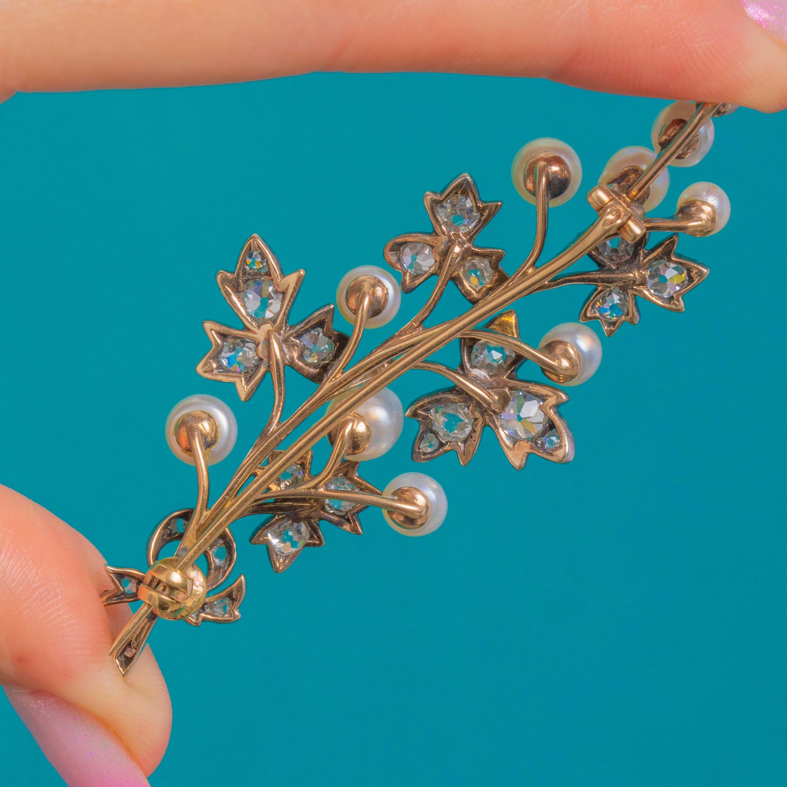 A sublime Victorian botanical spray brooch, handcrafted in rich 15ct Gold with gleaming Silver-topped settings. Lush leaves sparkle with a constellation of Diamonds while creamy Natural Pearls cluster like dewy berries along graceful, slender stems. The chic Silver-over-Gold palette feels airy and luminous, enhancing every facet and curve.