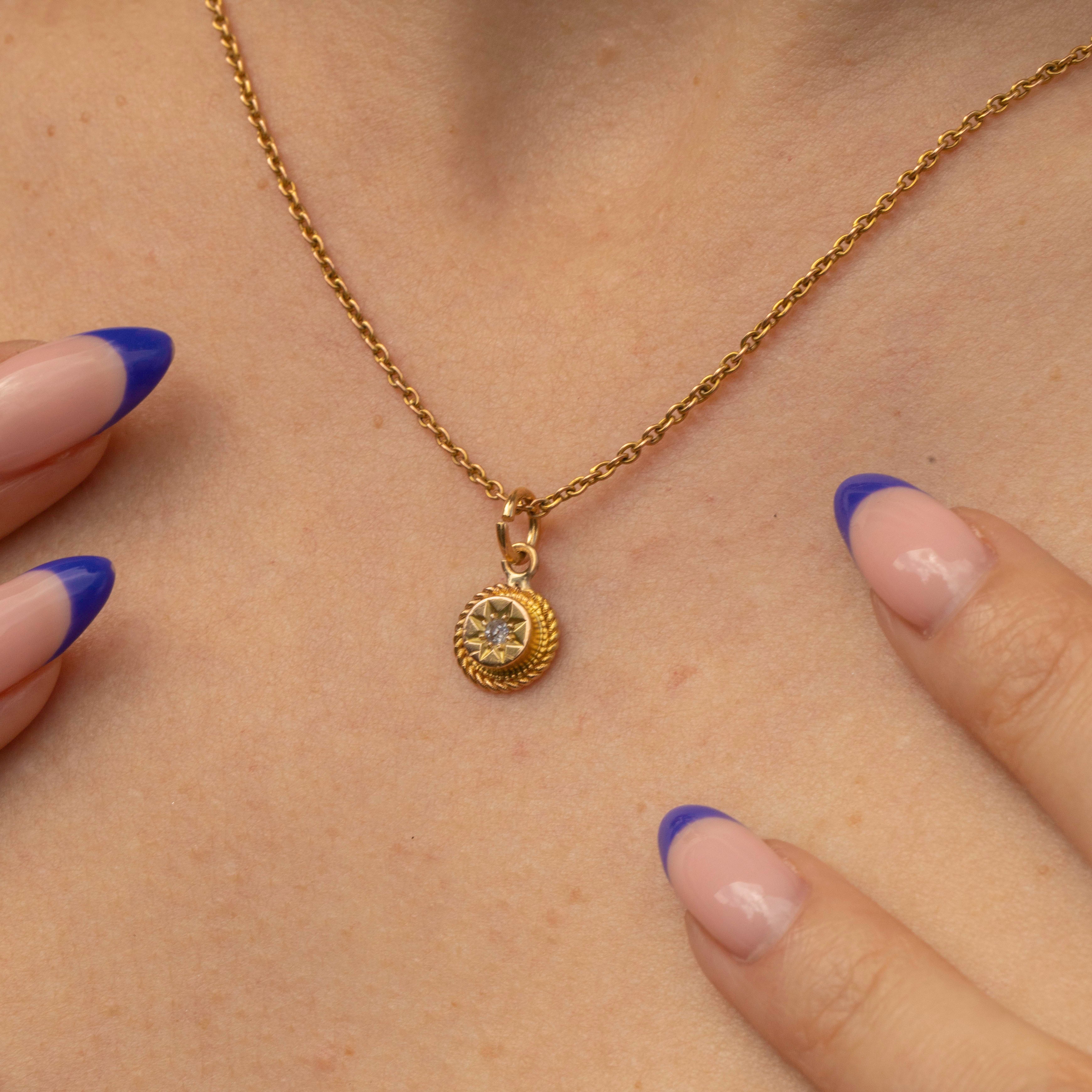EXCELLENT. This antique 15ct Gold Etruscan revival Diamond star charm is in excellent condition. This treasure has little wear to note. The Diamond is secure in its setting and sparkles beautifully. The charm has a decorative rope border and a solid 18ct Gold jump ring so you can wear this piece with confidence! What was once likely a stick pin, this treasure has been beautifully converted into a highly wearable charm that you can enjoy on a daily basis.