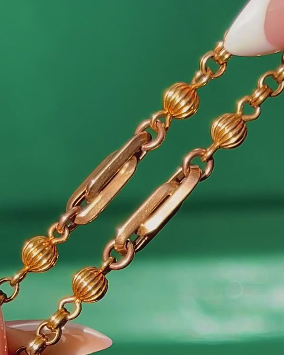 This magnificent Antique chain is crafted in rich 15ct Gold and showcases an elegant fancy link design. The double belcher links alternate with ball and fetter forms, giving the chain beautiful rhythm and texture as it drapes. At an impressive 63" long, this chain offers endless styling options, wear it full length, doubled, or layered with other favourites.