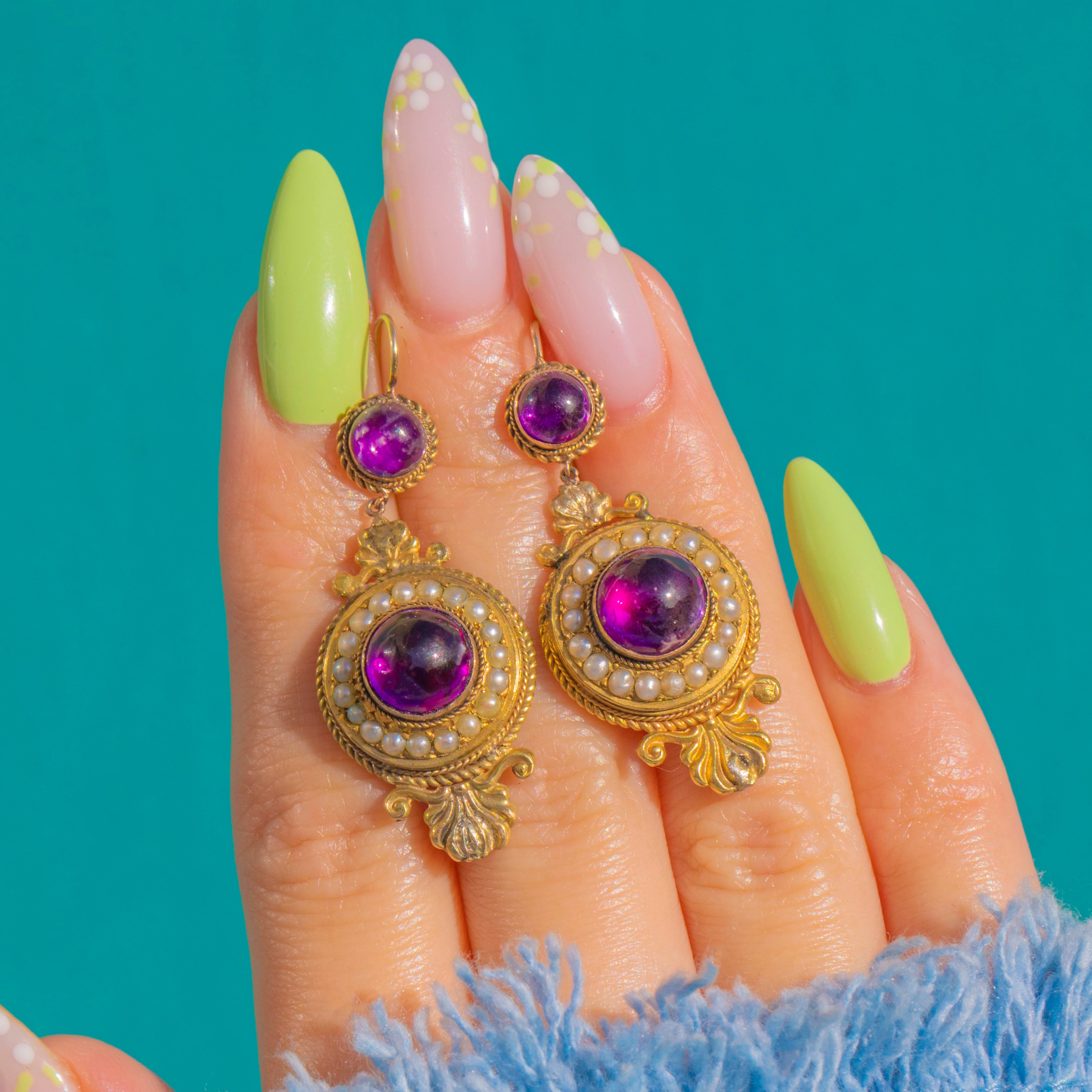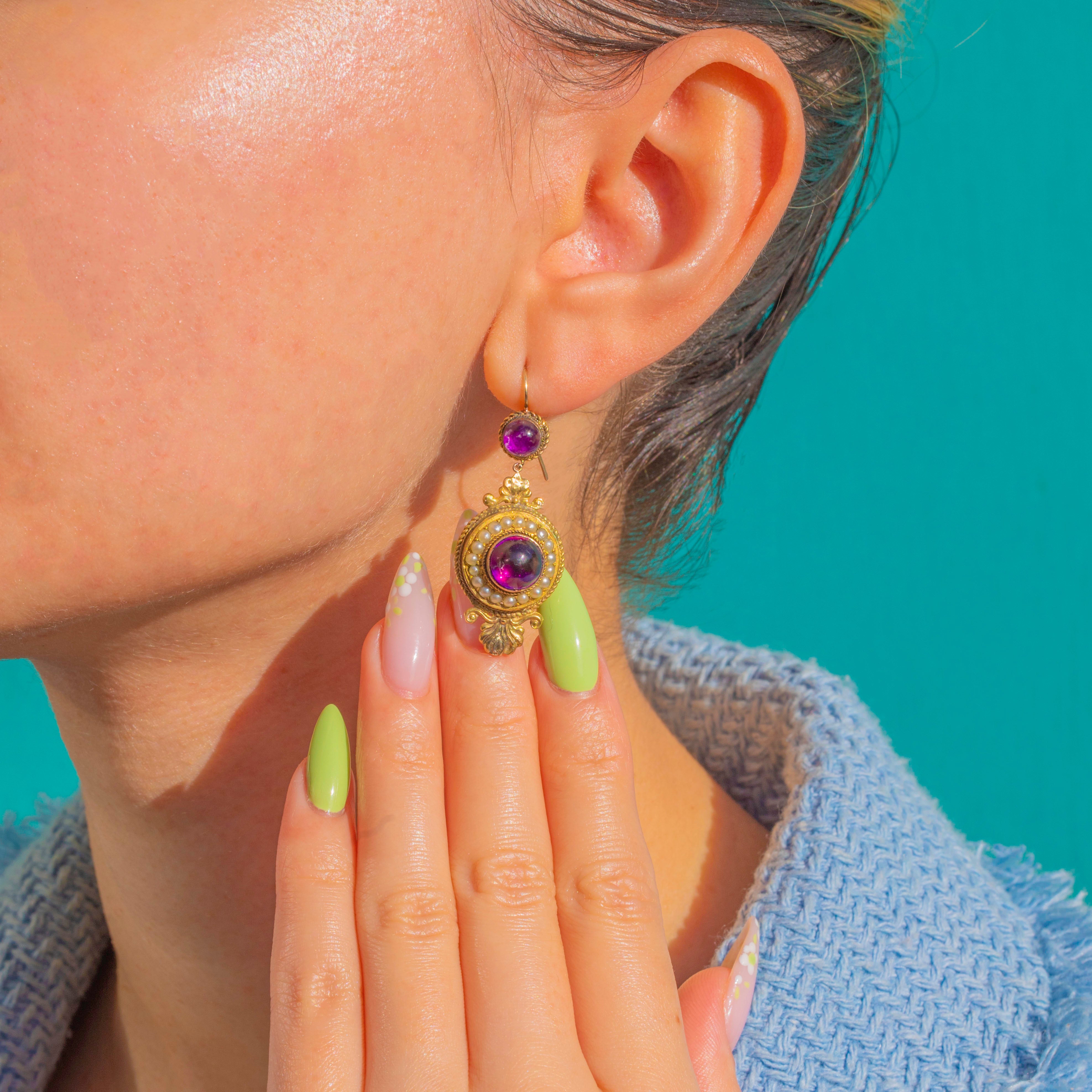 Opulent and romantic, these Victorian Etruscan Revival drop earrings embody the era’s love of texture and ornament. Crafted in bloomed 15ct Gold, each articulated two-part drop centres a rich purple foiled Amethyst that glows with life, framed by a close halo of creamy Seed Pearls. Rope-twist bezels and foliate scroll terminals add that unmistakable 19th-century flourish, while the articulation lends a graceful, lively sway on the ear.