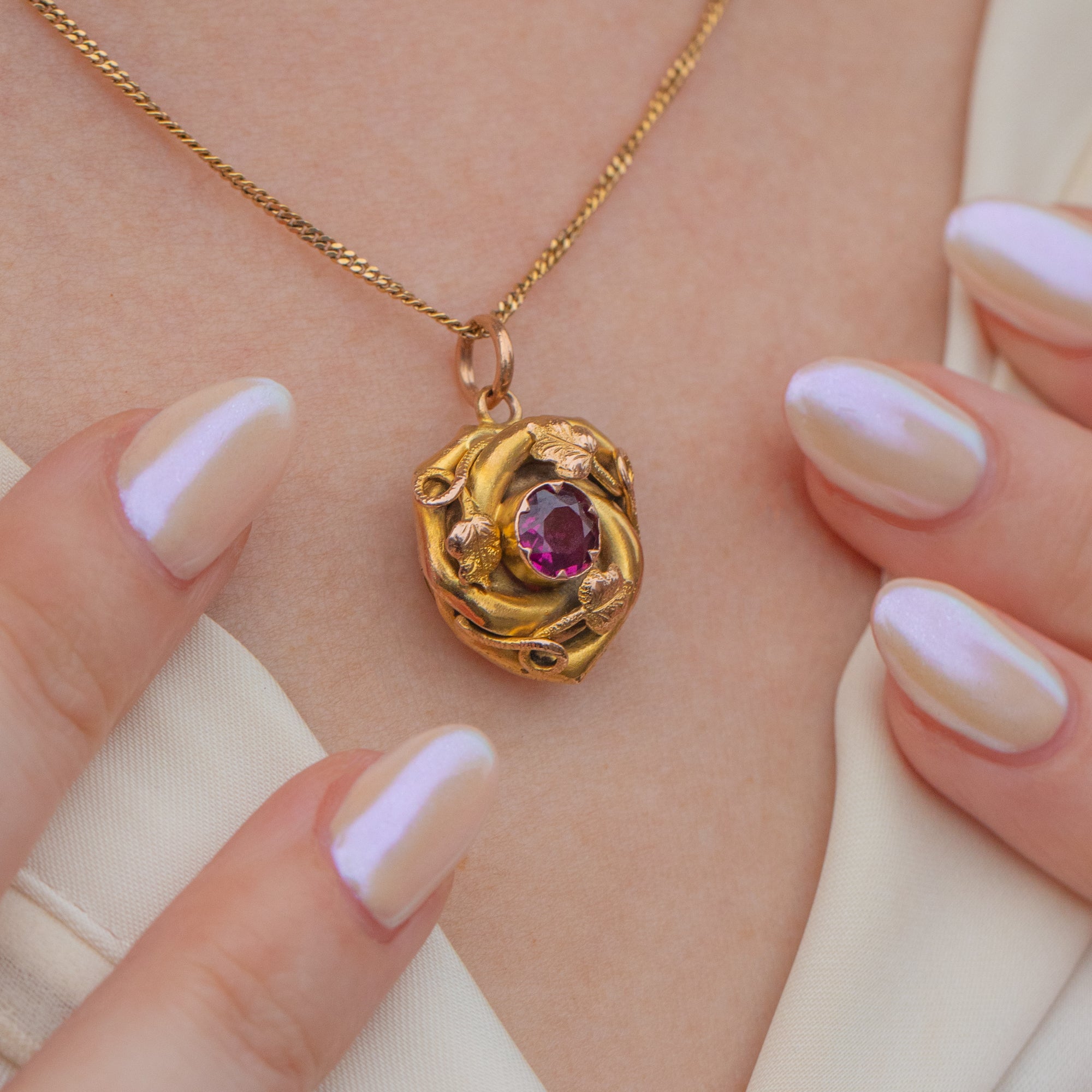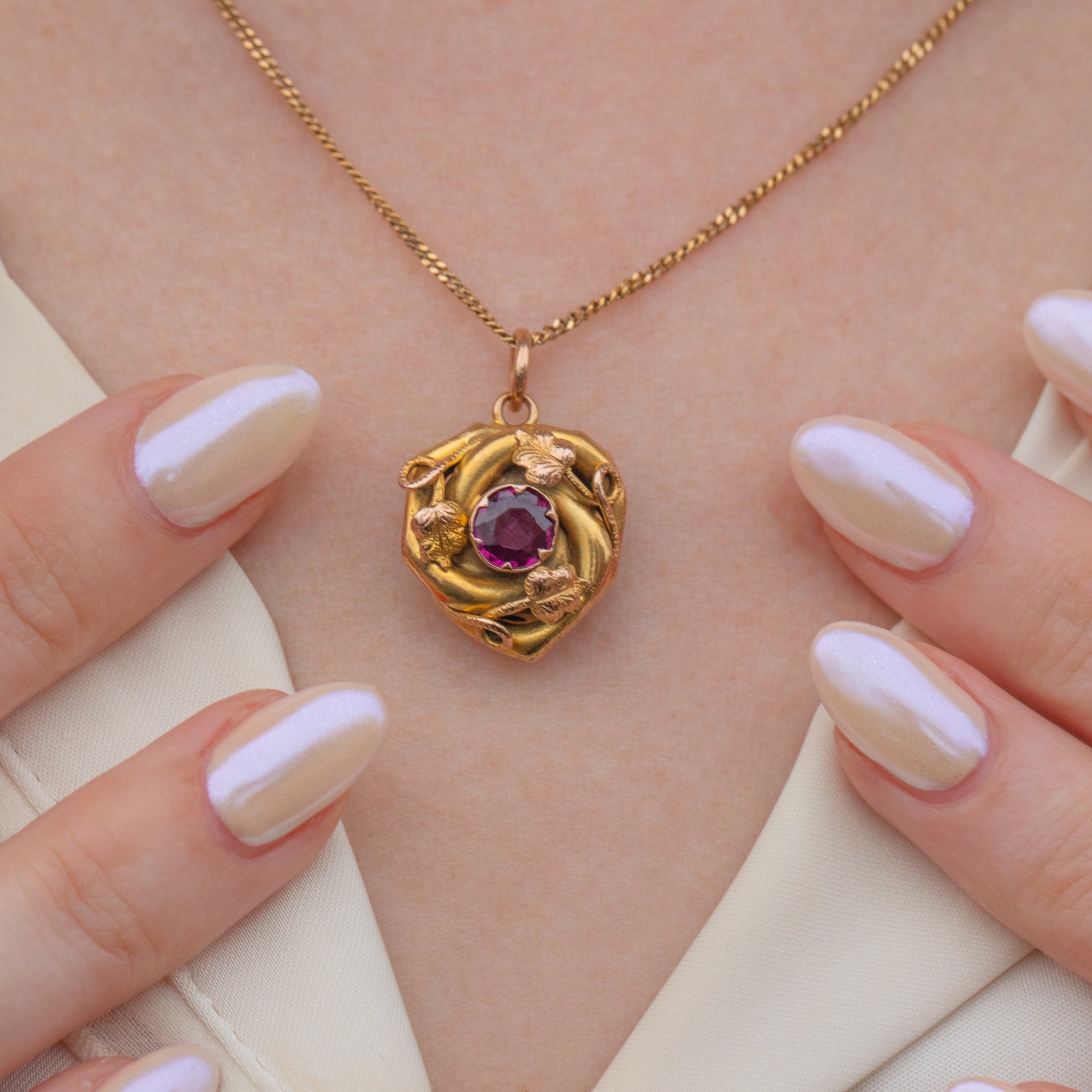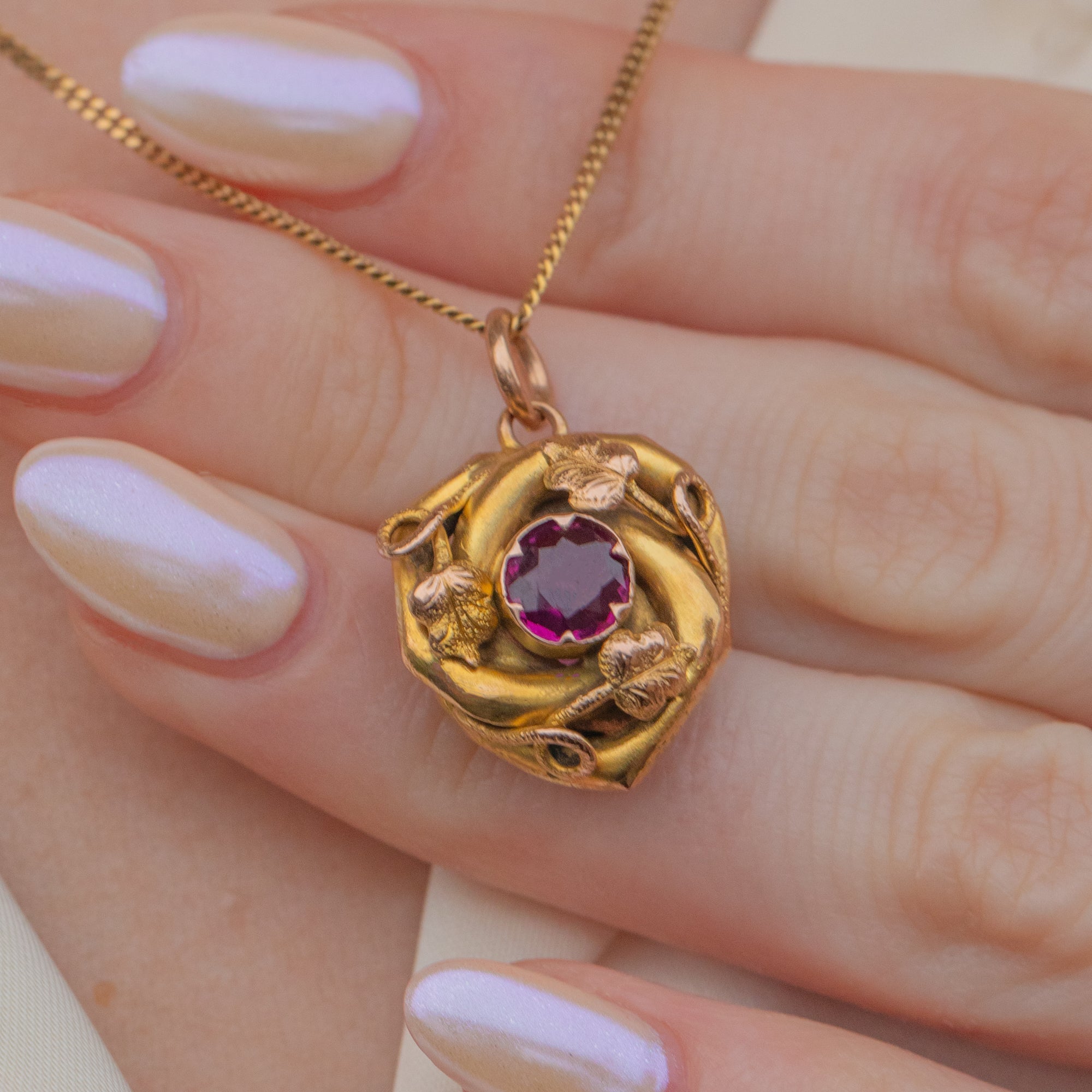 Crafted from sumptuous 15ct Gold, this antique pendant features a gorgeous faceted 2.20ct Garnet in her centre, radiating soft fuchsia tones as she catches the light. She sits within twisting tendrils and dainty leaf details, bringing an enchanting finsih to this romantic piece.