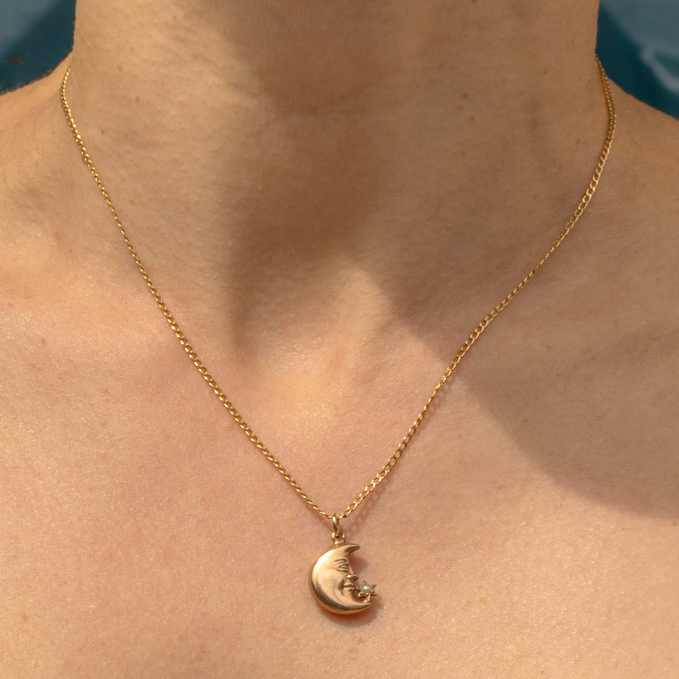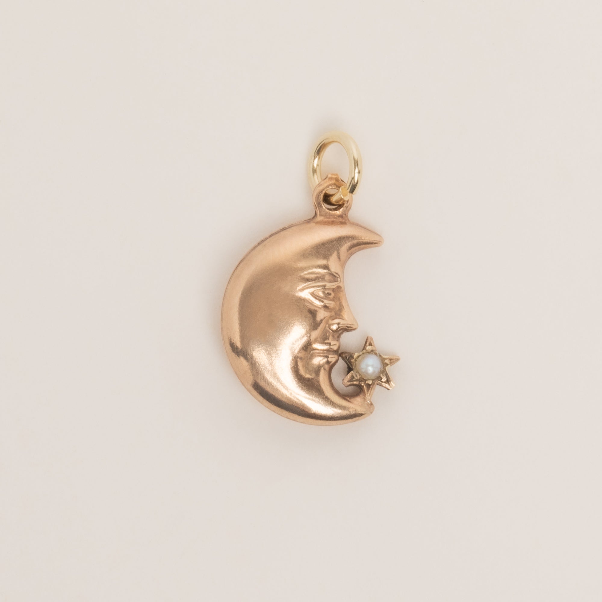EXCELLENT. This Victorian 15ct Gold man in the moon charm is in excellent condition. Her form is perfect, with the facial details crisp on both sides and the Pearl secure within the star. With a jump-ring to finish, all she needs is a dainty Gold chain to suspend her from!
