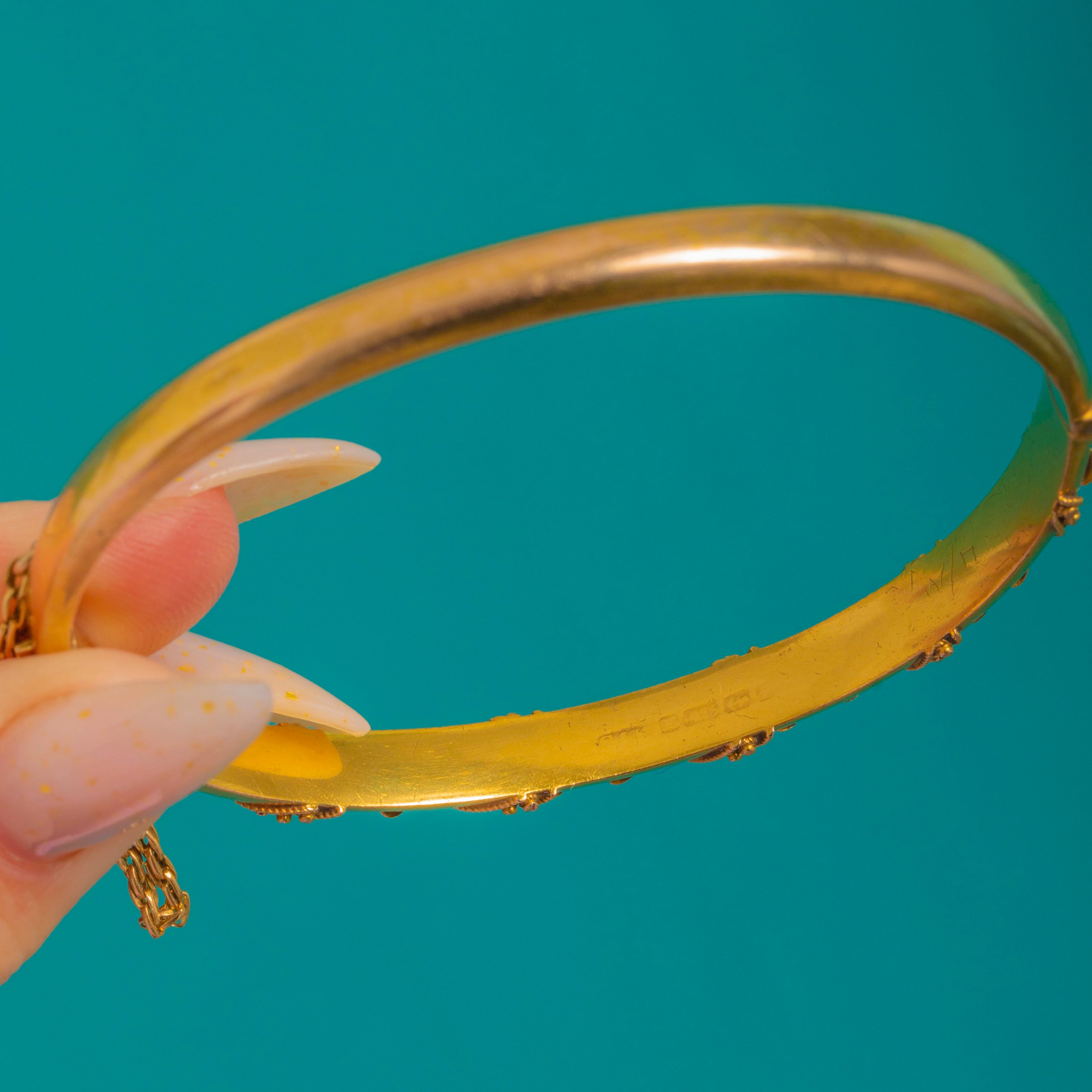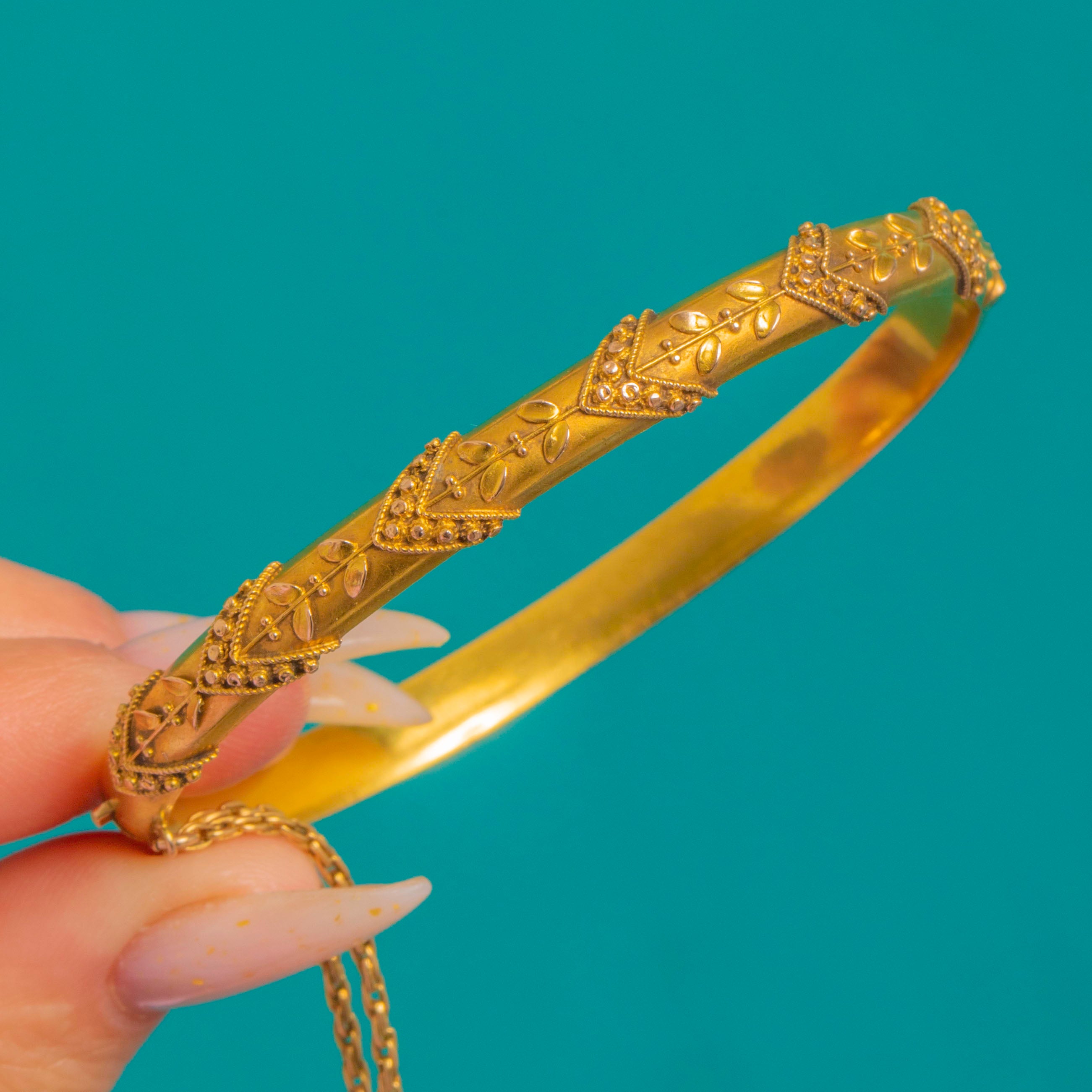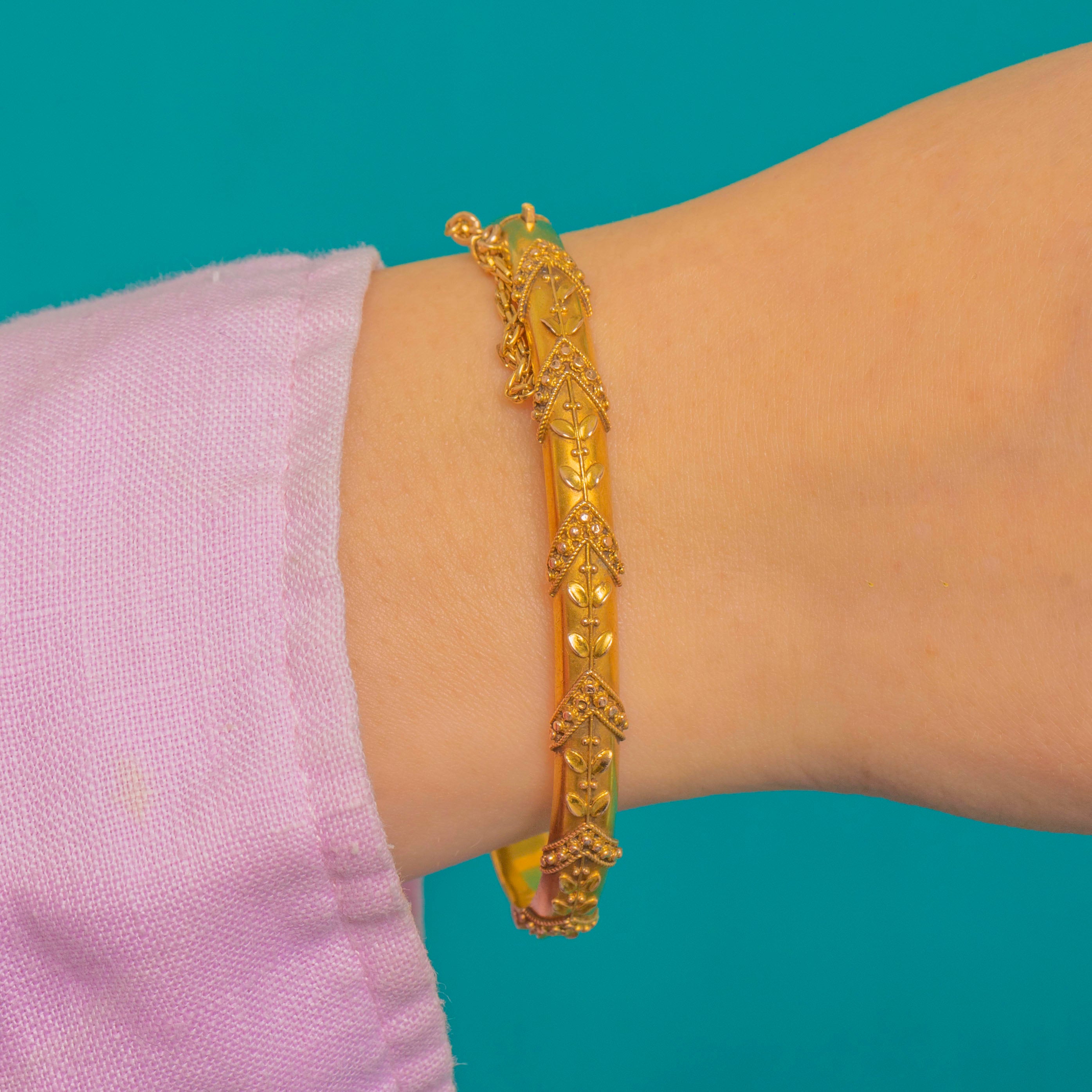A refined Victorian hinged bangle in luminous 15ct Gold, beautifully ornamented with repeating chevron panels edged in delicate bead-like granulation and centred with graceful foliate sprigs. The softly matte, “bloomed” finish lends an elegant antique glow, capturing the Etruscan Revival aesthetic with poise and finesse.