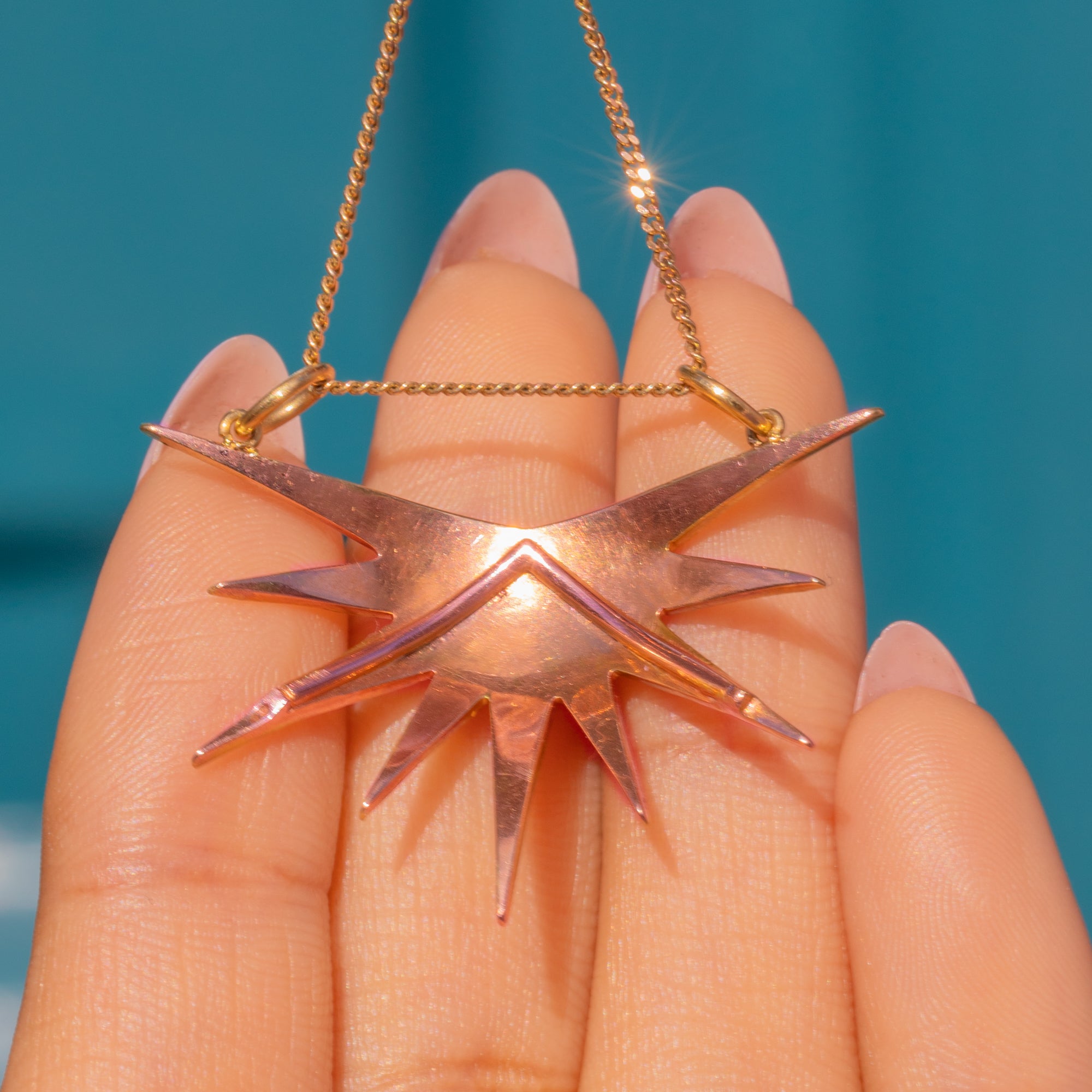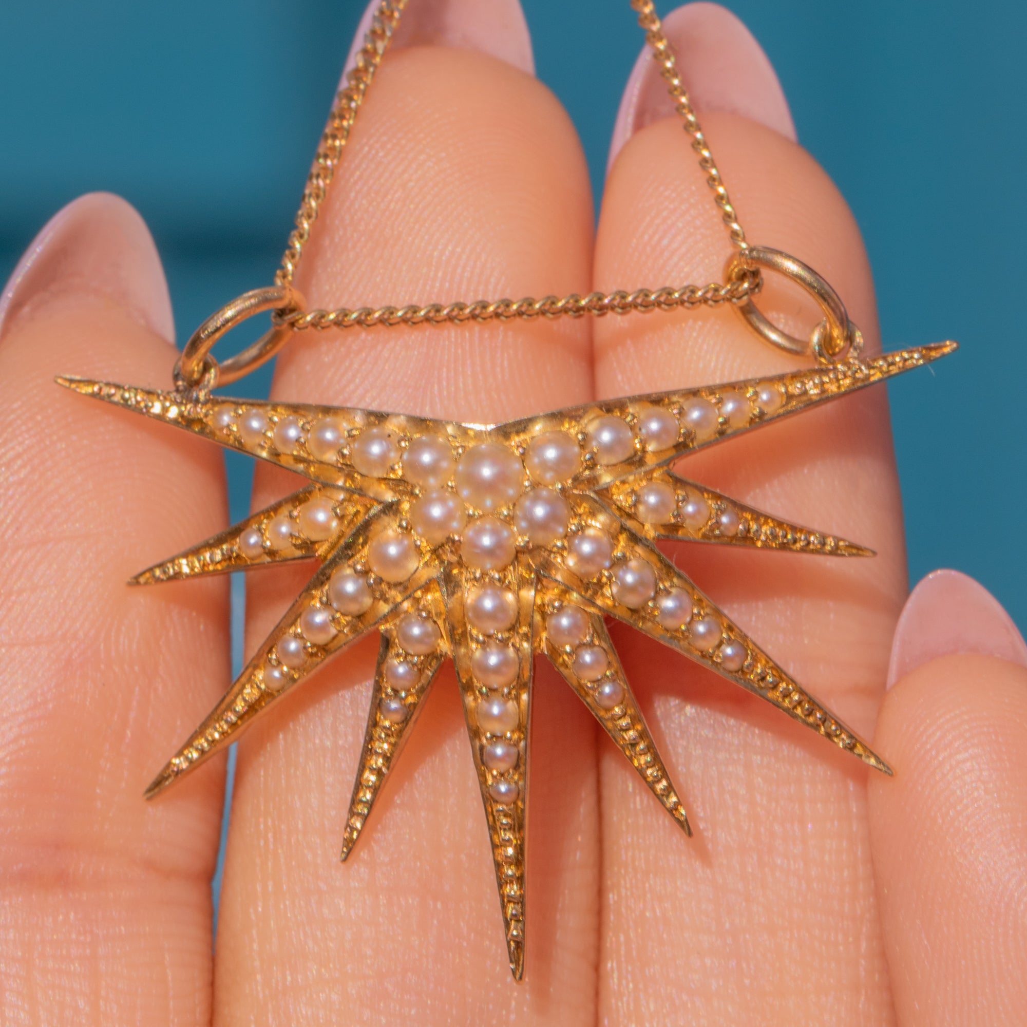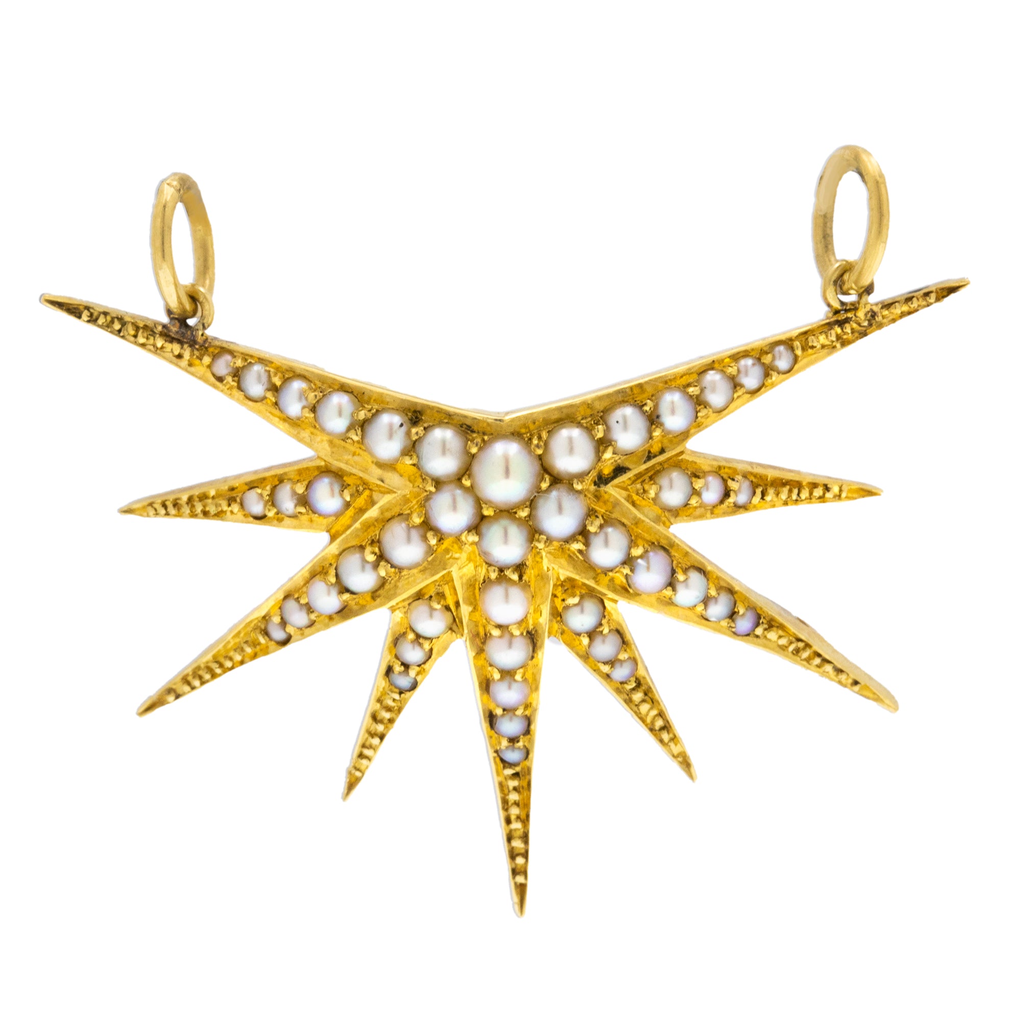 This Victorian 15ct Gold Pearl starburst pendant will bring an instant touch of celestial allure to your outfit! Crafted from brightly saturated 15ct Gold and inlaid with rows of iridescent creamy Pearls, this antique pendant exudes luxury.