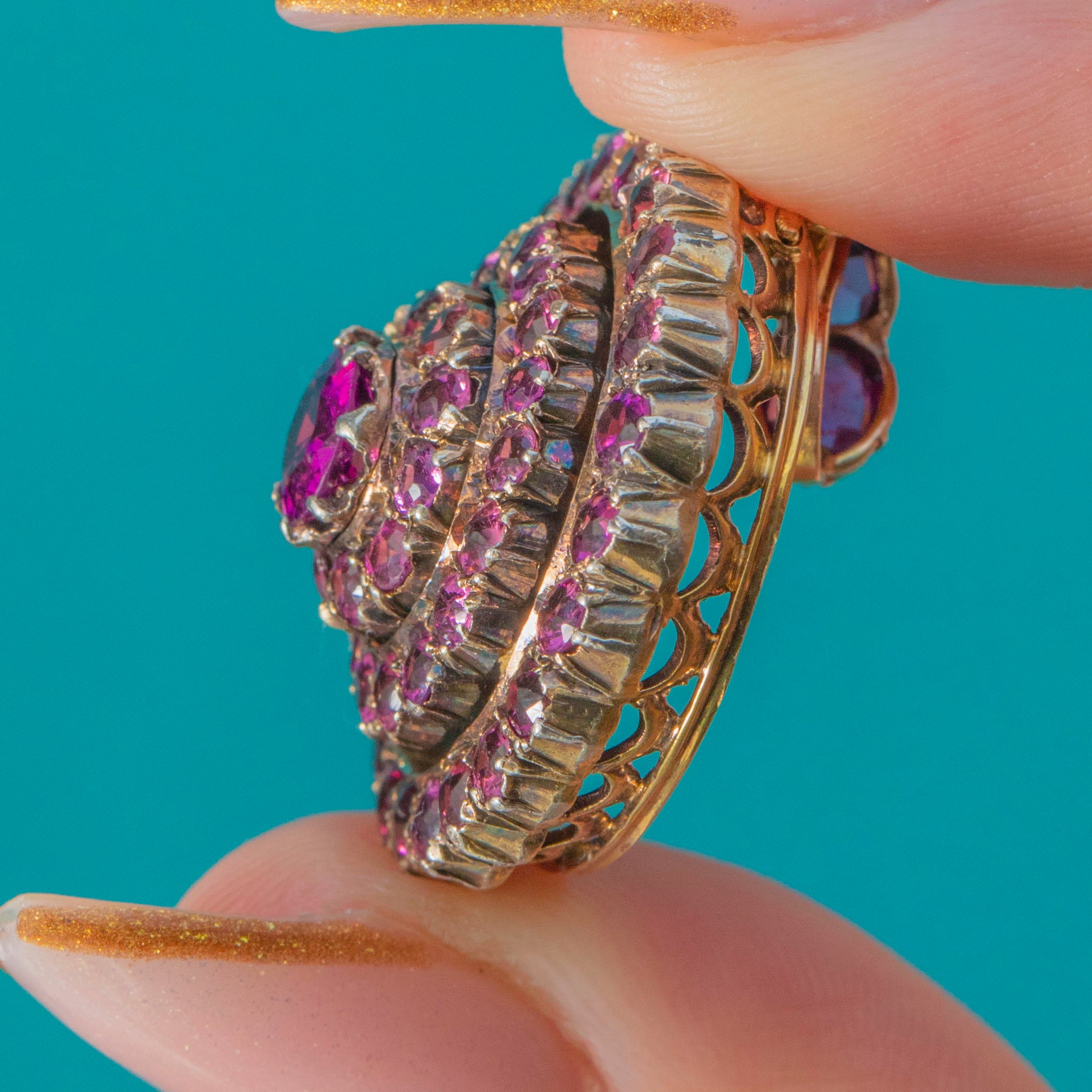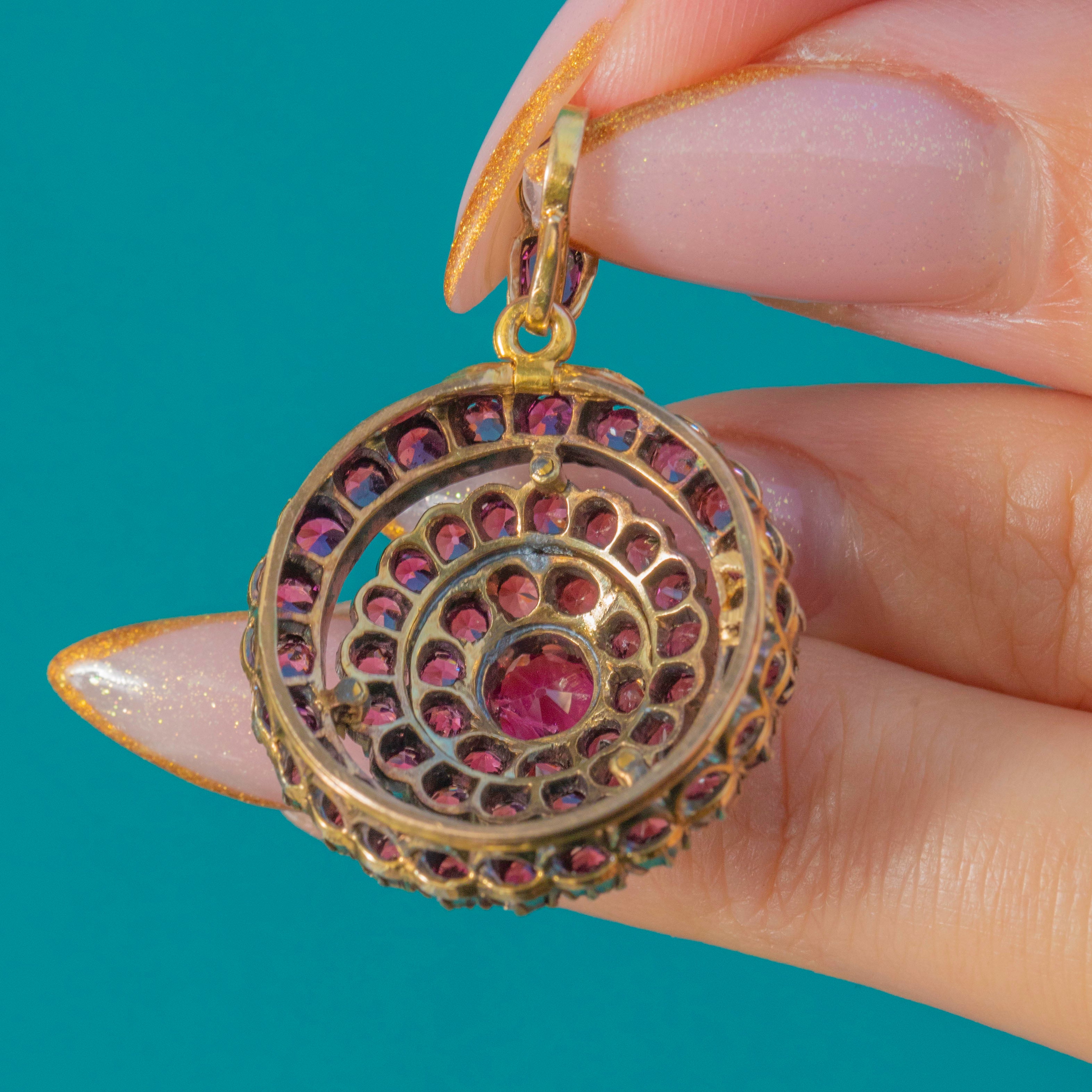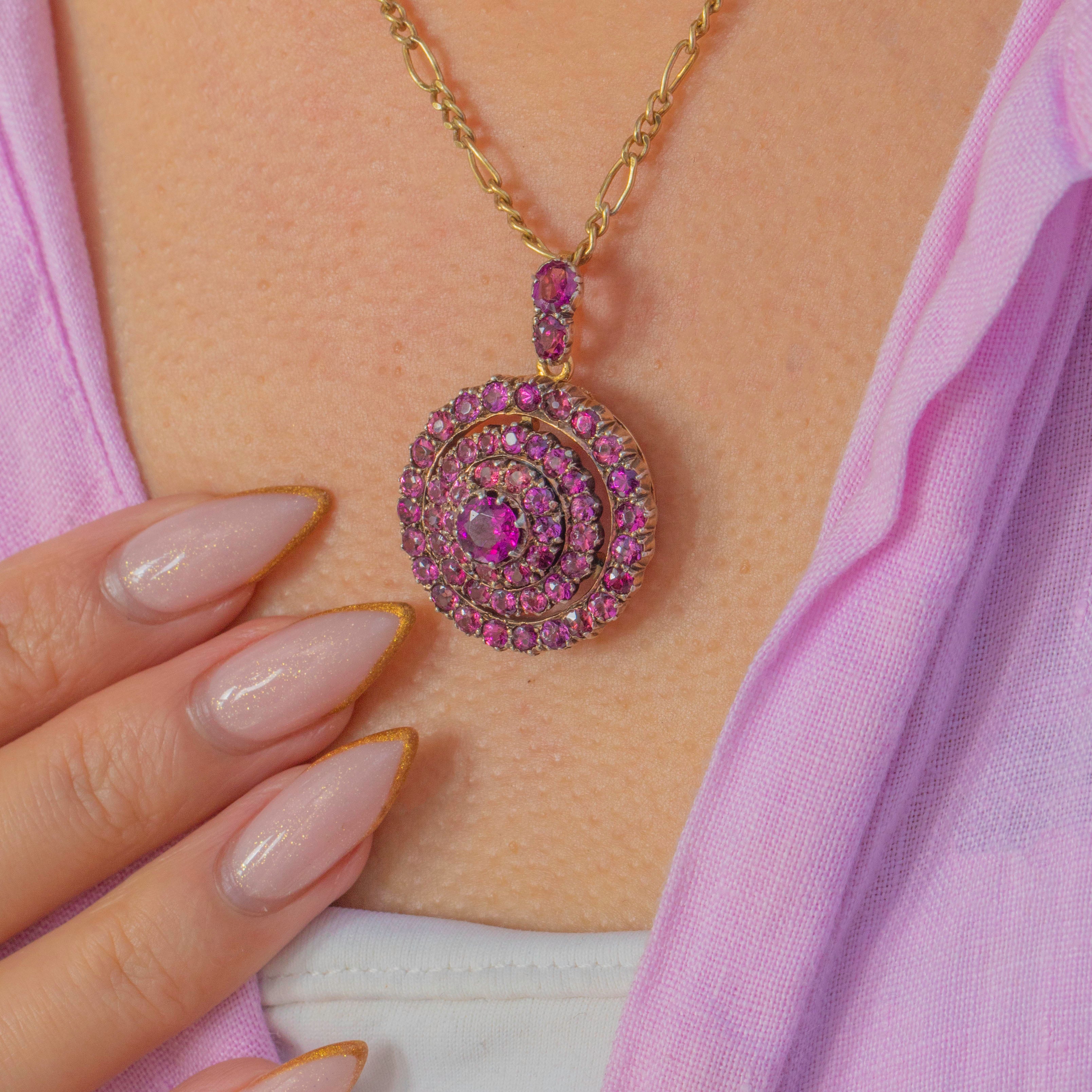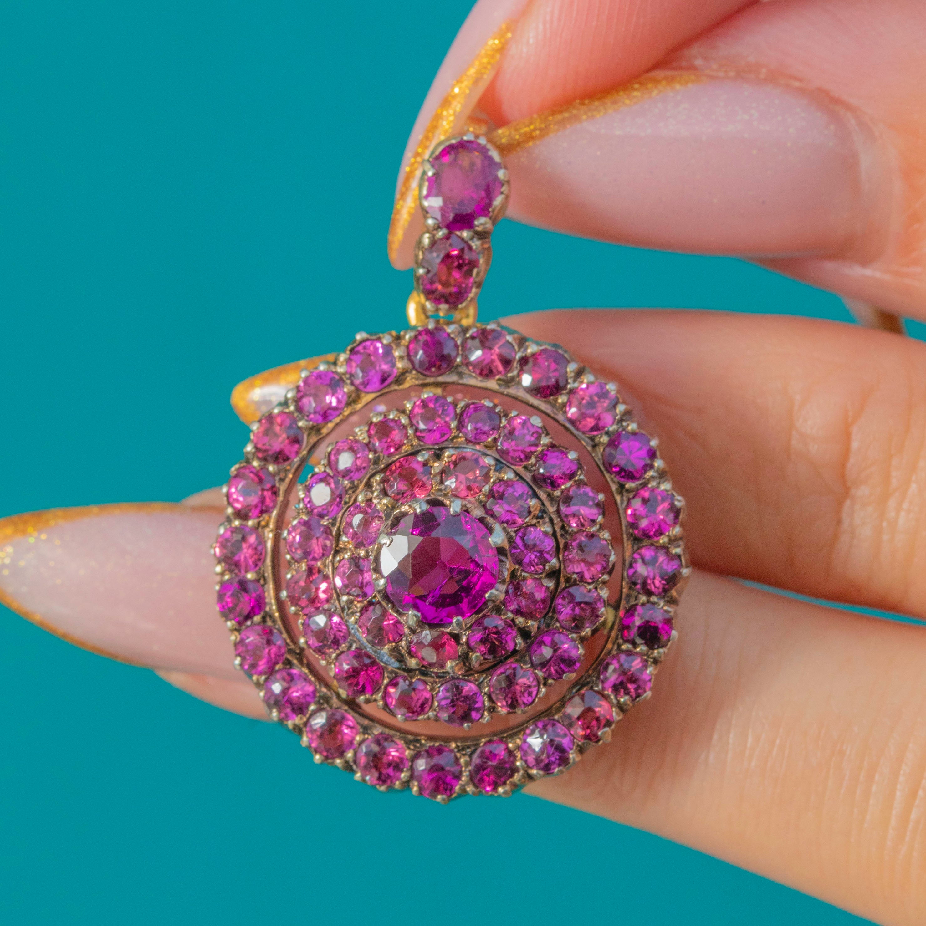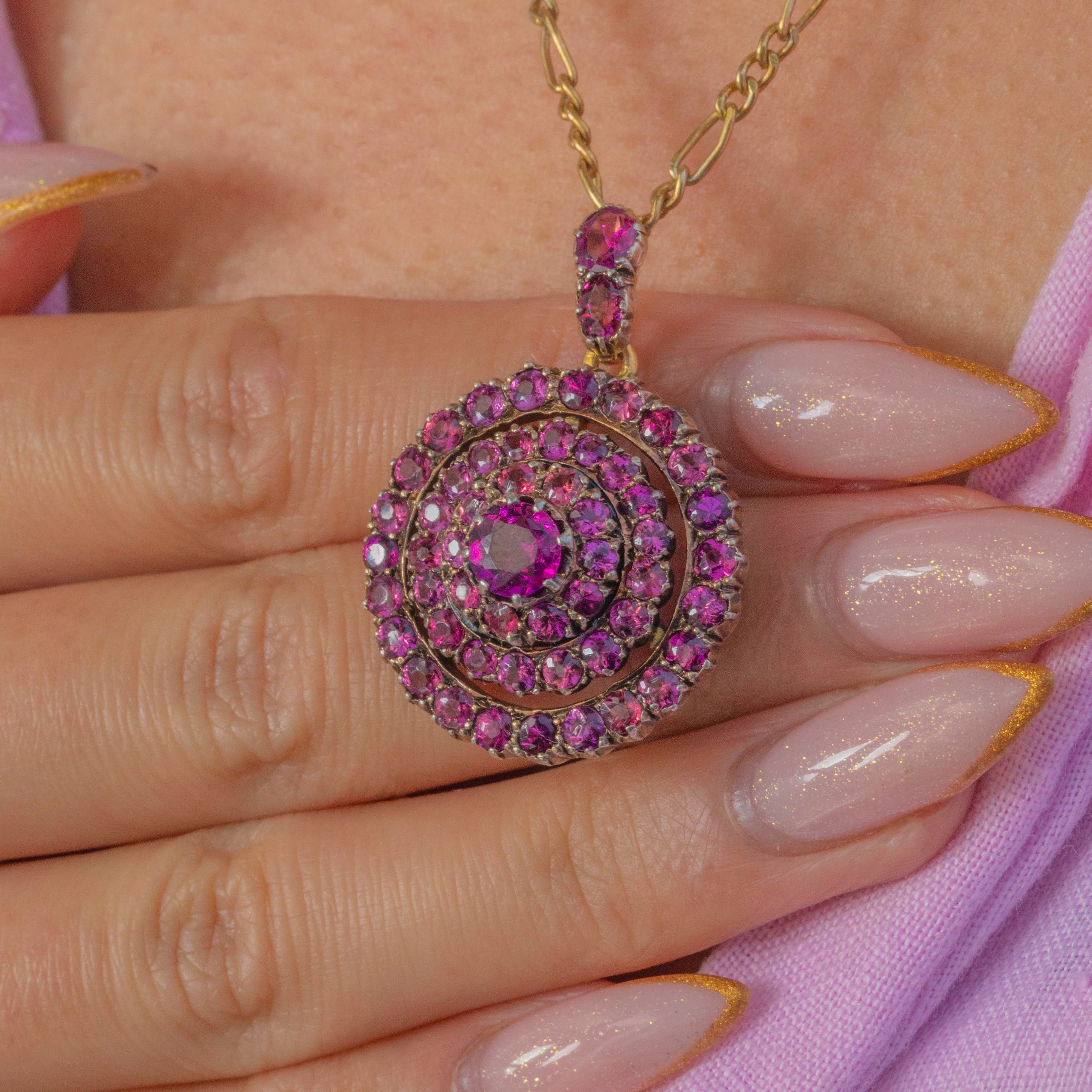 This striking Victorian target pendant, crafted in 15ct Gold with contrasting white Gold settings, is set with vibrant pink Tourmalines arranged in a beautiful circular formation. The saturated colour and crisp symmetry make it a wonderfully eye-catching mid-19th-century jewel.