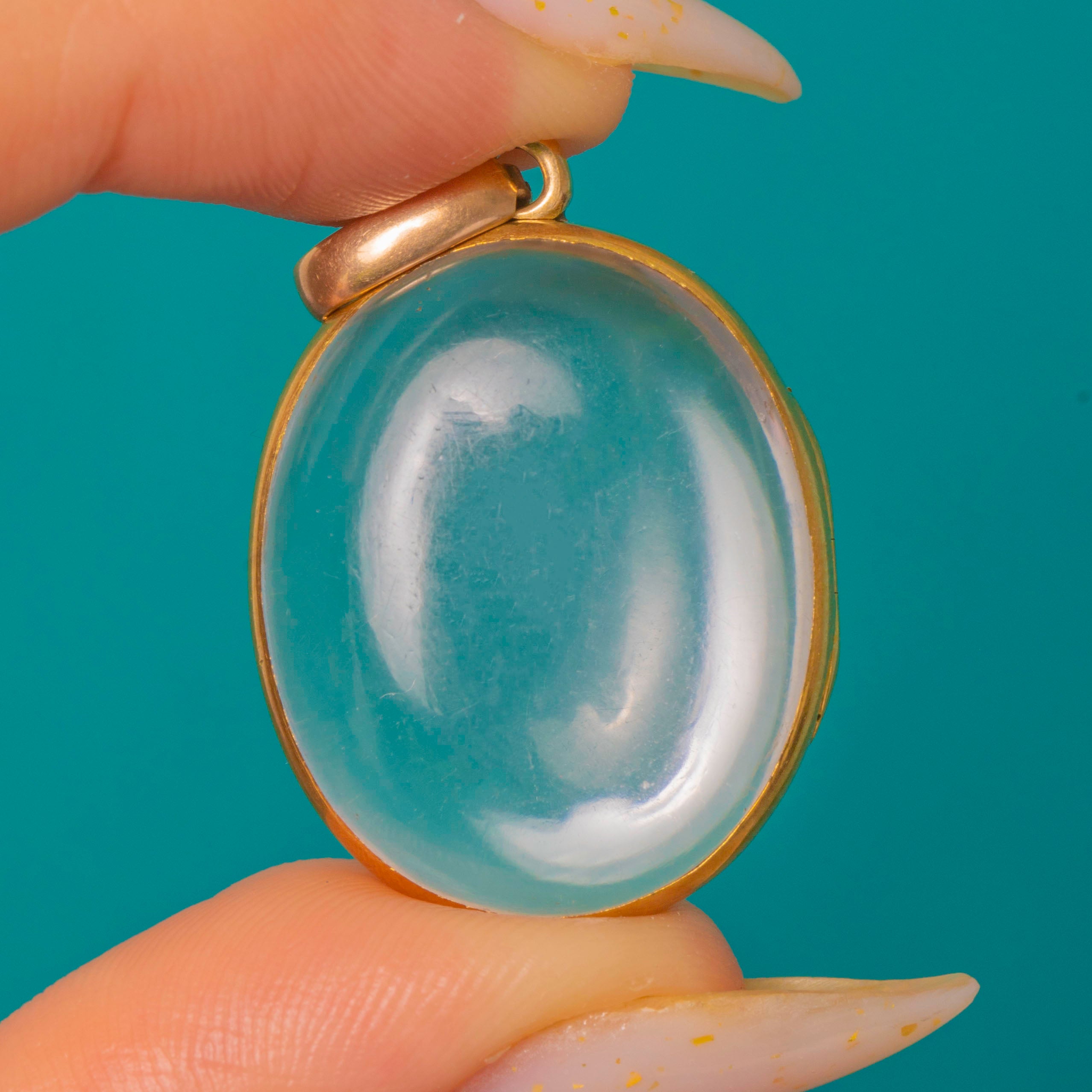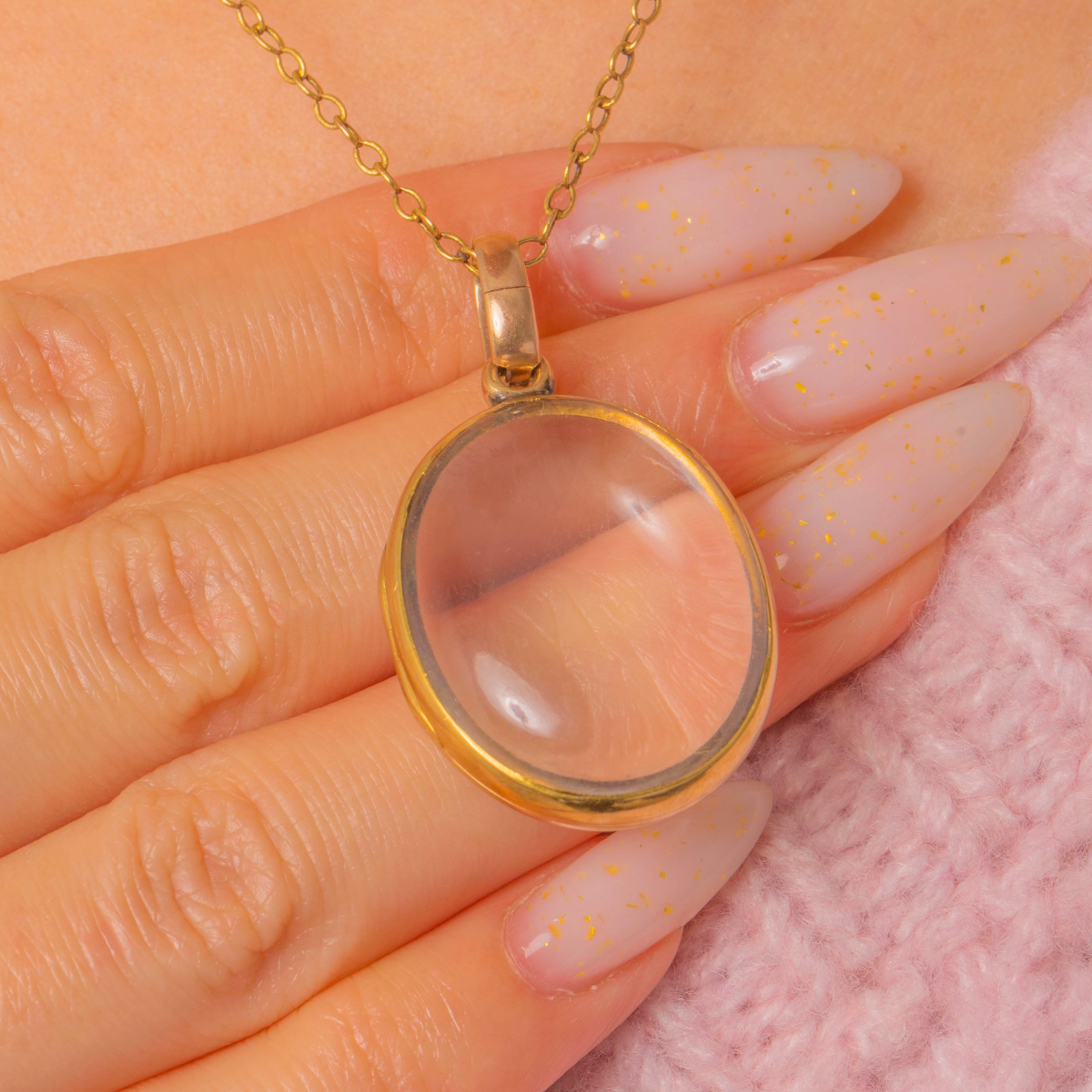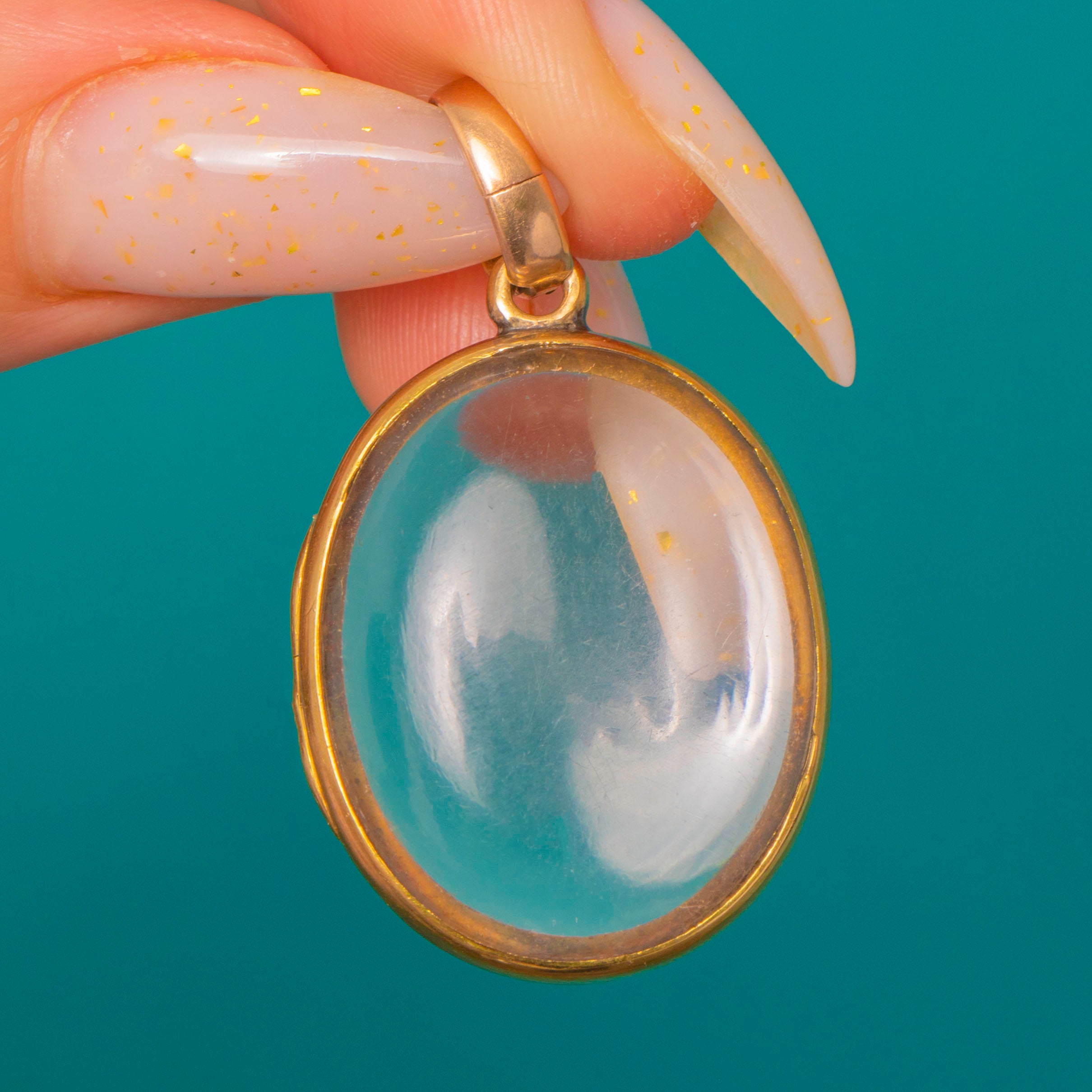 A compelling Victorian "pools of light" locket, the design centred on a high‑domed Rock crystal cabochon set into a narrow closed bezel of 15ct Gold.