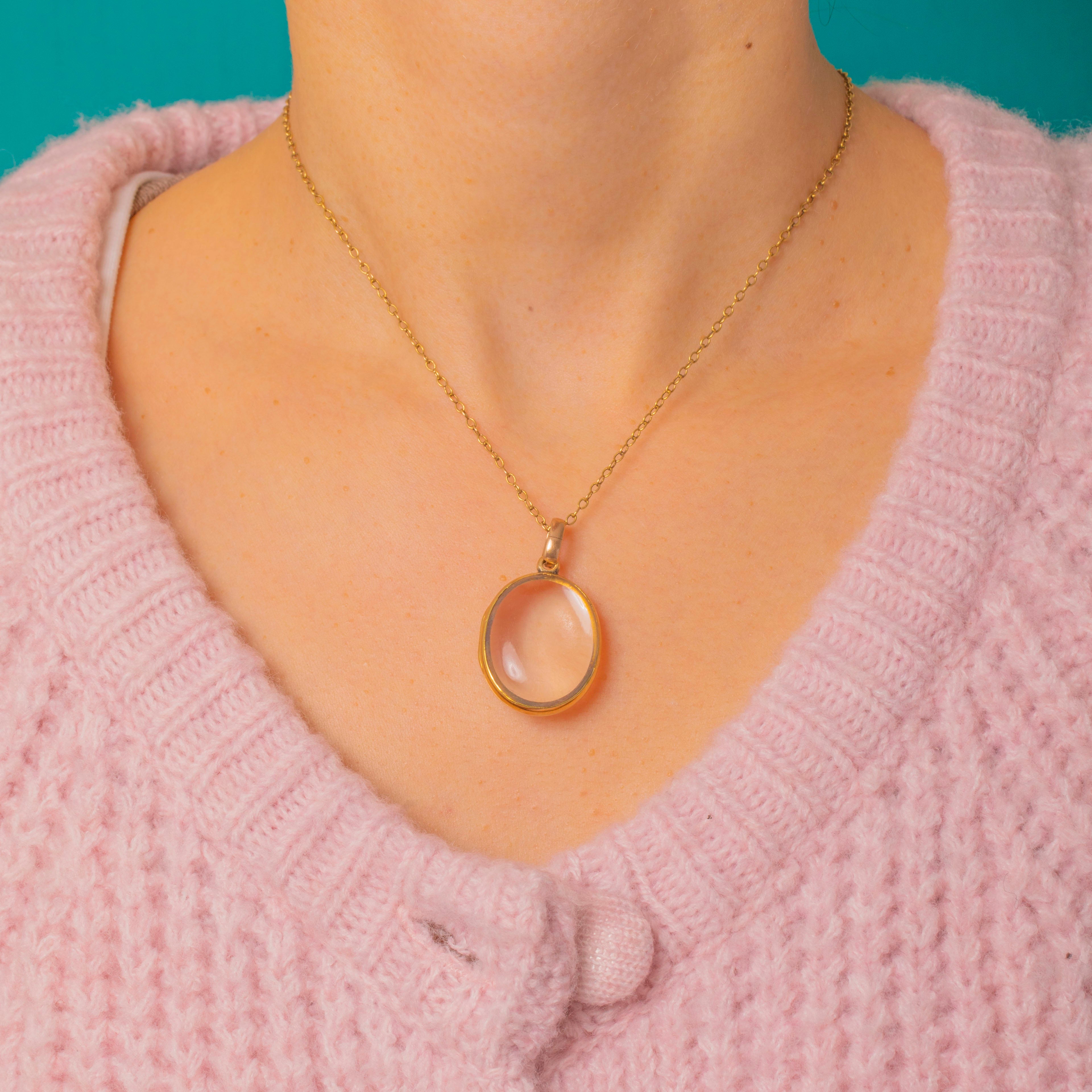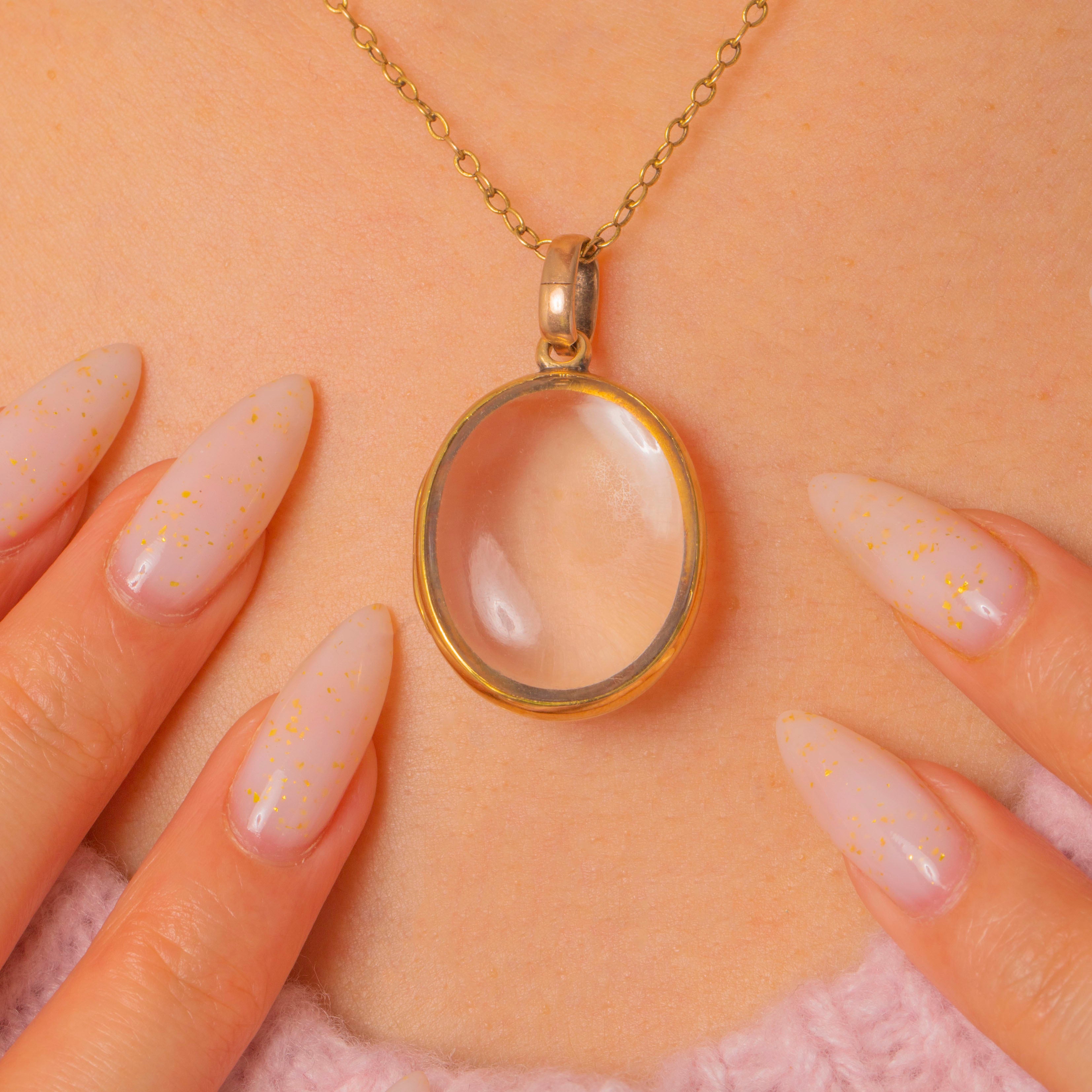 EXCELLENT: The Rock crystal shows light surface scratches and mild abrasion but no chips or cracks. The closed bezel, tubular bail and hinge show light scuffs, small nicks and a gentle patina; the hinge appears functional and there are no visible signs of restoration or invasive repairs.