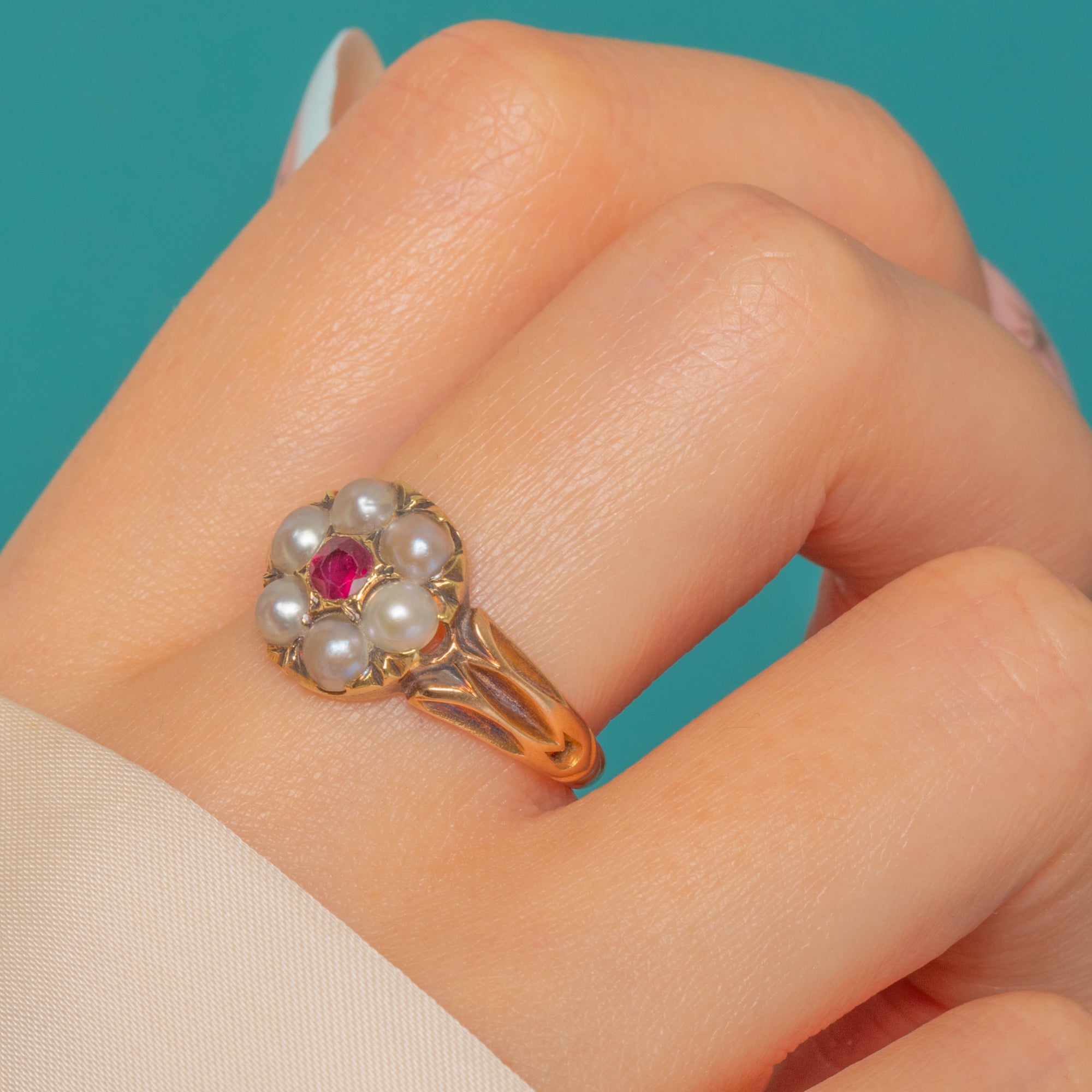 Pretty as a posy, this Victorian 15ct Gold cluster ring centres a lively round Ruby, haloed by six creamy Pearls in a classic daisy formation. The floral head is framed by a scalloped, star-edged setting and flows into elegant split, chased shoulders for a delicate, romantic silhouette.