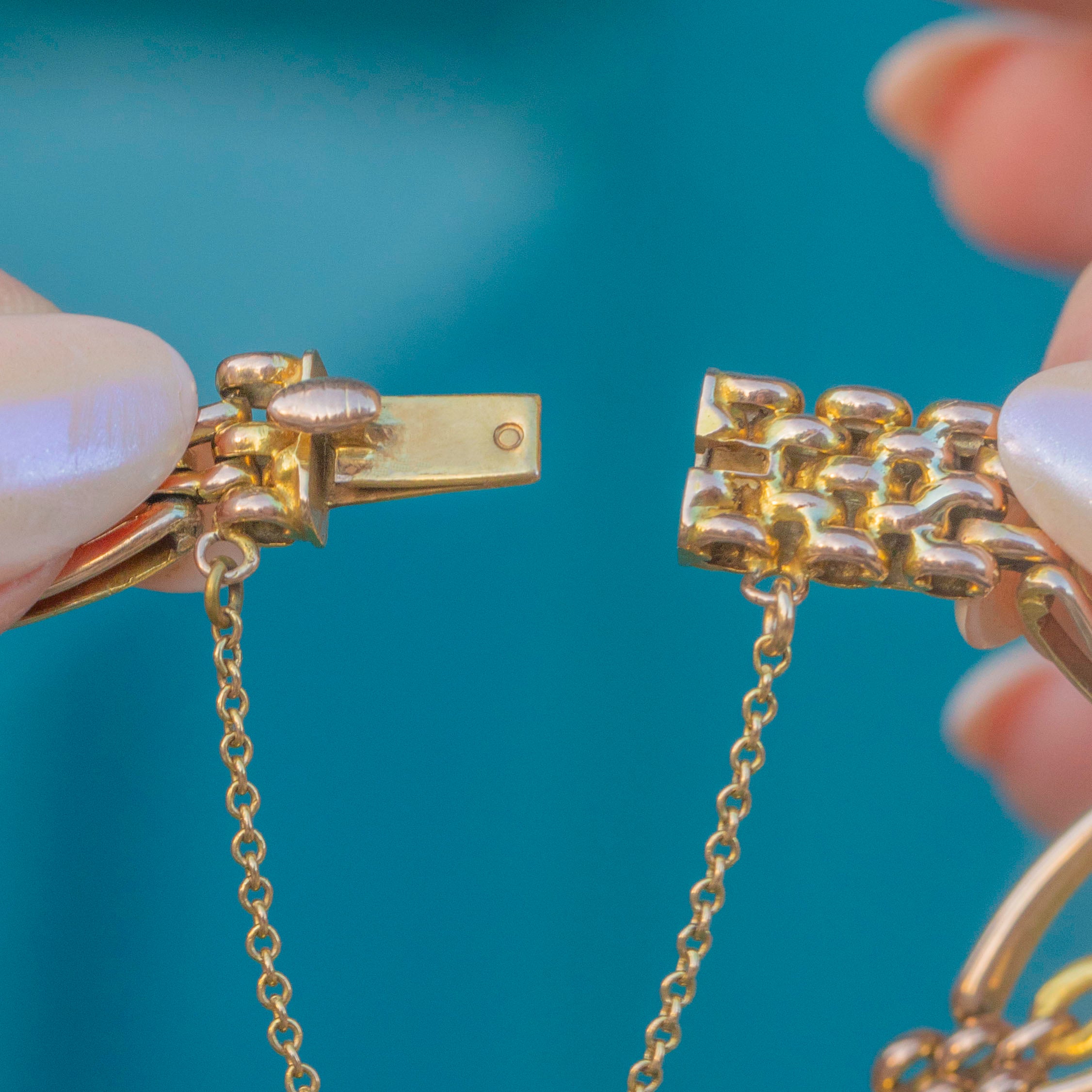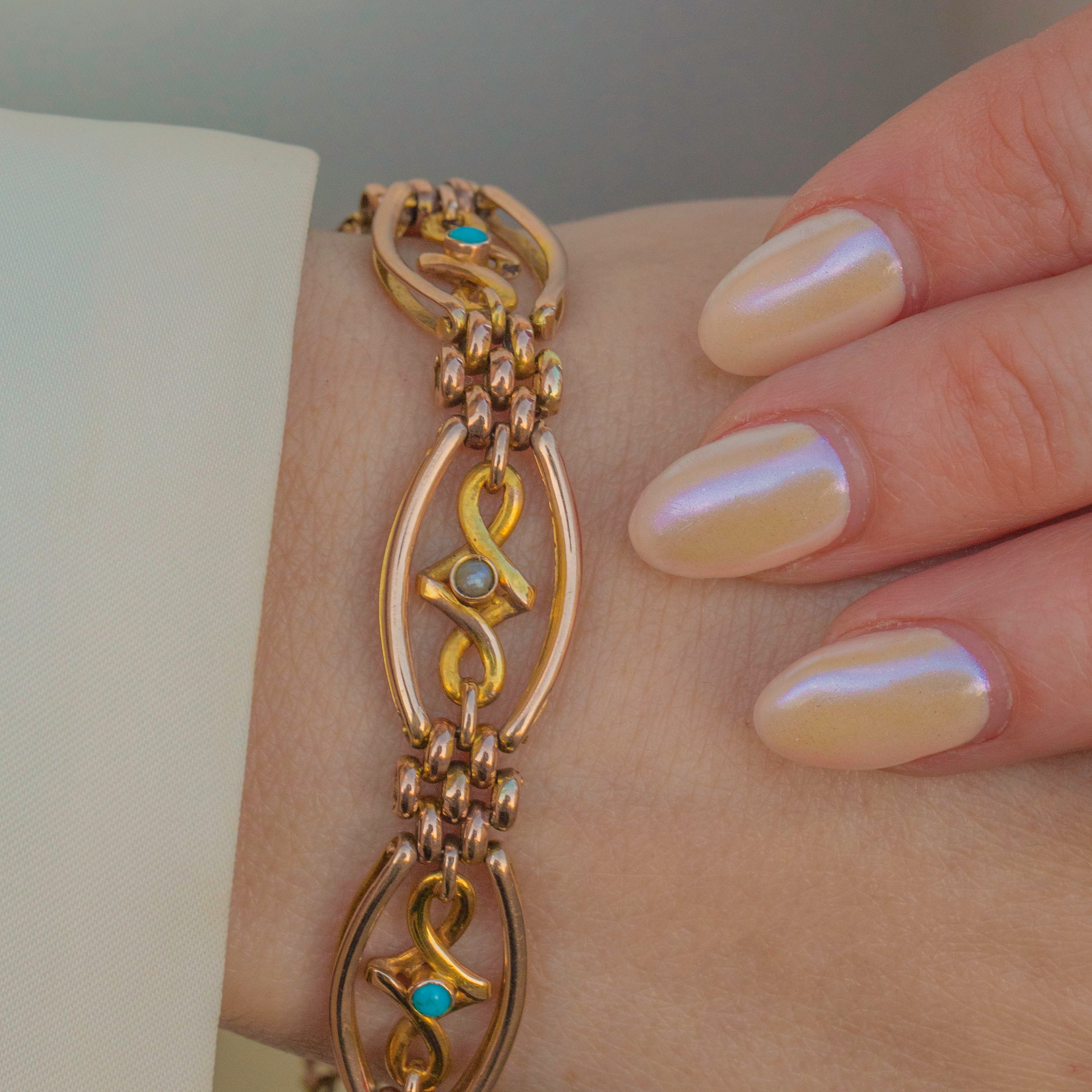 What a sumptuous Victorian 9ct Gold Turquoise Pearl gate bracelet! Crafted from the bright, buttery antique 9ct Gold, she features interlocking gate links and is embellished with gemstones throughout.